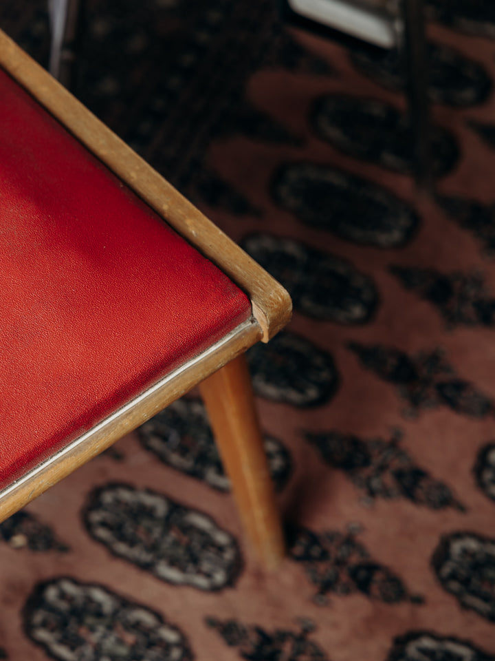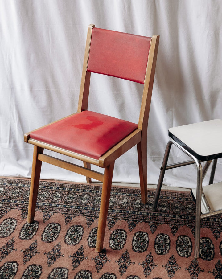 Discover our sleek wooden chair, featuring a bold red vinyl seat and backrest. Its straight lines lend a contemporary touch, while incorporating the charm of the marks of time that bear witness to its history. Ideal for adding a vintage touch to your home, this chair combines comfort and aesthetics for everyday use or special occasions. A unique piece that will blend harmoniously into your decor.