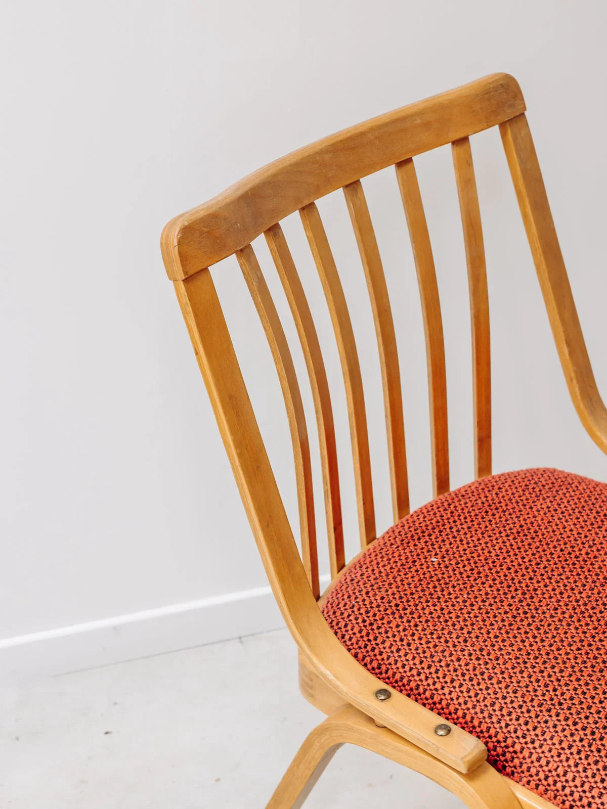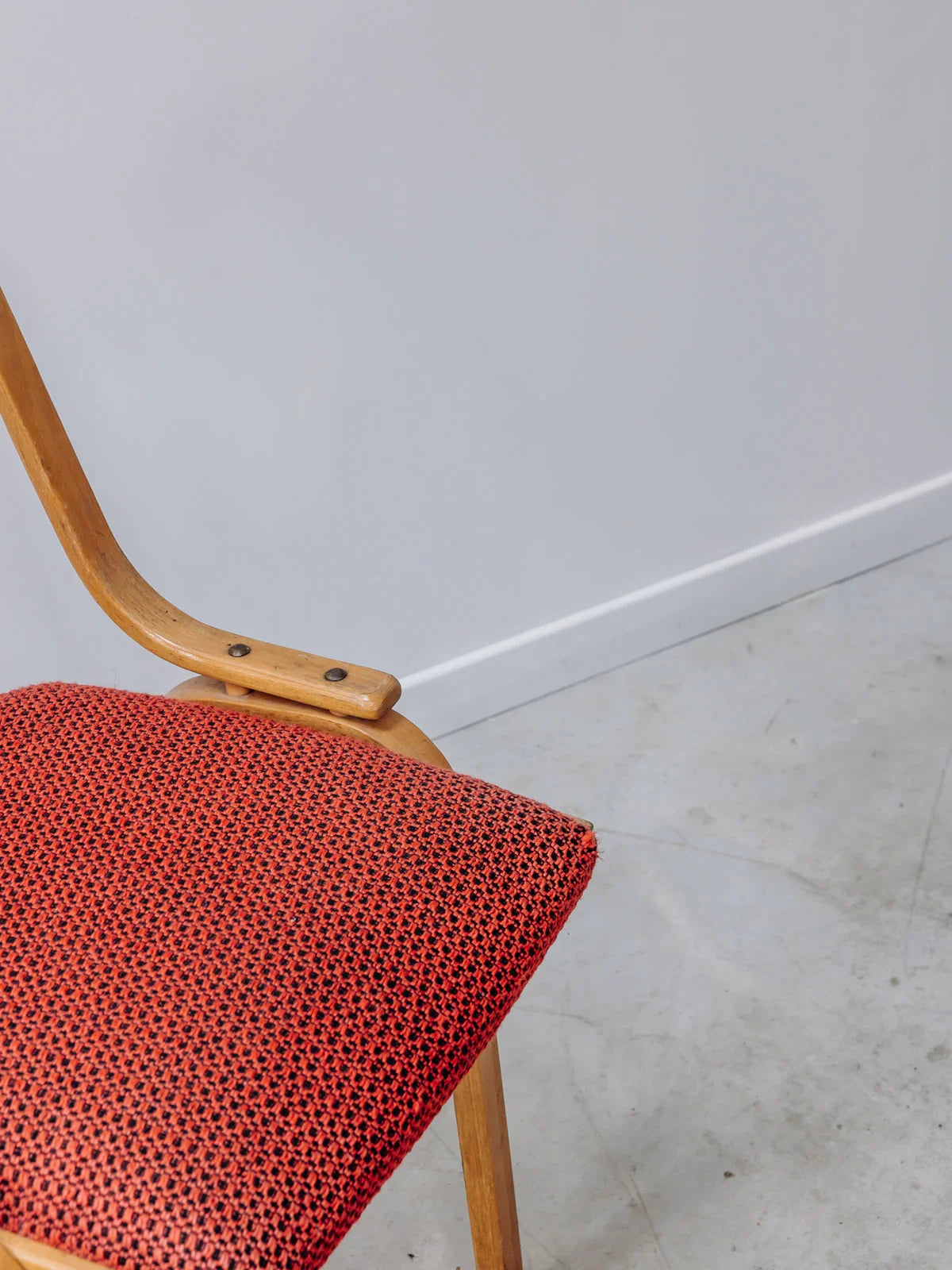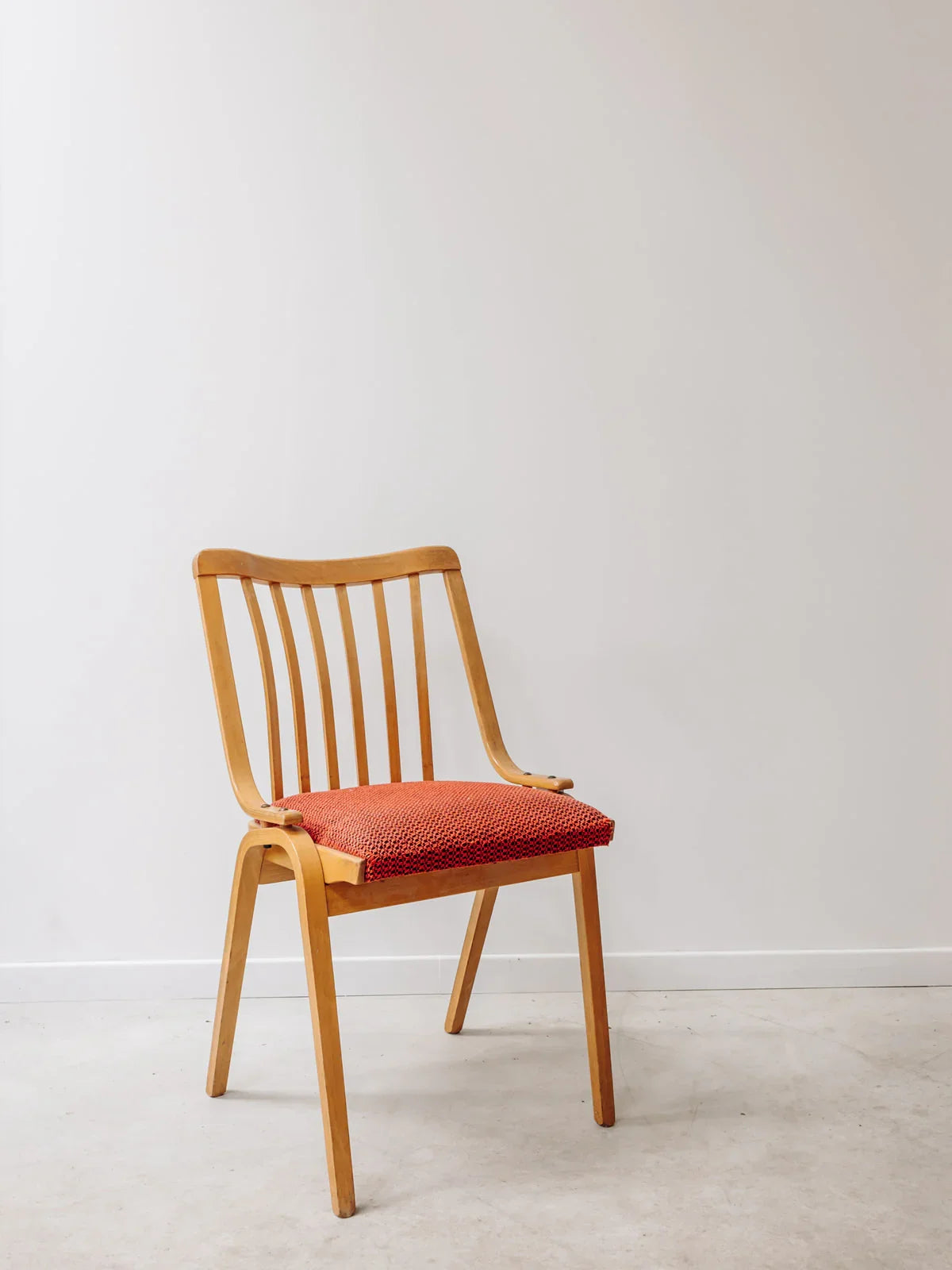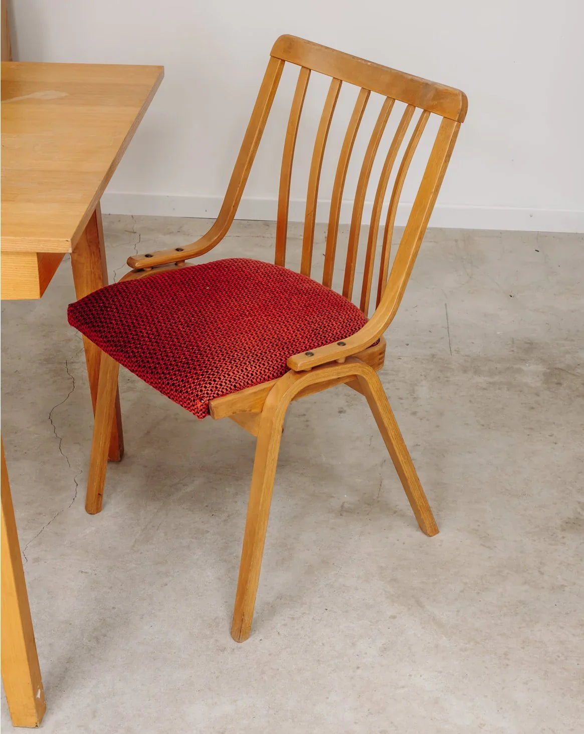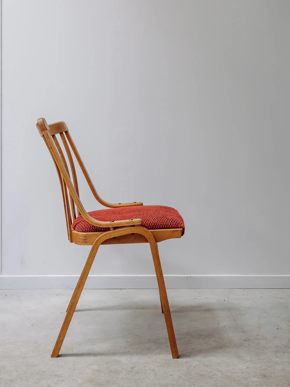 This wooden chair by Ton combines sleek design and comfort. Its delicate curves and comfortable seat make it an ideal choice for the dining room or a reading nook. With its light wood legs, it adds a natural and modern touch. We also love its very comfortable red fabric seat. Sold individually, three copies are available.