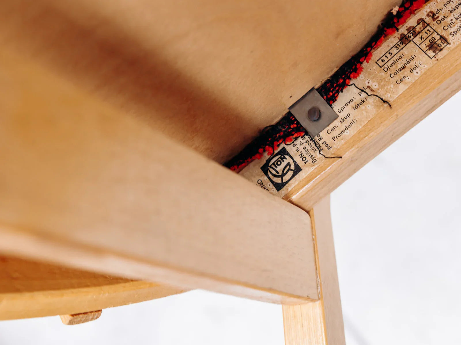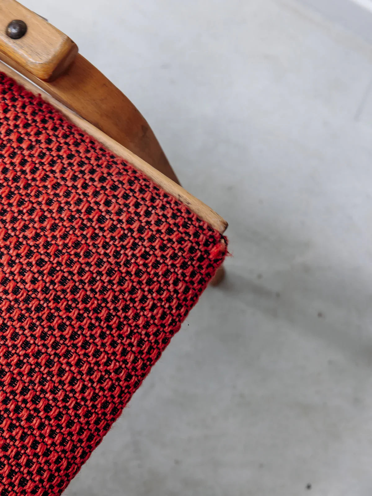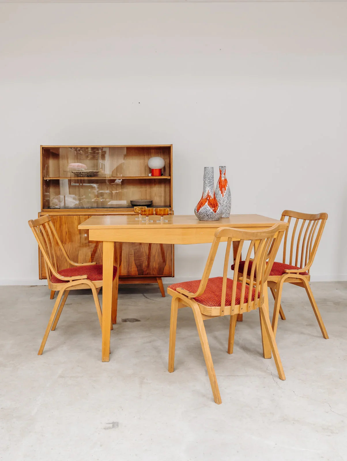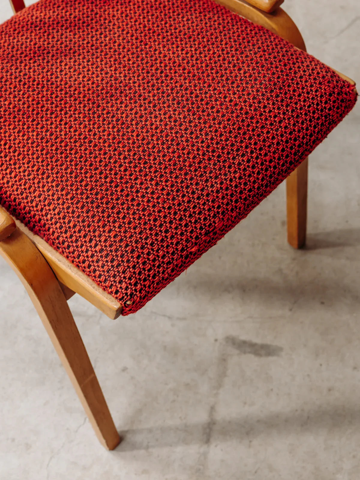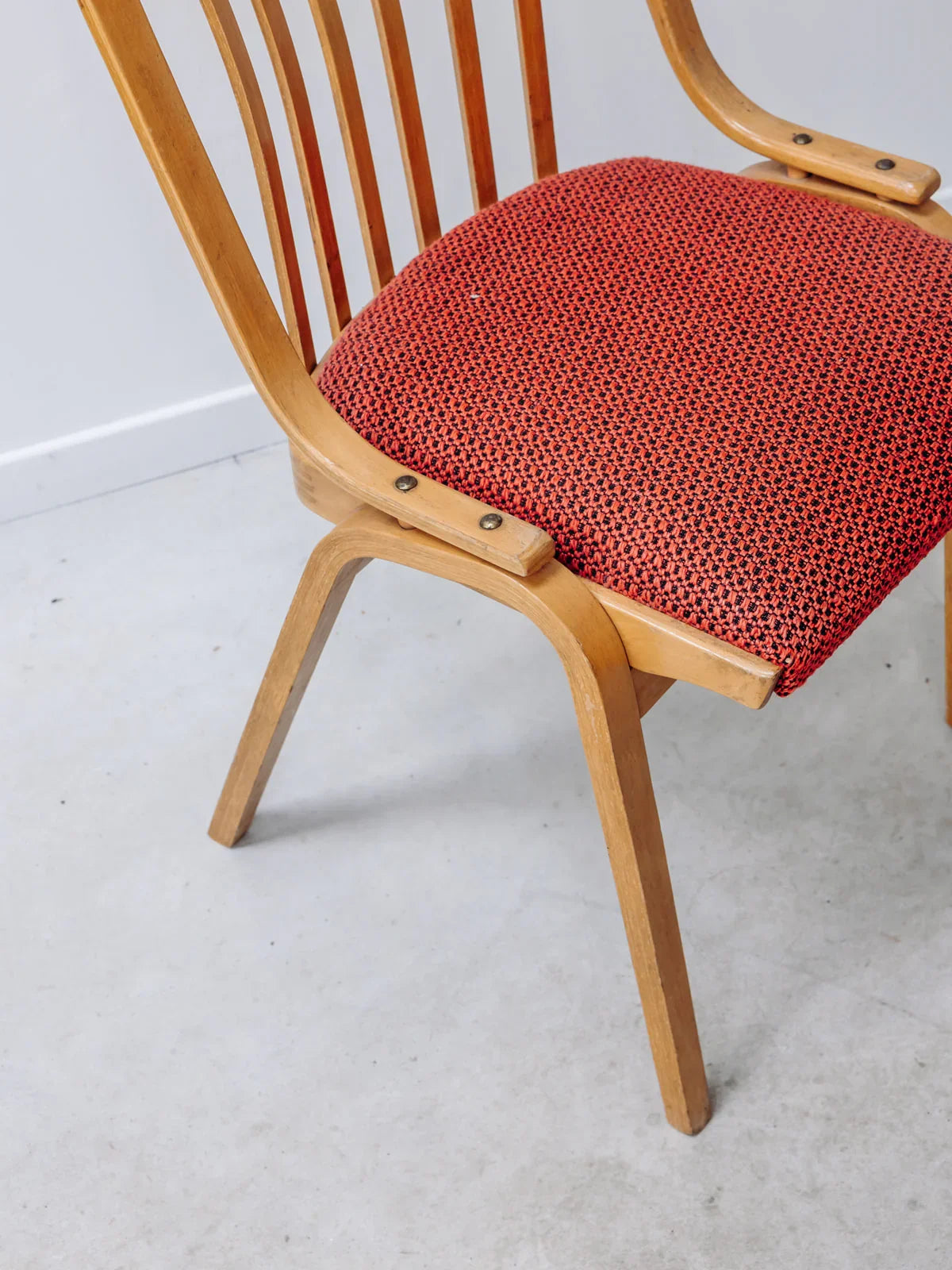 This wooden chair by Ton combines sleek design and comfort. Its delicate curves and comfortable seat make it an ideal choice for the dining room or a reading nook. With its light wood legs, it adds a natural and modern touch. We also love its very comfortable red fabric seat. Sold individually, three copies are available.