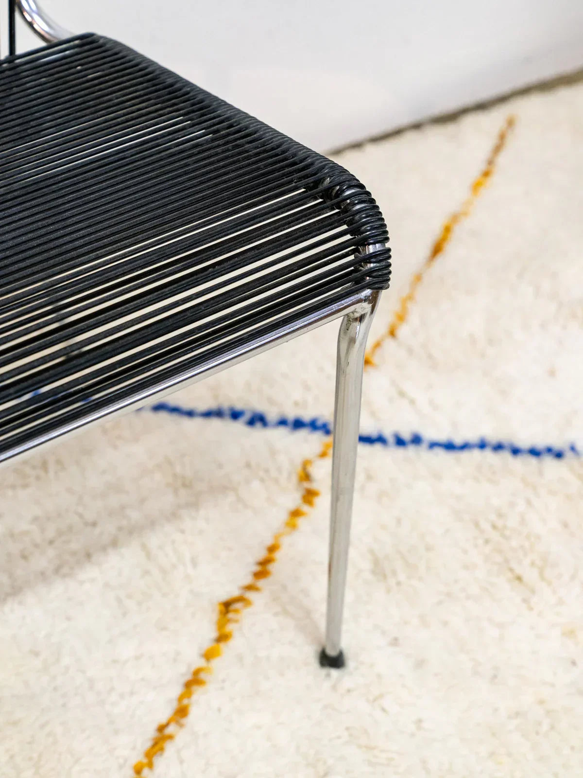 Embrace this pair of vintage chairs upholstered in black woven plastic on the back and seat, resting on chrome legs. Their profile and seat make them simple yet stylish additions to an intimate dining room, a home office nook, or a designer dining area. The contrast between the plastic and chrome adds a graphic retro touch and understated elegance to the room. Some signs of age are present.