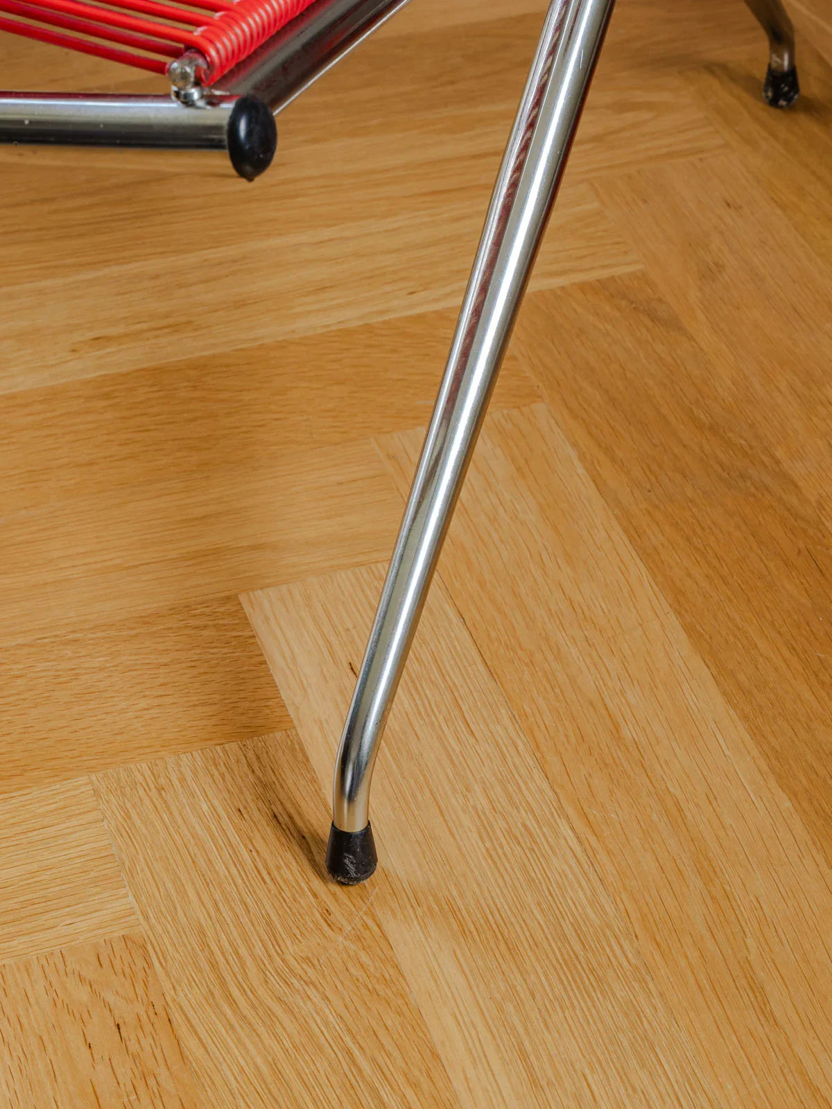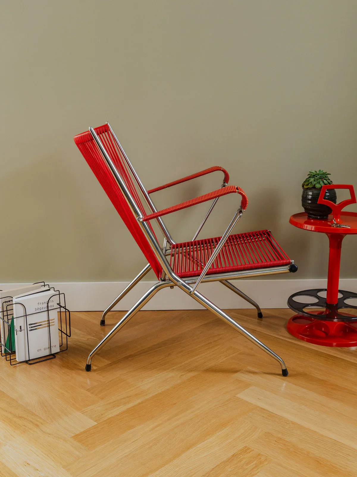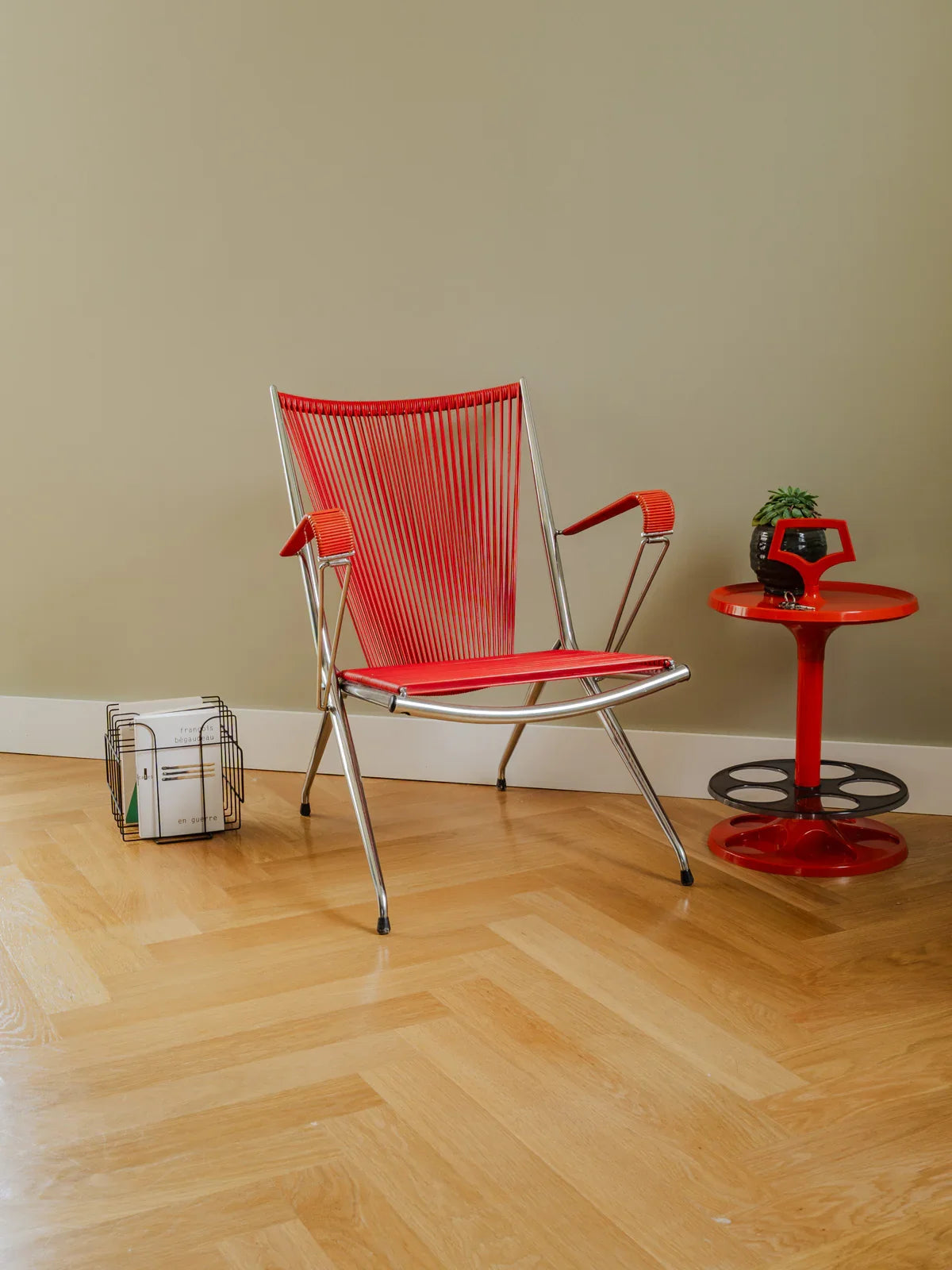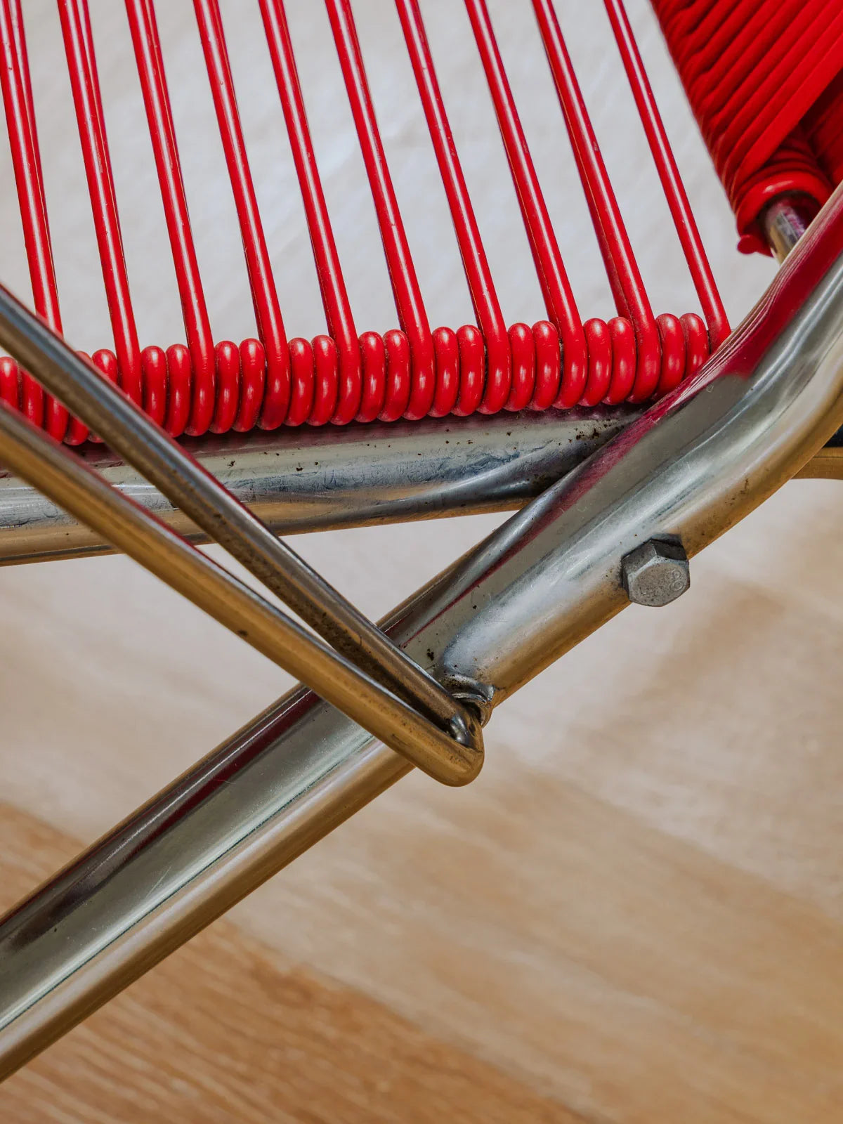 Embrace this vintage chair with its red woven straps on a chrome frame. The warm combination of woven straps and metal adds a retro and graphic touch to any room. The straps provide a soft and breathable seat, while the chrome base catches the light, creating an elegant contrast. Its silhouette and low seat make it ideal around a table, in a home office, or as an occasional chair. Some signs of age are present.