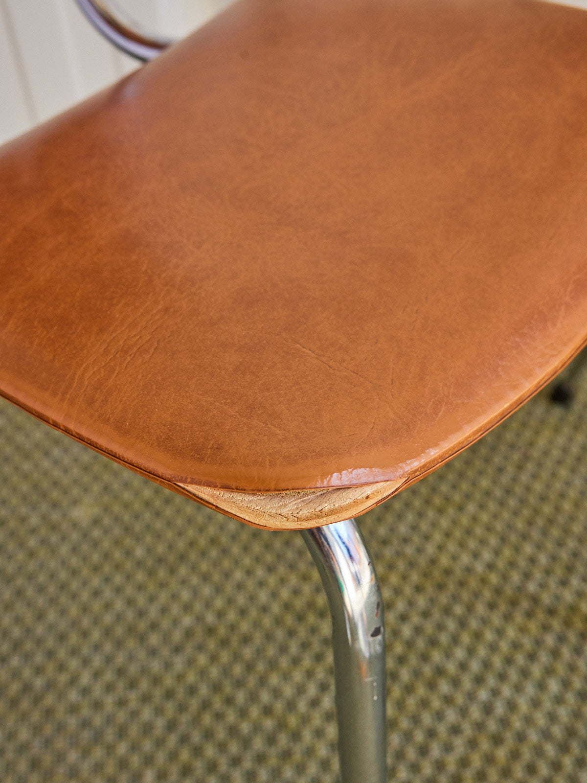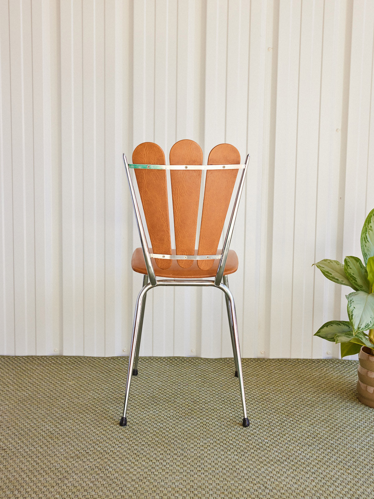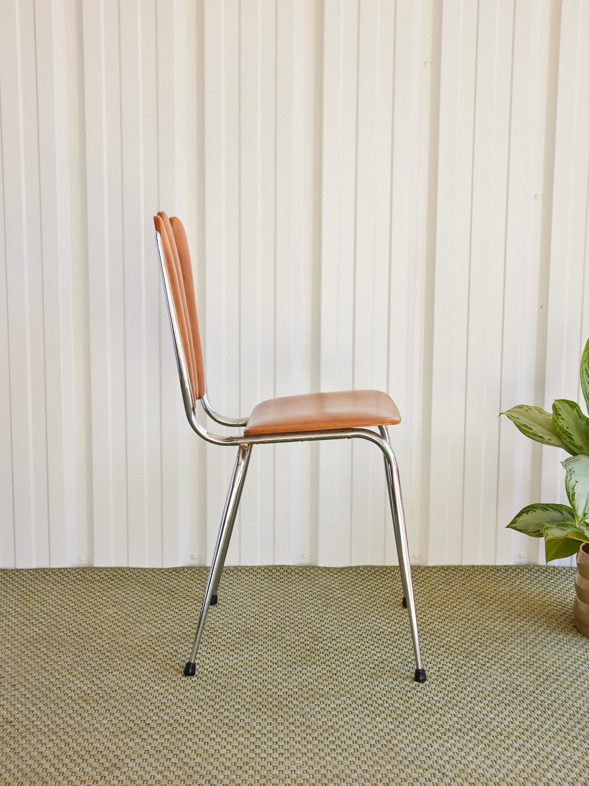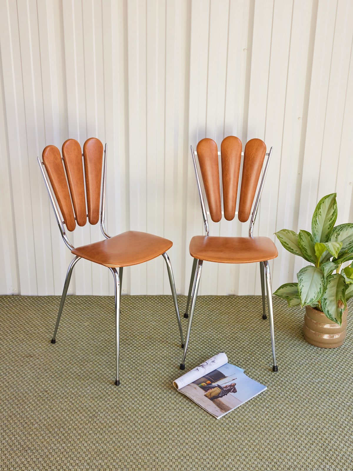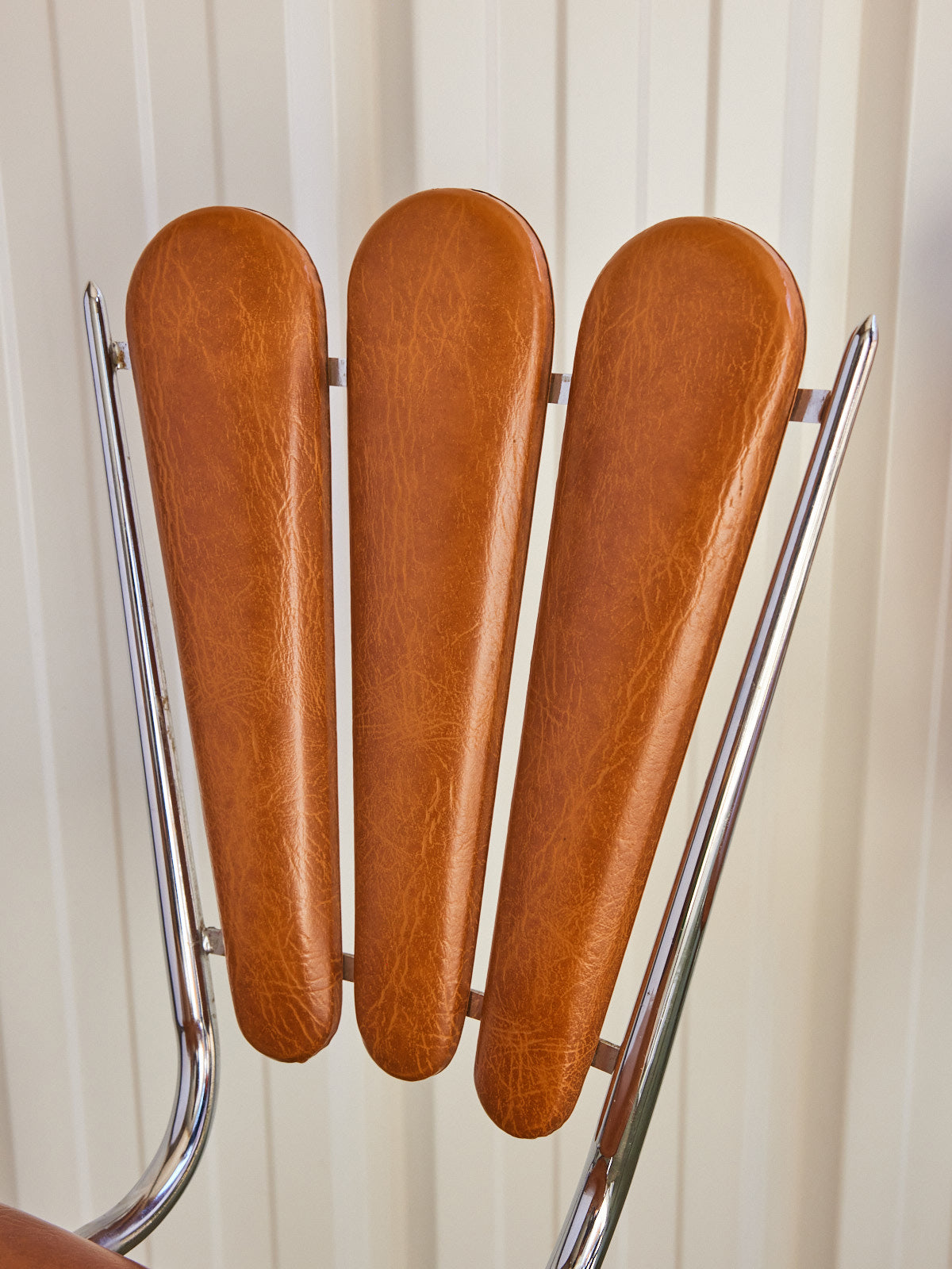 Adopt this pair of vintage chairs with imitation leather upholstery and chrome base, which combines the softness of imitation leather with the delicate shine of metal. Their welcoming seat and balanced proportions fit just as well around a dining table as in an office or a compact dining area, bringing comfort and discreet retro character. A defect on one of the seats is present, without affecting use.