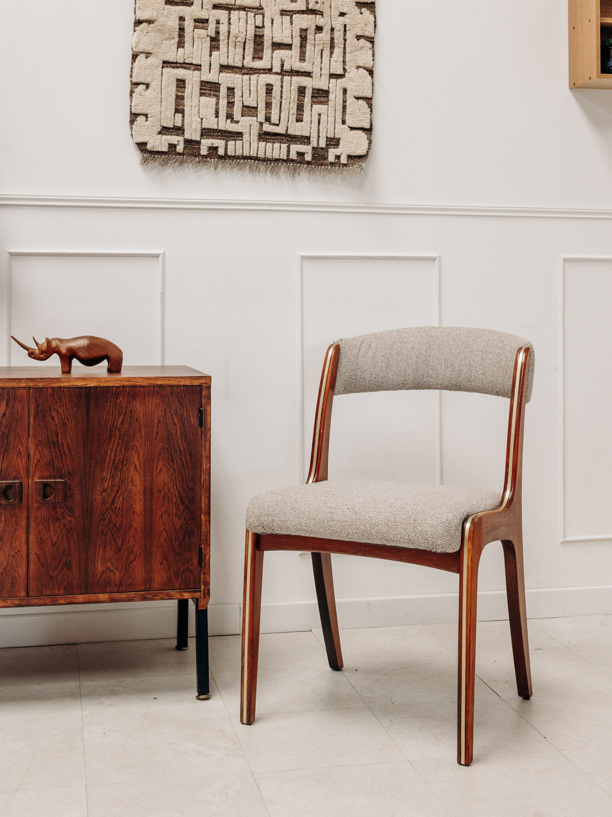 Discover this pair of chairs with understated charm, featuring a wooden frame accented with a gold trim that subtly catches the light. Their slender profile and curved legs create a modern take on classic design, ideal for a dining room or a cozy dining area. The gray fabric seat offers simple comfort and a pleasing neutrality, easily complementing a variety of décor styles. Their compact size and clean lines create a warm and balanced atmosphere.