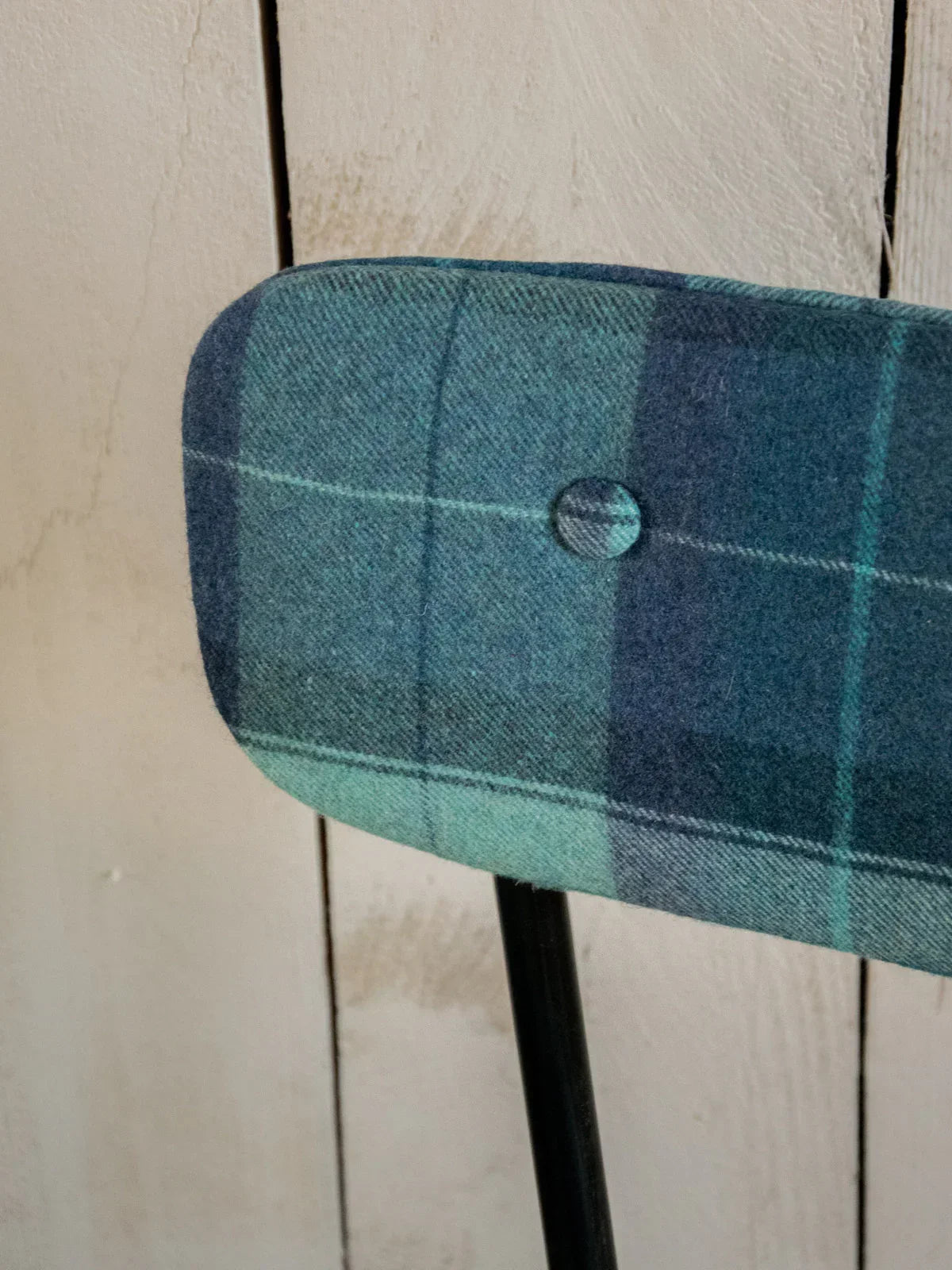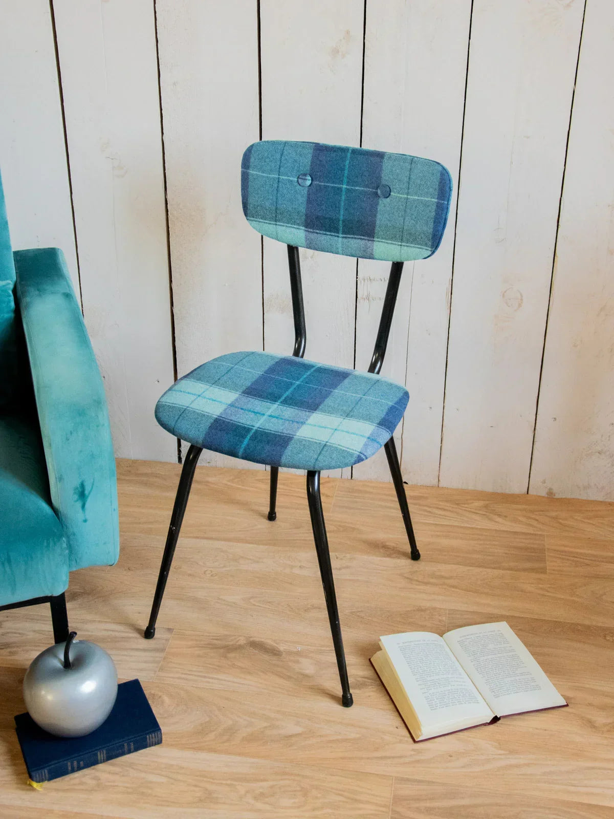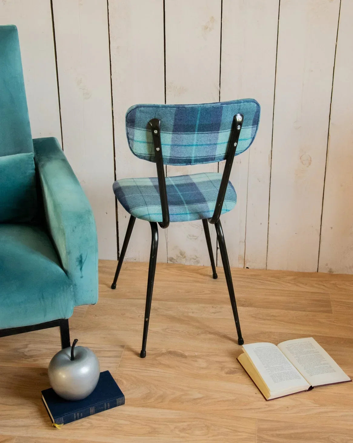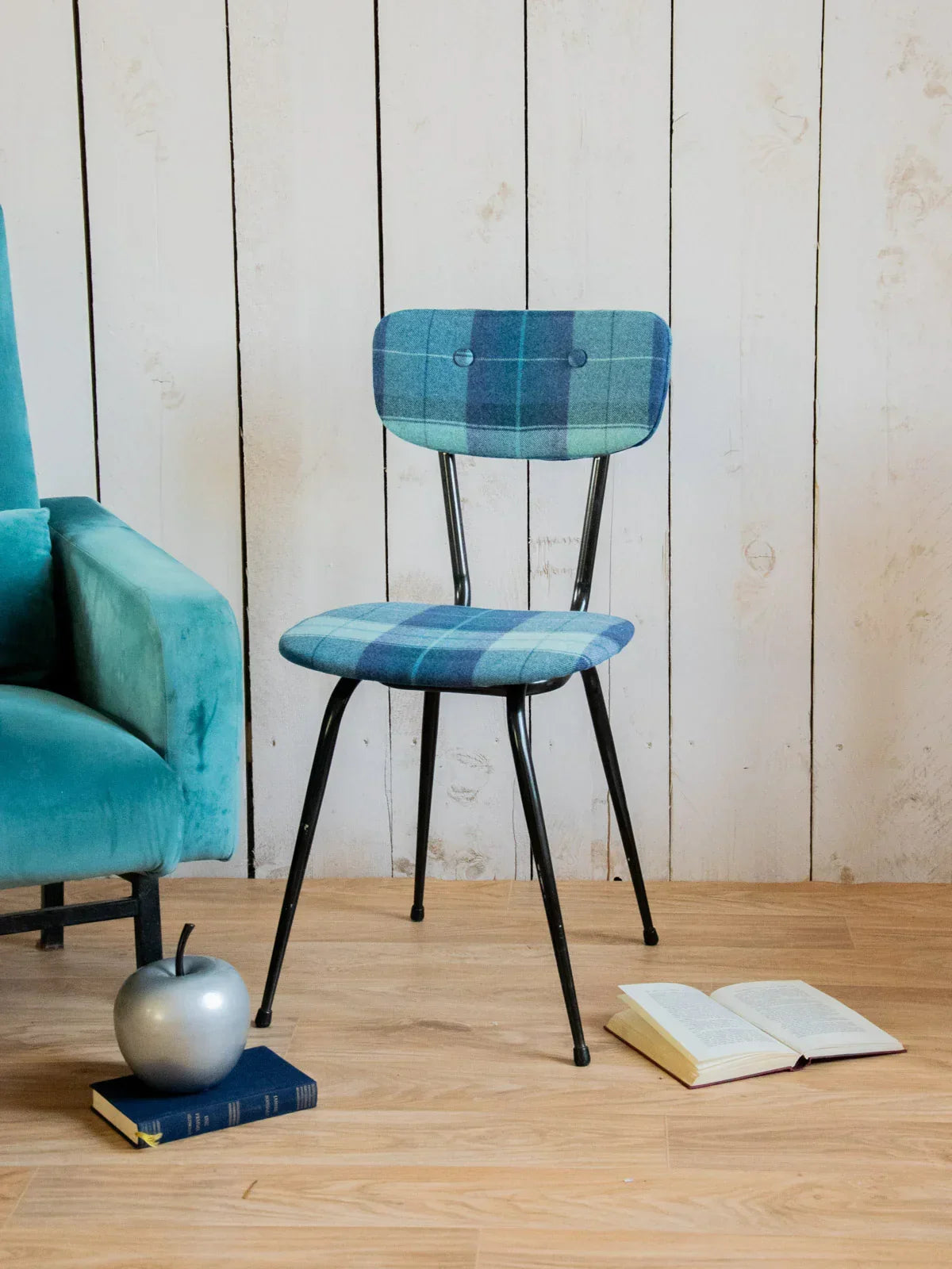 Embrace this fully reupholstered blue tartan chair, whose buttoned back adds a touch of retro-chic elegance. Its black metal frame creates a compact and graphic silhouette, perfect for a home office, an intimate dining room, or a reading nook. The patterned fabric combines character and comfort to instill a warm and refined atmosphere. Both practical and decorative, this chair blends seamlessly into contemporary interiors as well as more traditional settings.