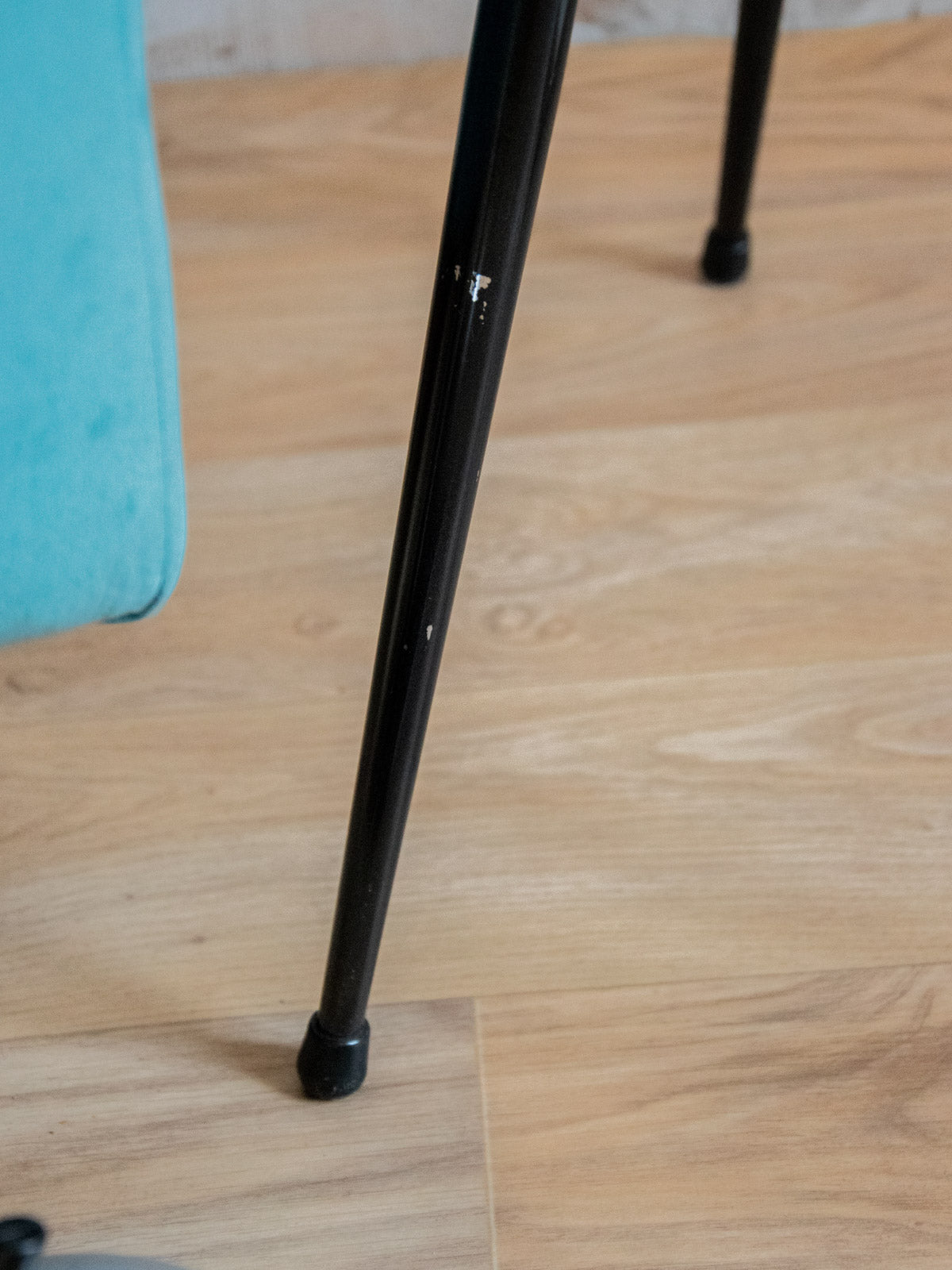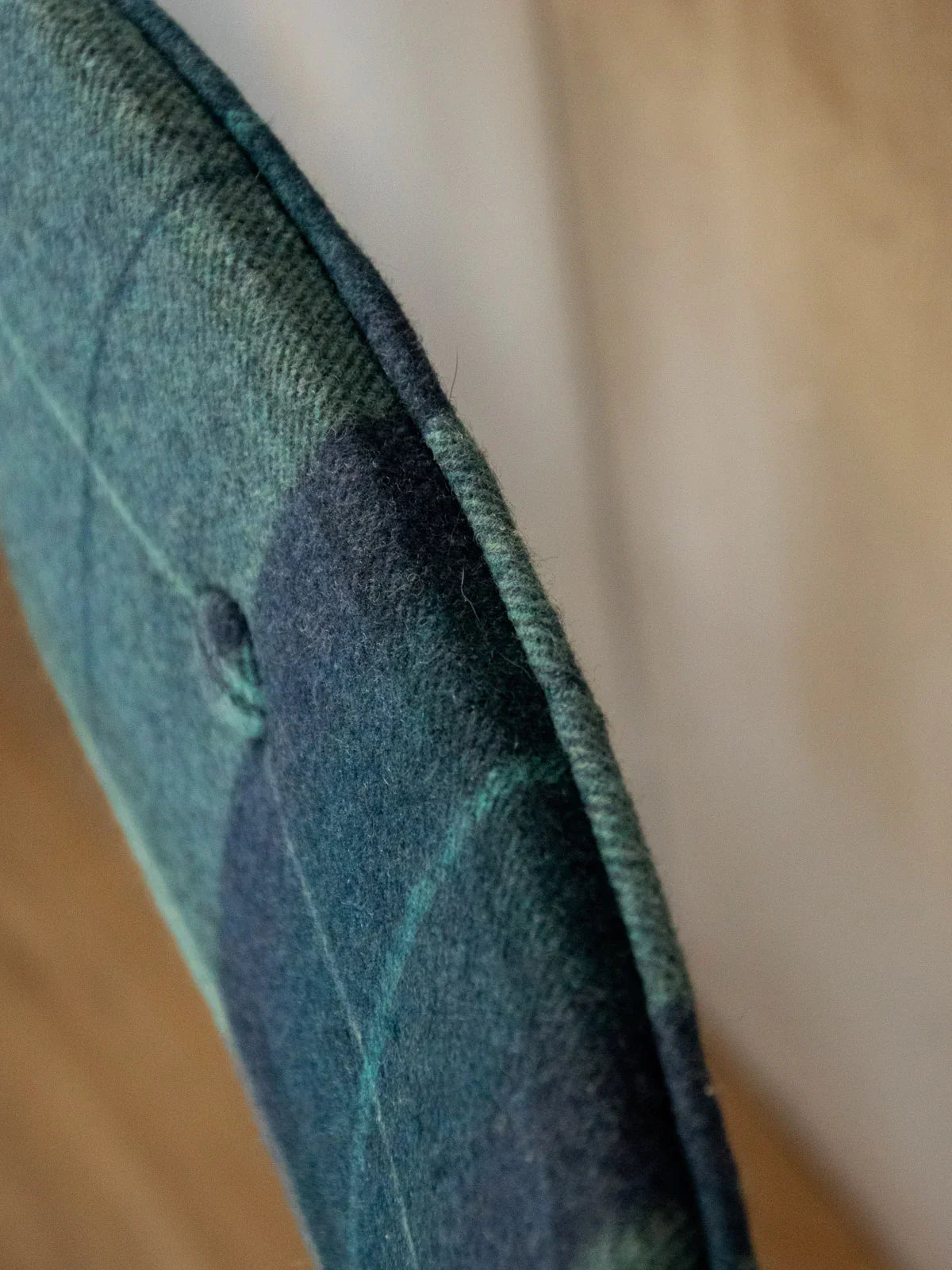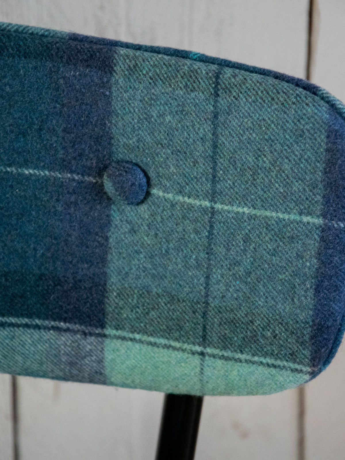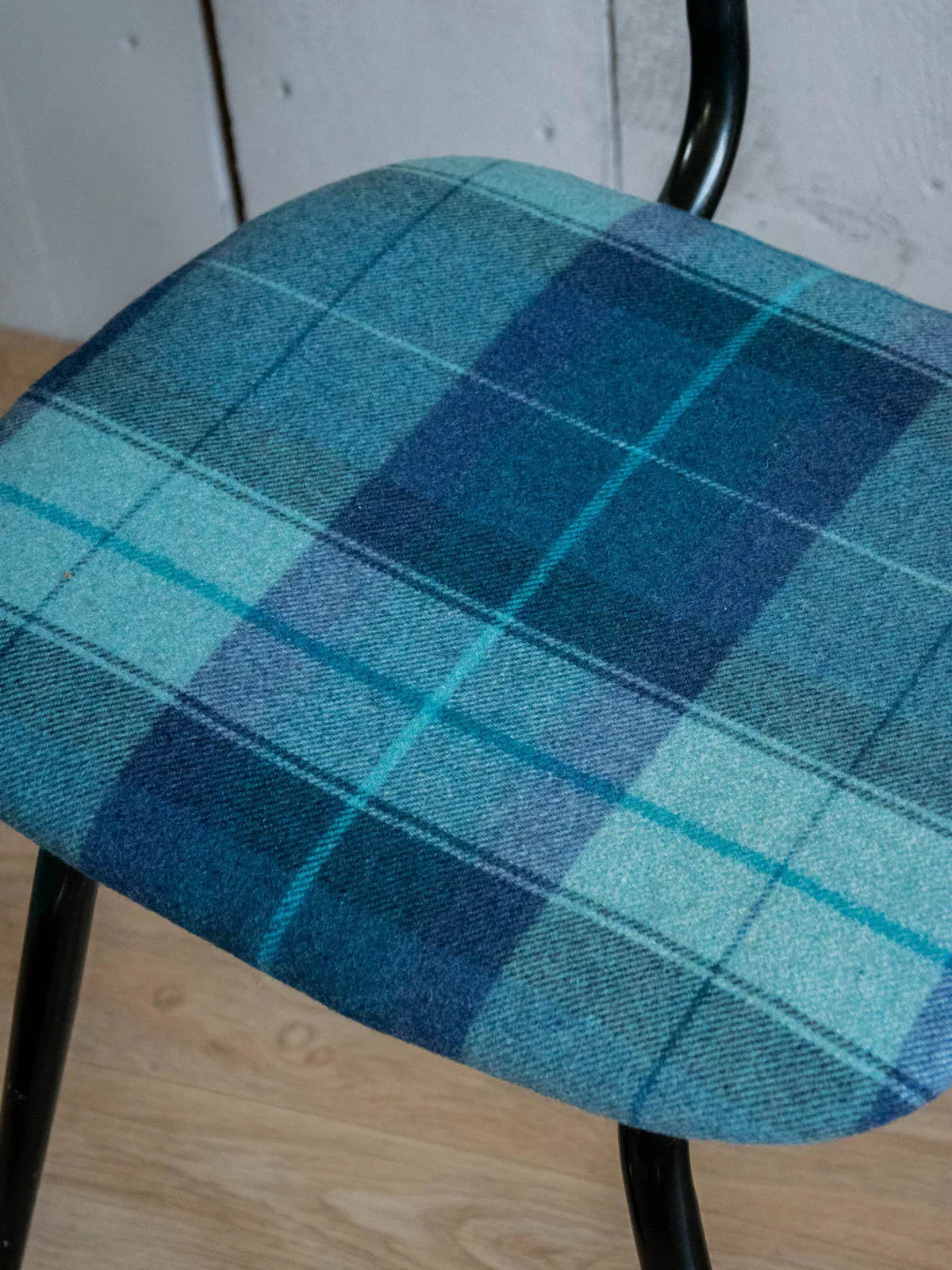Embrace this fully reupholstered blue tartan chair, whose buttoned back adds a touch of retro-chic elegance. Its black metal frame creates a compact and graphic silhouette, perfect for a home office, an intimate dining room, or a reading nook. The patterned fabric combines character and comfort to instill a warm and refined atmosphere. Both practical and decorative, this chair blends seamlessly into contemporary interiors as well as more traditional settings.