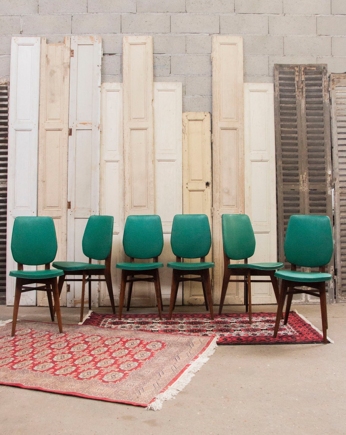 Invitez une touche rétro-chic avec ce lot de six chaises en vinyle vert, au revêtement lisse et facile d'entretien, idéal pour une salle à manger chaleureuse. Les pieds fins en bois foncé vernis affinent la silhouette et apportent une élégance discrète, tandis que les assises compactes et les dossiers légèrement hauts offrent un confort adapté aux repas et aux conversations prolongées. Polyvalentes, elles s'intègrent aussi bien dans un intérieur contemporain que dans une ambiance vintage, créant une atmosphère accueillante et stylée. Usures légères présentes.
