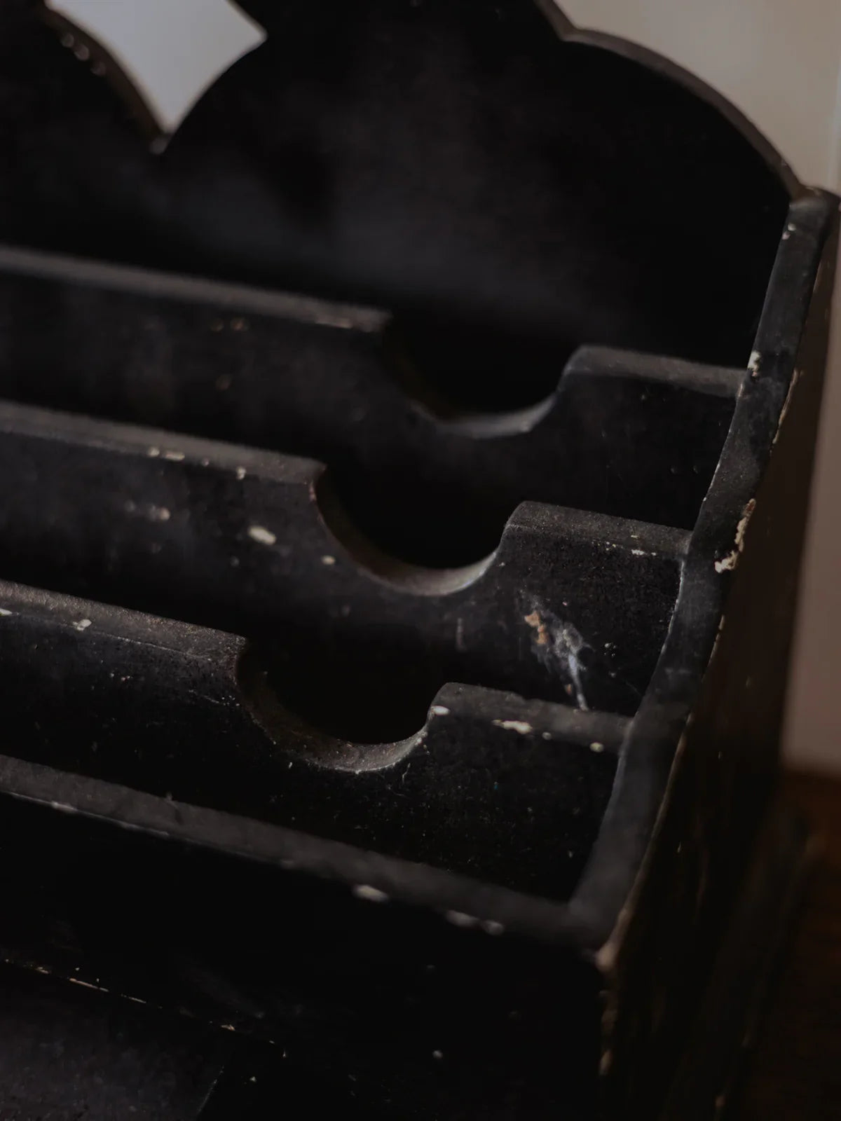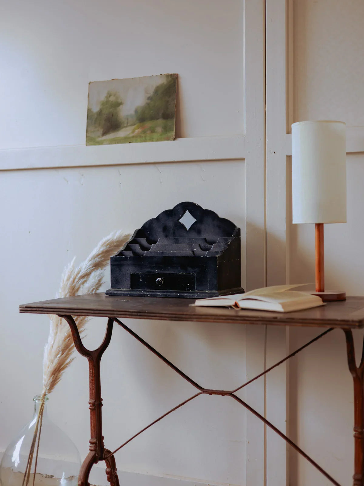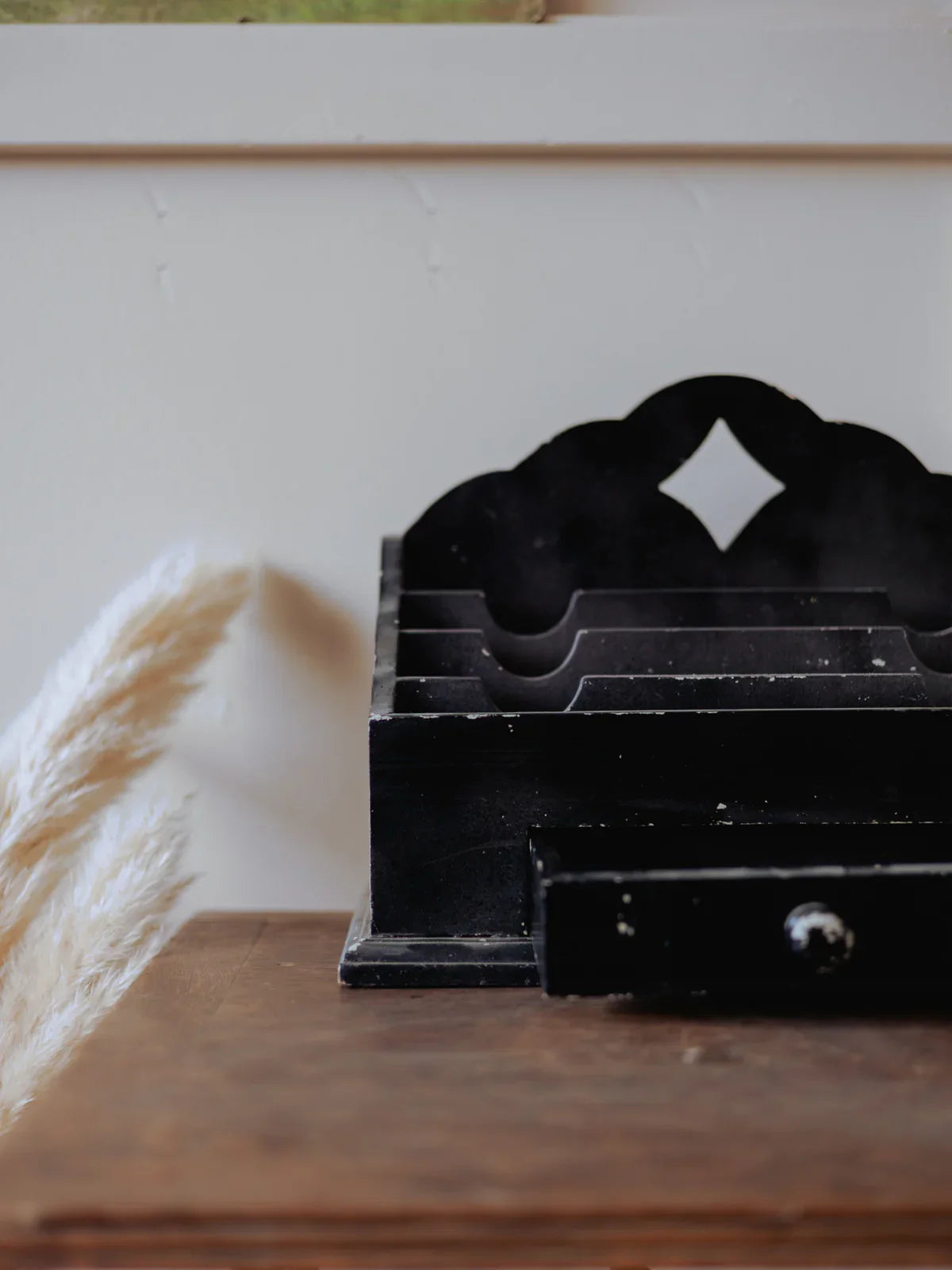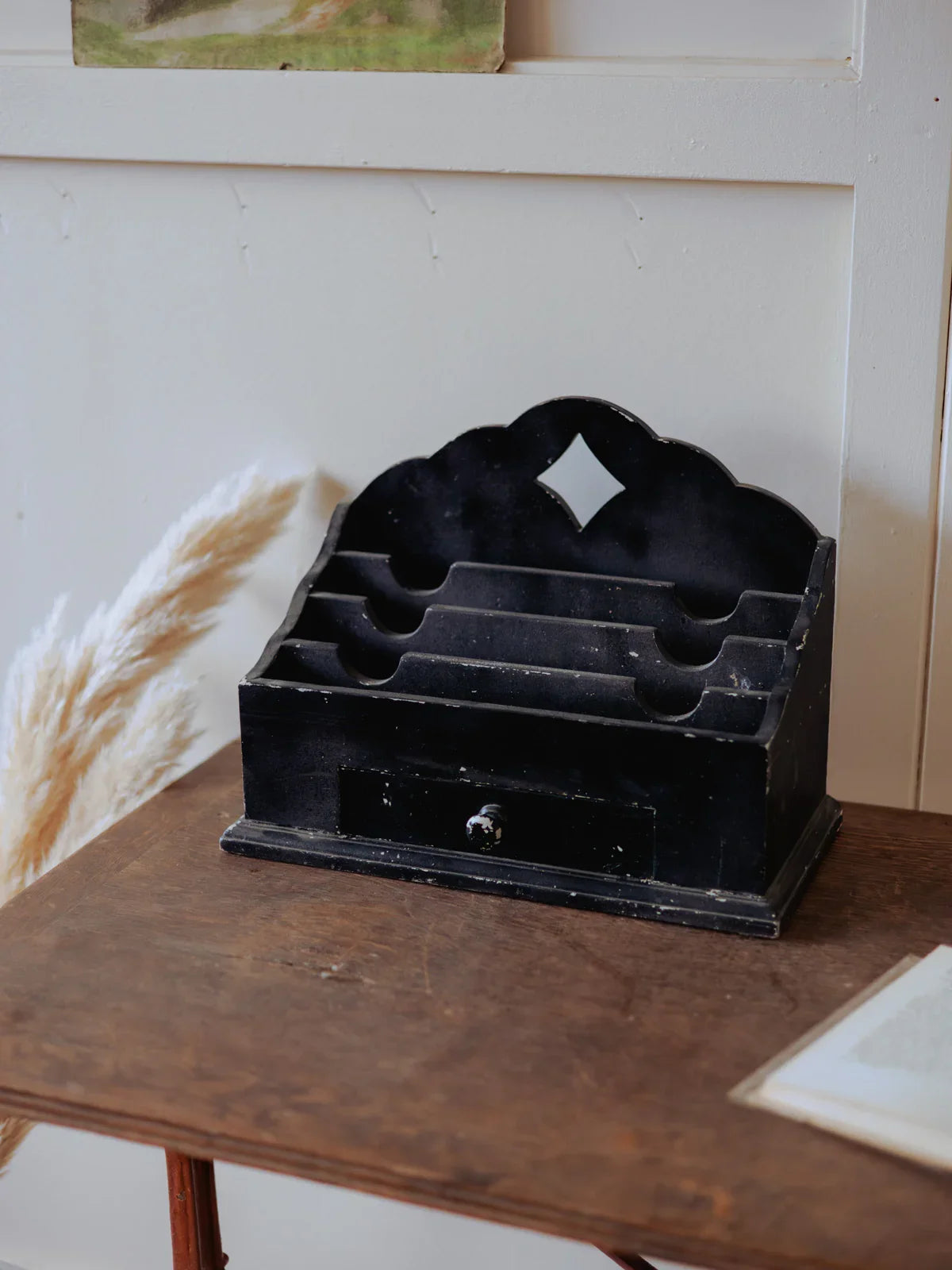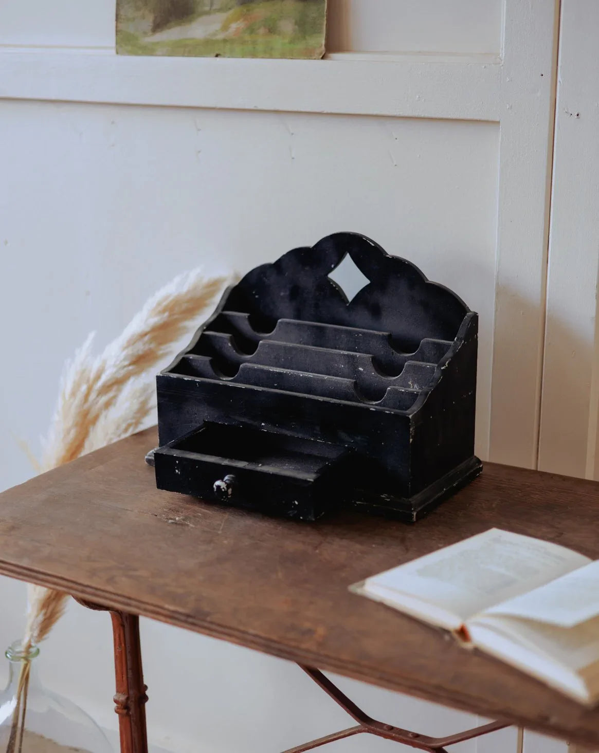 Discover this black letter sorter with a functional design, featuring a central drawer and ample storage space for mail, bills, and small everyday items. Its black paint and graphic silhouette evoke a minimalist, almost workshop-like style that integrates elegantly into an entryway or office, adding organization and character without clutter. Its robust construction prioritizes practical daily use while maintaining a clean aesthetic. Some paint chips reveal the primer in places; signs of age are visible.
