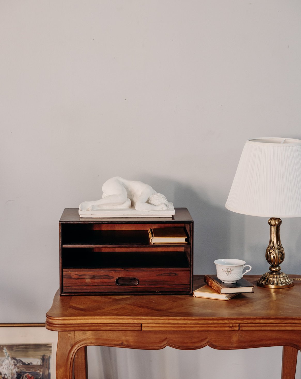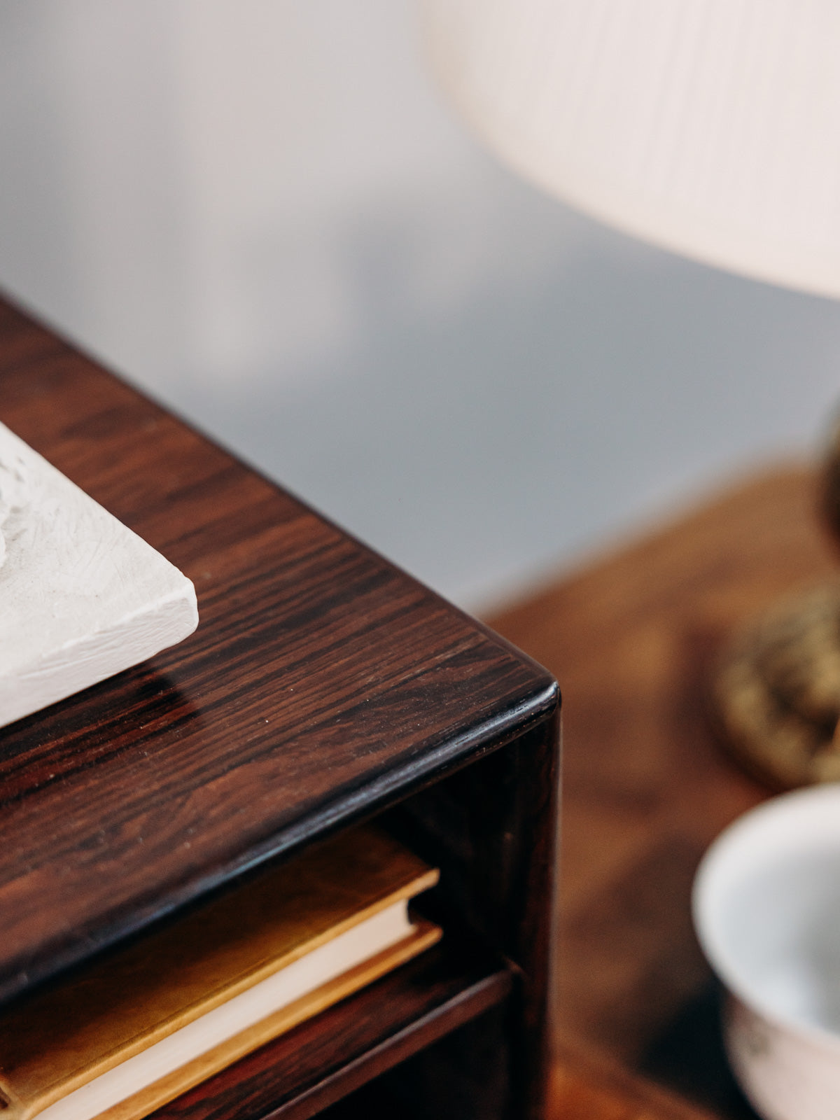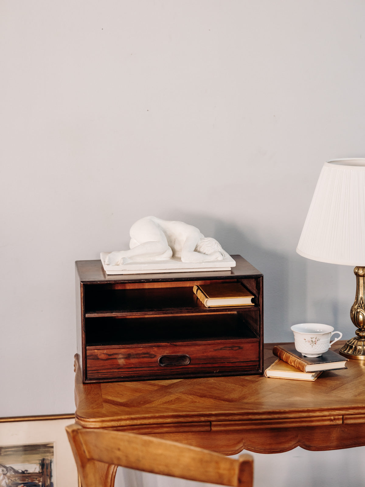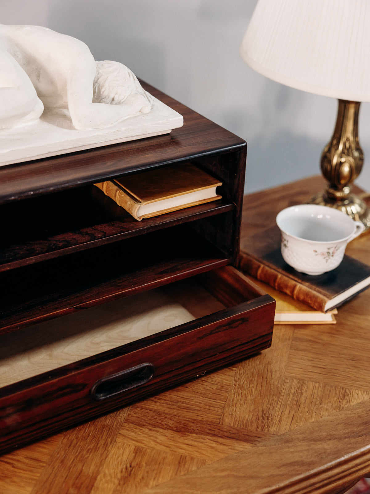 Choose this Scandinavian-style storage unit in dark wood with a rectangular profile, designed to elegantly organize your office. Its two open compartments and small drawer offer practical storage solutions for papers, notebooks, and small accessories, while the dark finish adds a warm and contemporary touch to a minimalist interior. Compact and well-proportioned, it fits easily on a work surface or low shelf. Minor wear and scratches.