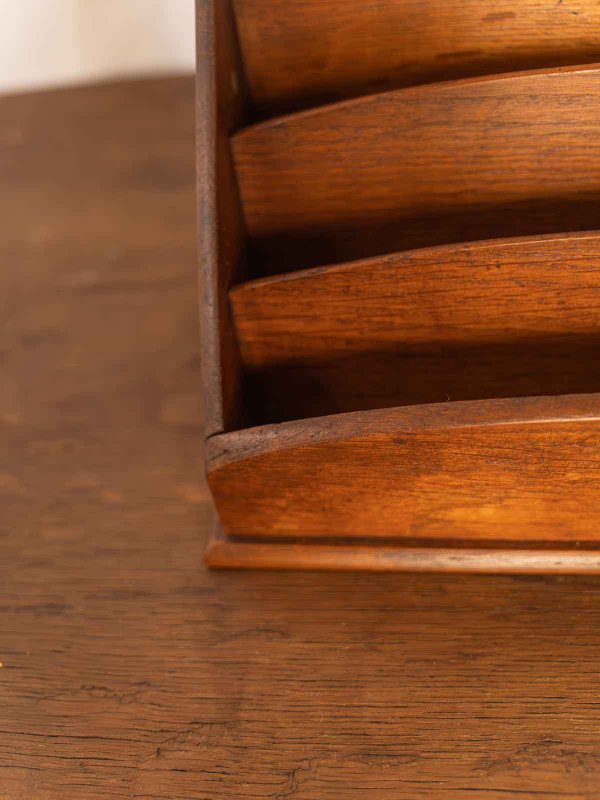 Discover this dark wood letter sorter, with its clean lines and carefully considered proportions, which fits perfectly on a desk, console table, or in an entryway. Its four compartments offer clear organization for letters, papers, and small documents, while the warm patina of the wood and its matte finish create a refined and welcoming atmosphere in your home. Minor signs of age are present.