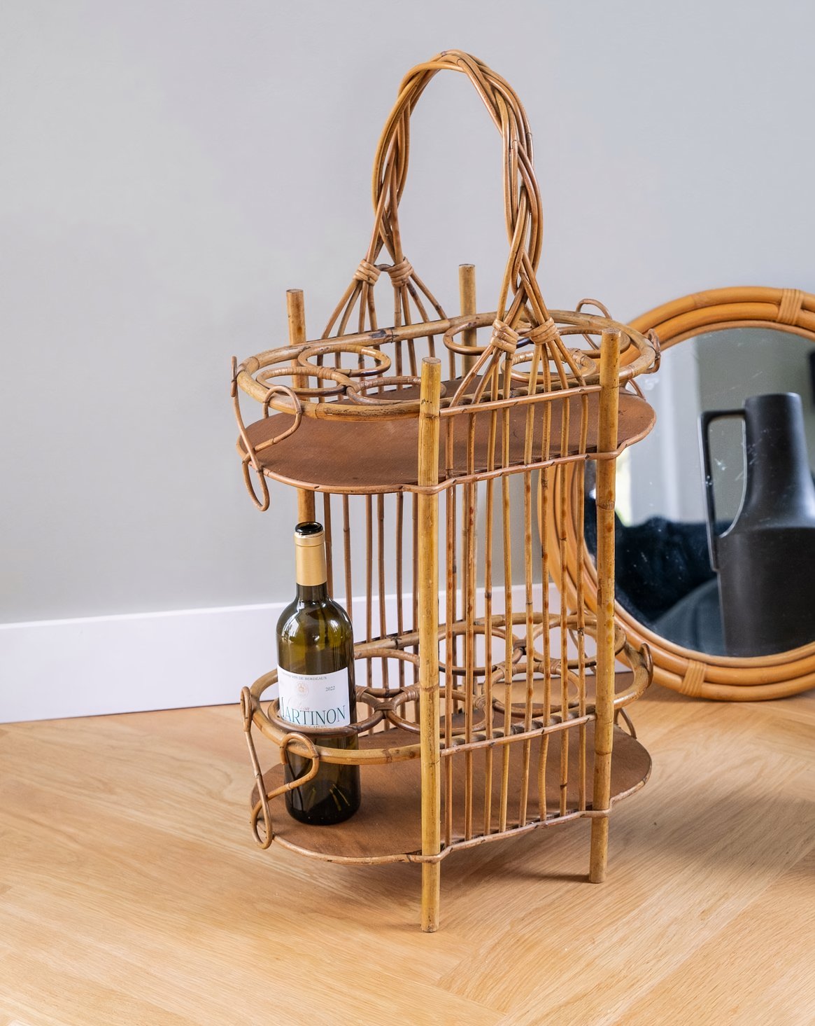 Add a touch of retro charm to your home with this rattan wine rack. Its 6-bottle capacity offers a stylish way to organize your precious bottles while adding a vintage feel to your decor. Every detail of this wine rack is carefully designed to combine aesthetics and practicality, making this accessory a must-have for wine lovers. Its timeless design fits perfectly into any room of the house, from the living room to the kitchen.