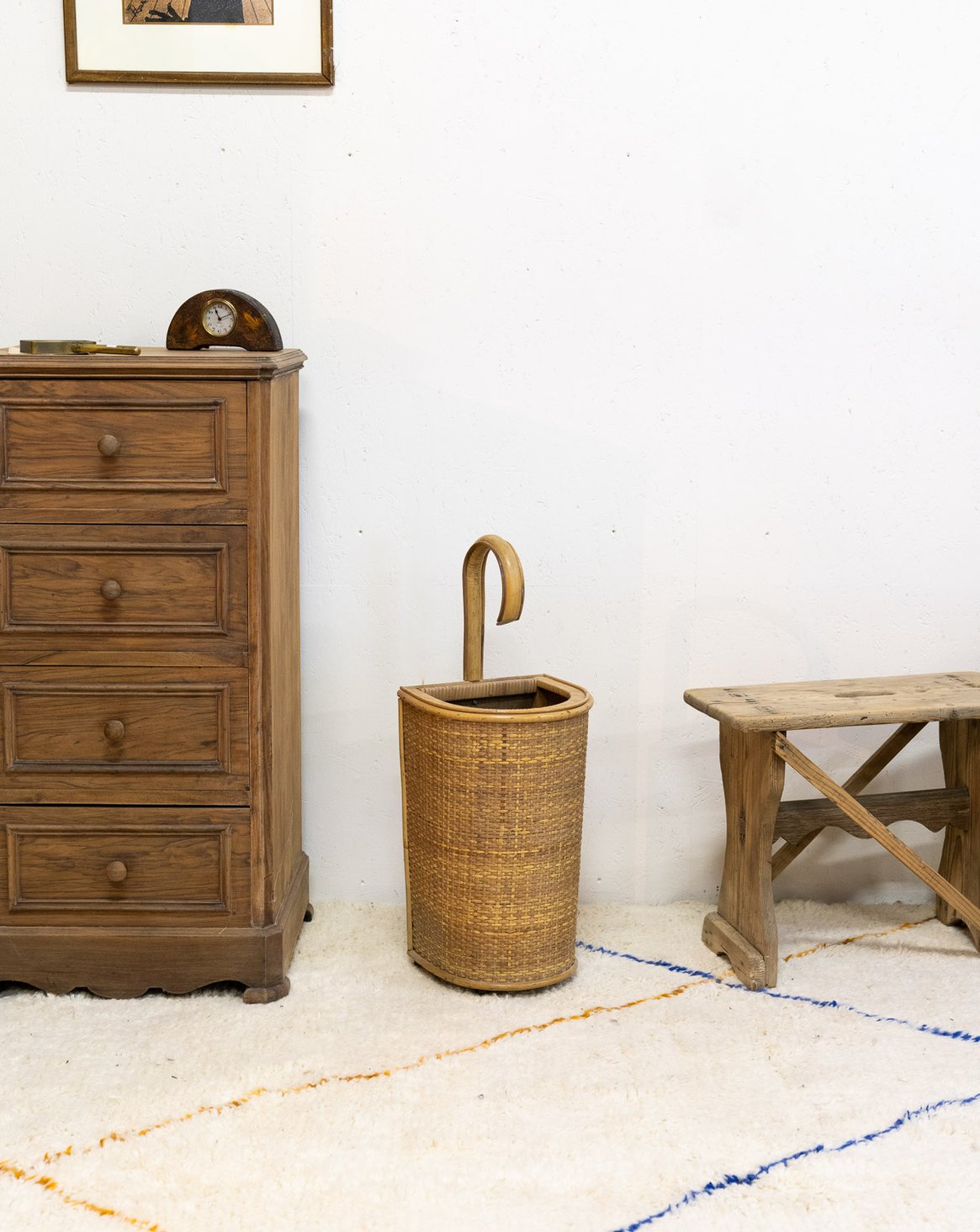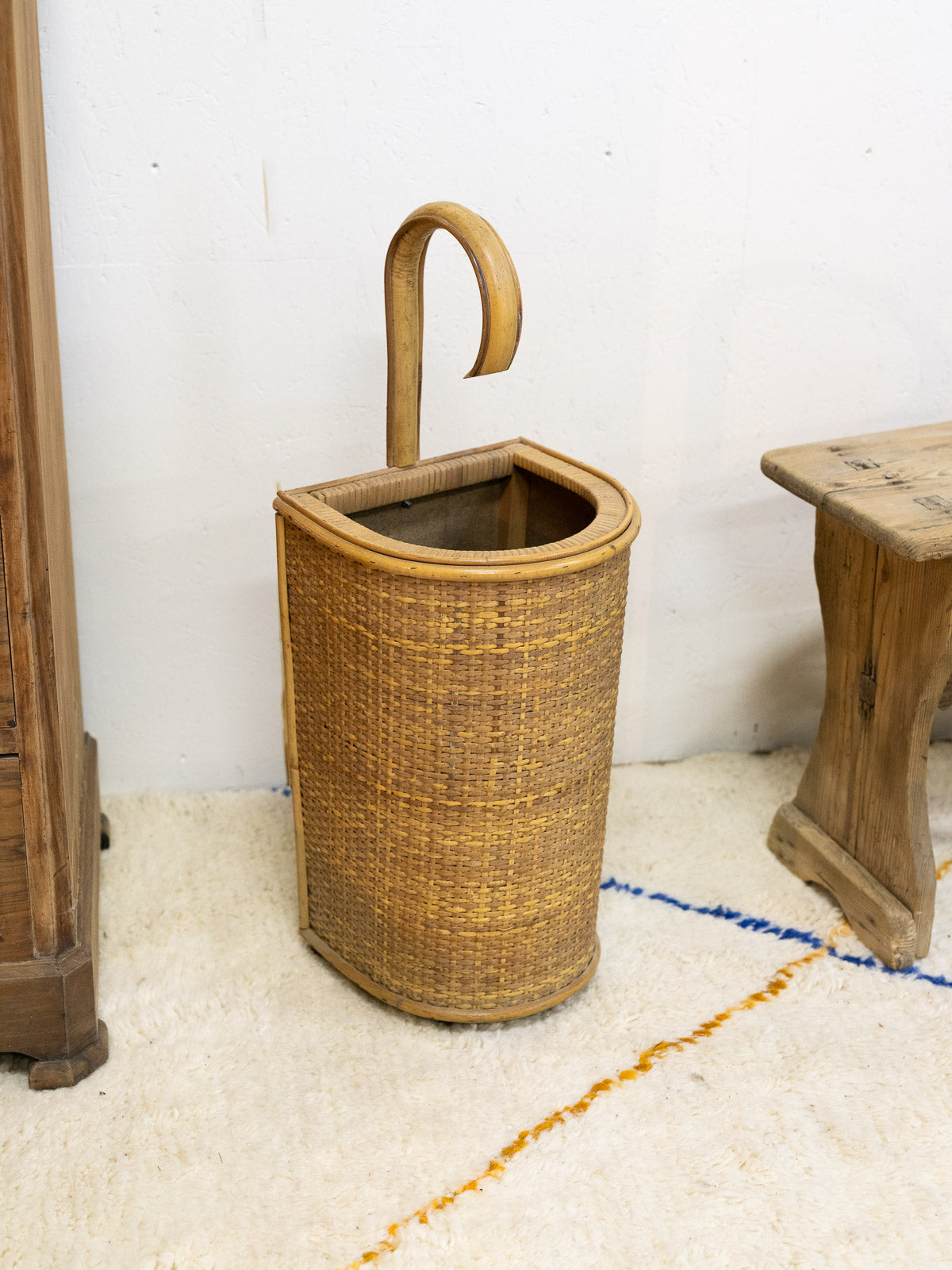 Invite this vintage rattan and cane umbrella stand into your entryway to add a touch of natural warmth. Its structure holds several umbrellas without cluttering the space, while the caning adds a graphic texture that complements contemporary or bohemian interiors. A practical and decorative piece, it creates a welcoming atmosphere right from the doorstep. A few signs of wear only add to its authenticity.
