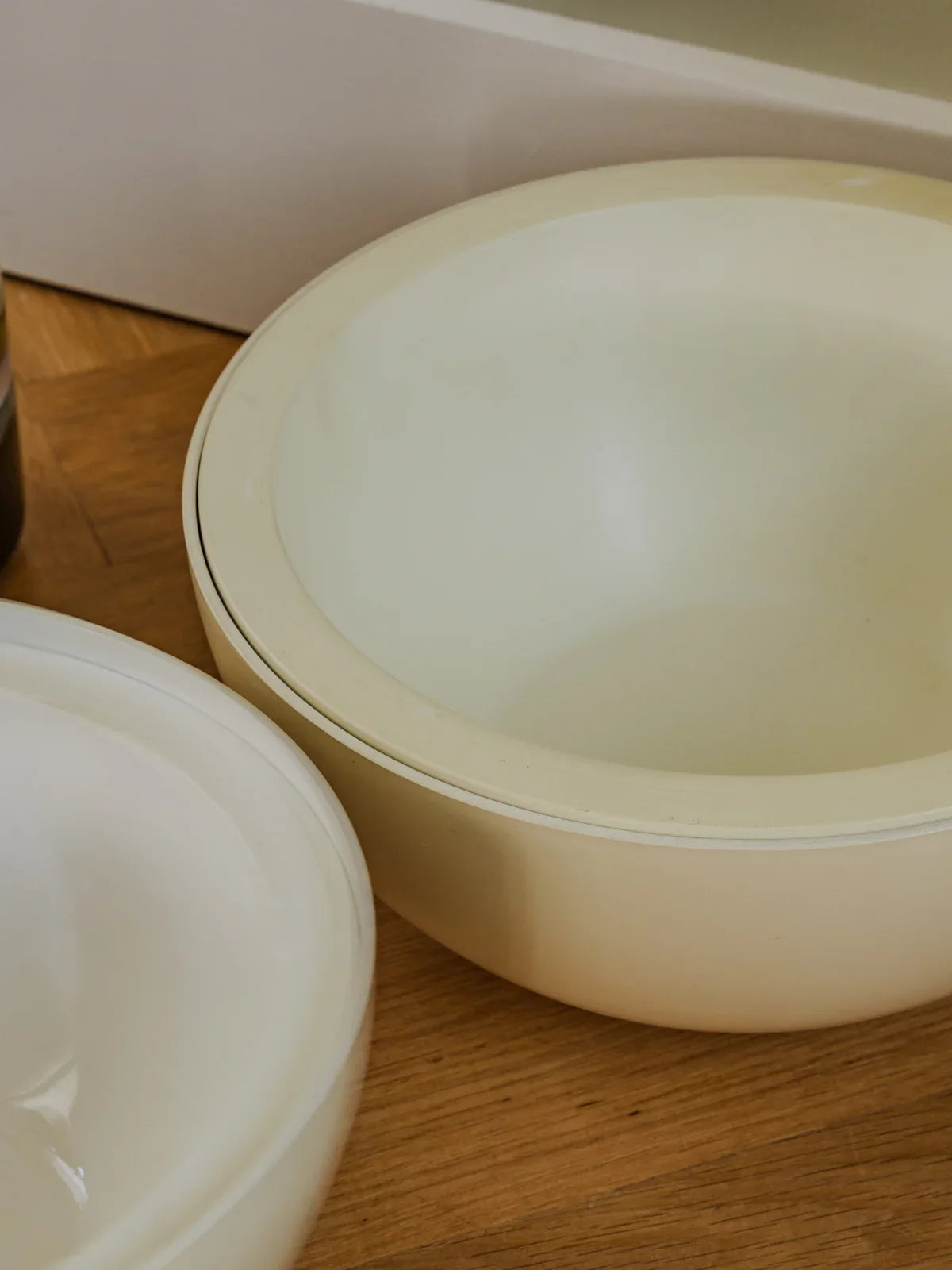 Embrace this vintage-style ice cube tray in off-white plastic, with its retro charm. Its round shape and generous capacity make it perfect for casual get-togethers or summer refreshments, adding a playful and nostalgic touch to your table. Made of durable plastic, it's easy to use and clean, while its neutral color blends elegantly into various décor styles. Some signs of age are present.