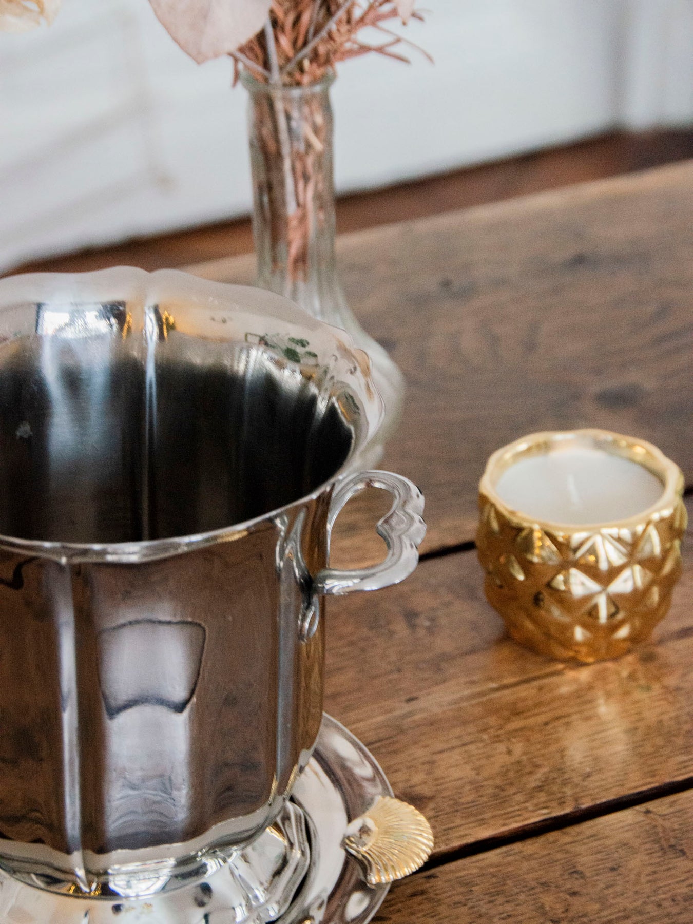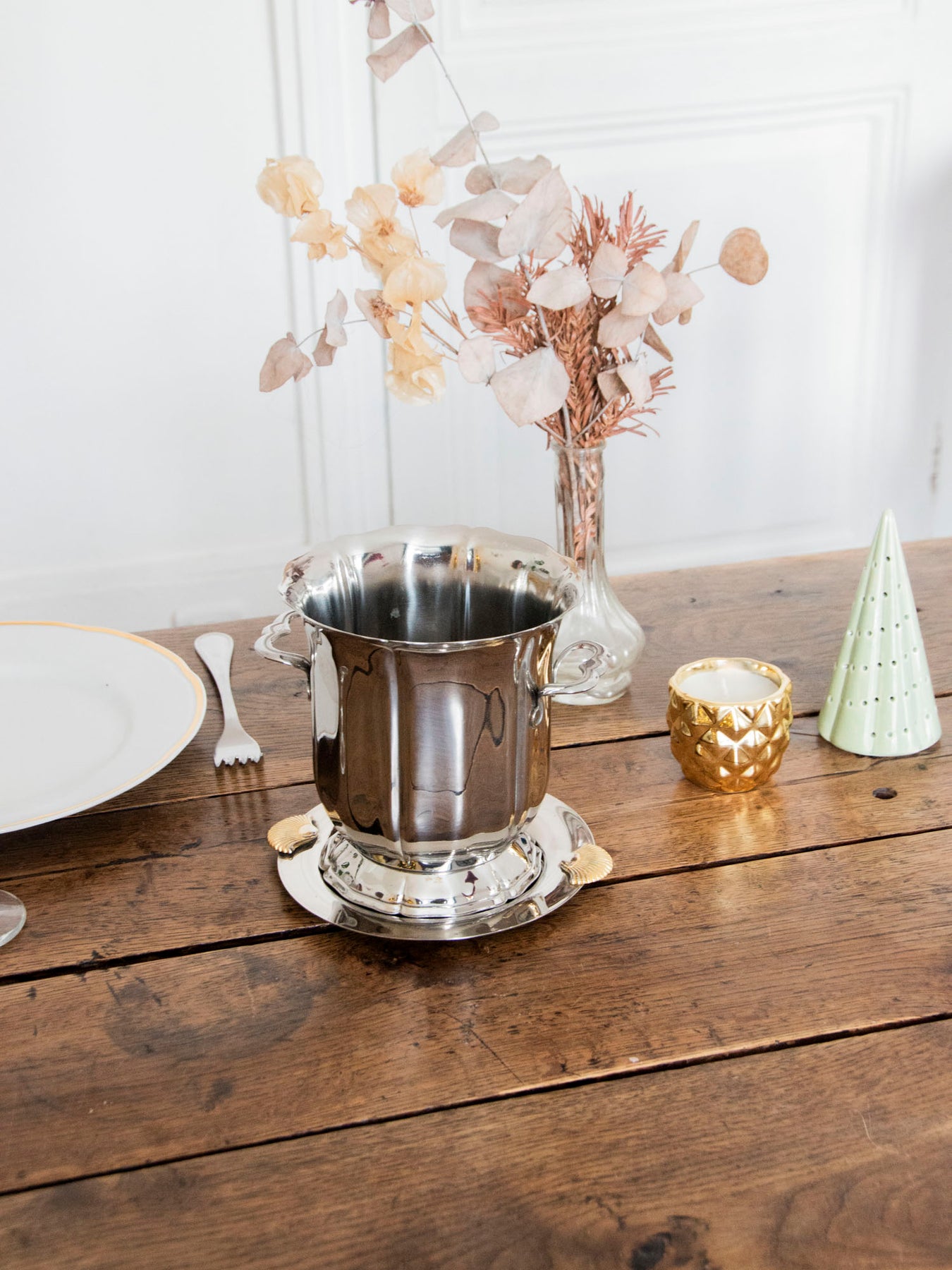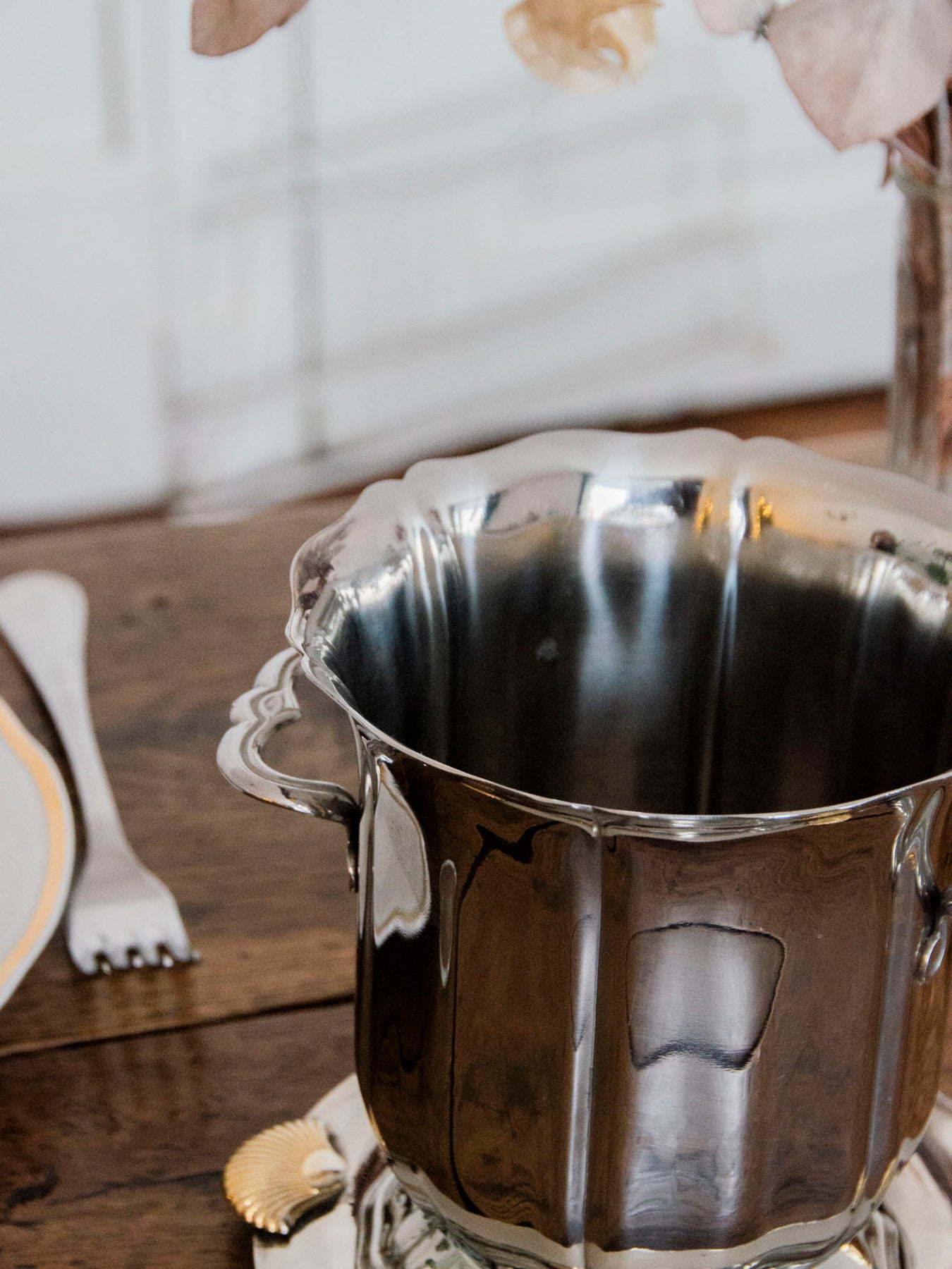 Add a touch of elegance with this compact stainless steel champagne bucket, designed to blend discreetly into a table or bar. Perfect for keeping a bottle chilled, its manageable size and small handles allow for easy handling and refined serving. Its polished steel creates a sleek, contemporary silhouette, ideal for an intimate dinner or a casual gathering. Practical and durable, it's perfect for everyday use without cluttering your space. Sold without the small plate underneath.