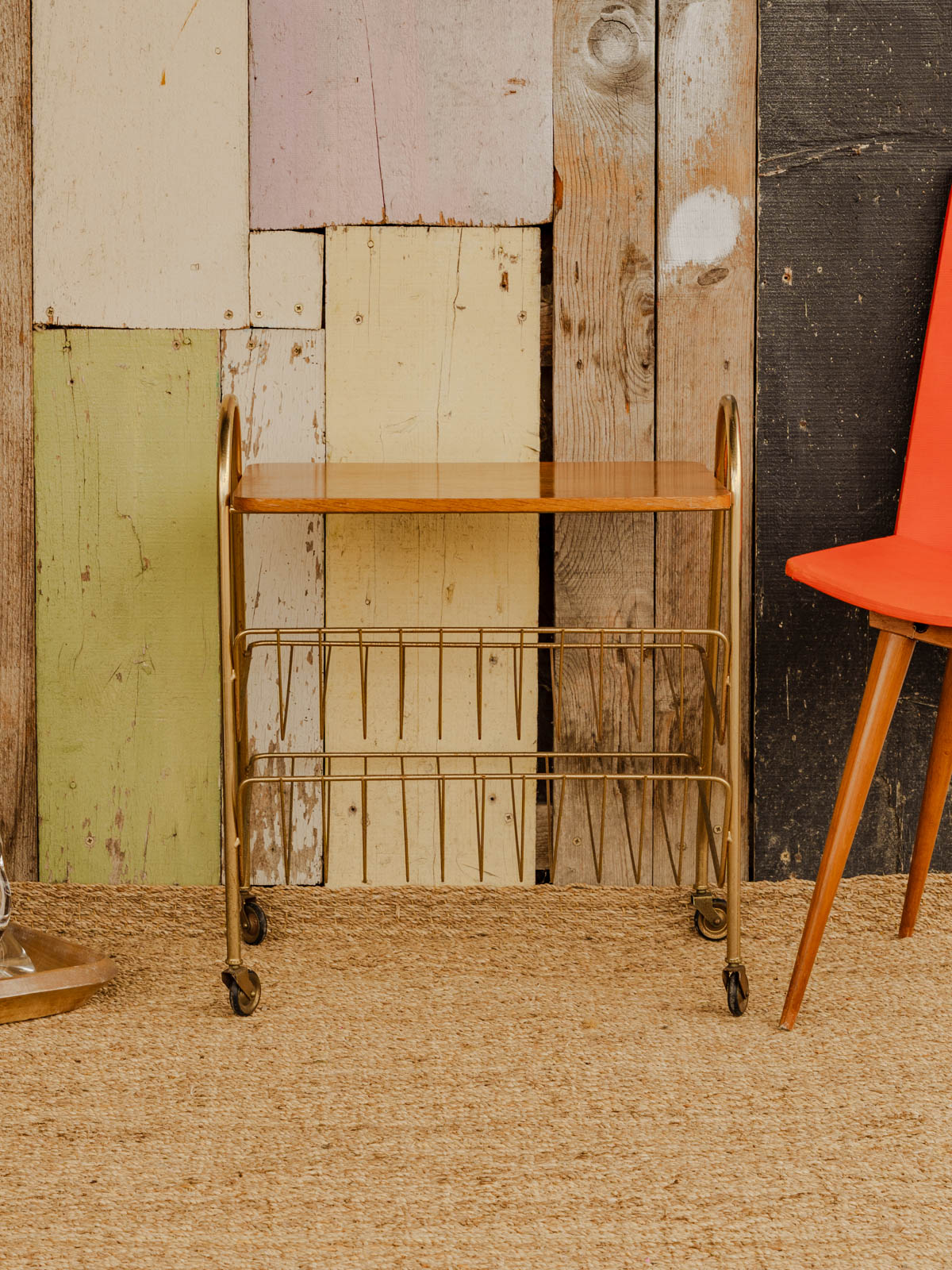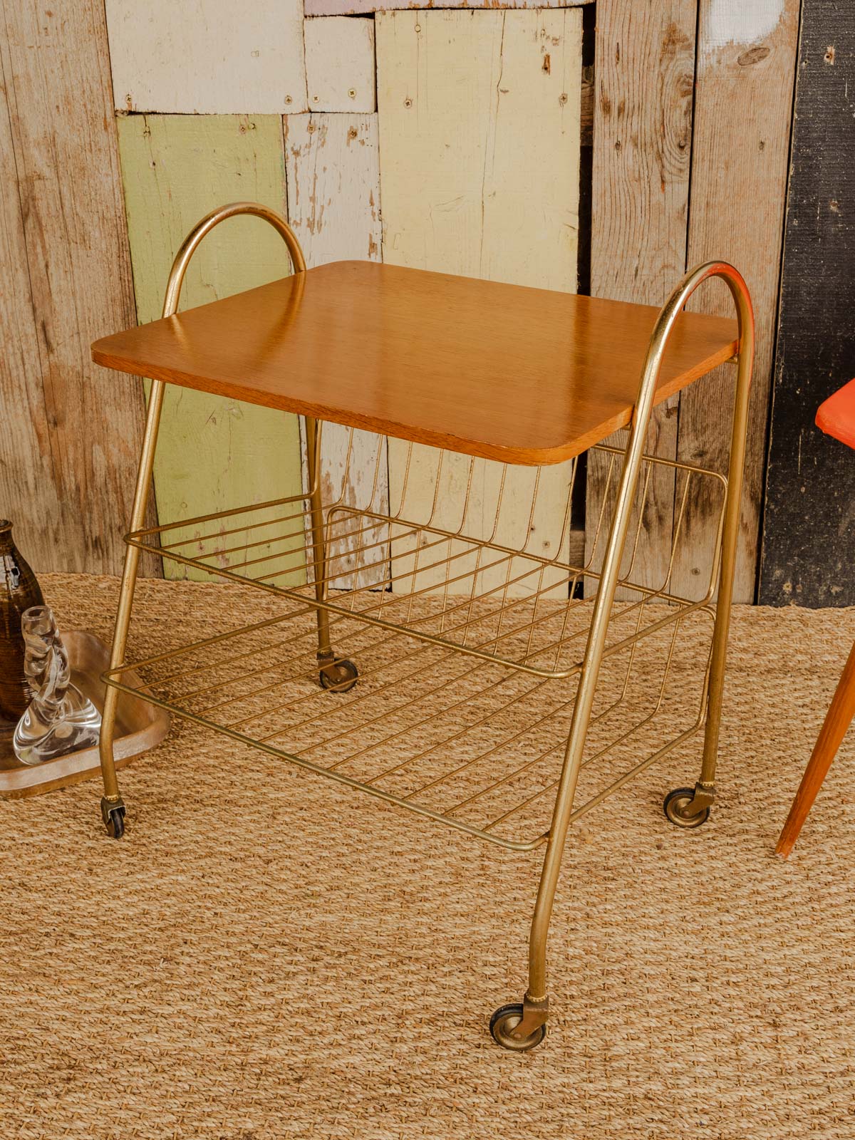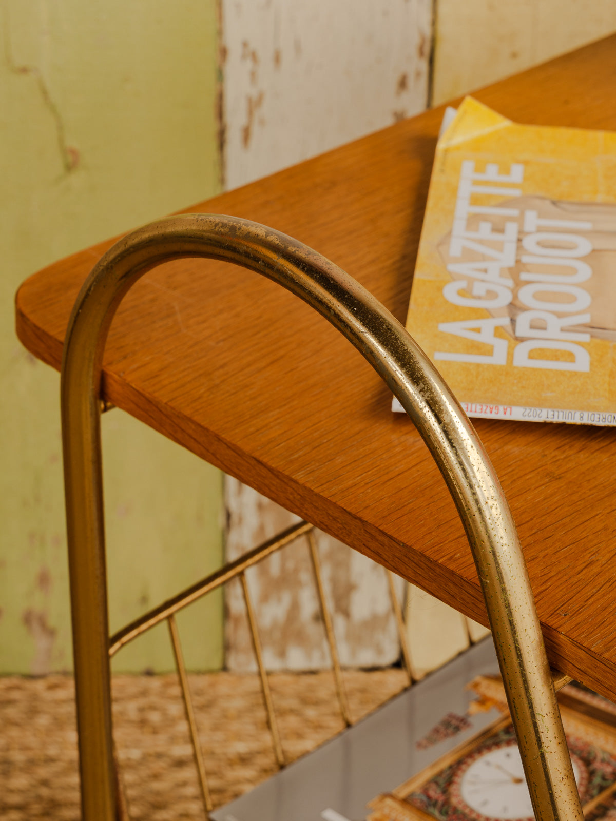 Ajoutez cette desserte au plateau en bois, ponctuée d'un sous-plateau en grillage de métal doré qui apporte une touche raffinée. Son format et ses deux sous-plateaux, faisant office de porte-magazine, offrent des solutions de rangement modulables pour le salon ou la salle à manger. Équipée de roues discrètes, elle se déplace aisément pour accompagner un apéritif, le service du café ou pour créer un coin lecture. Son alliance de bois et de métal crée une ambiance chaleureuse et graphique.