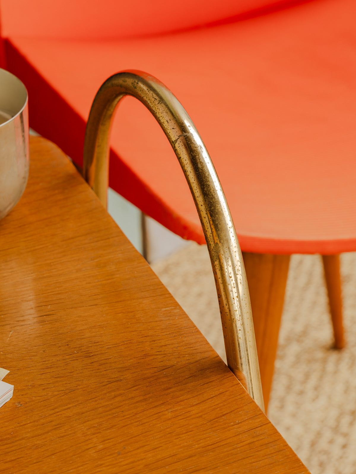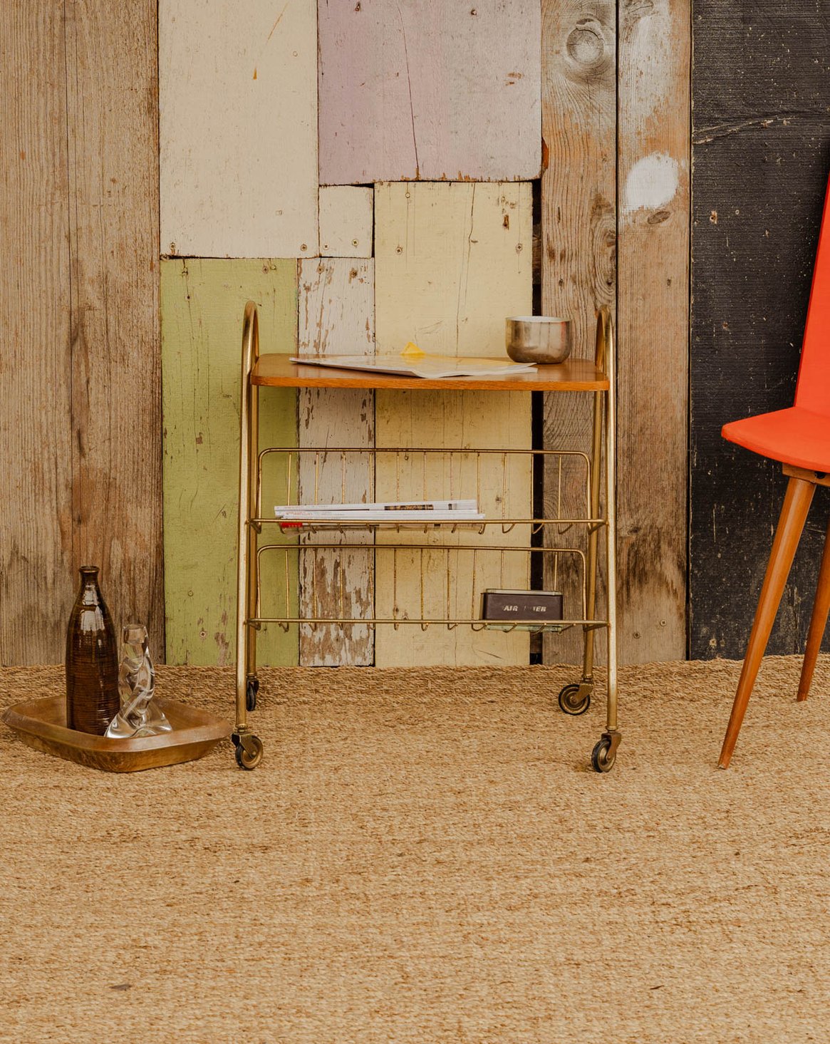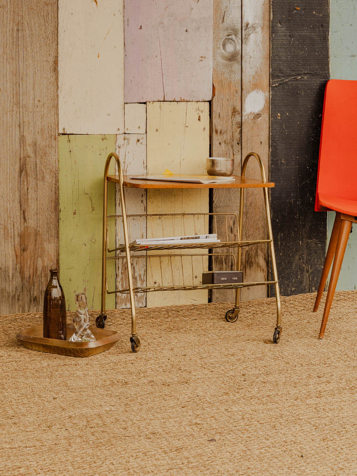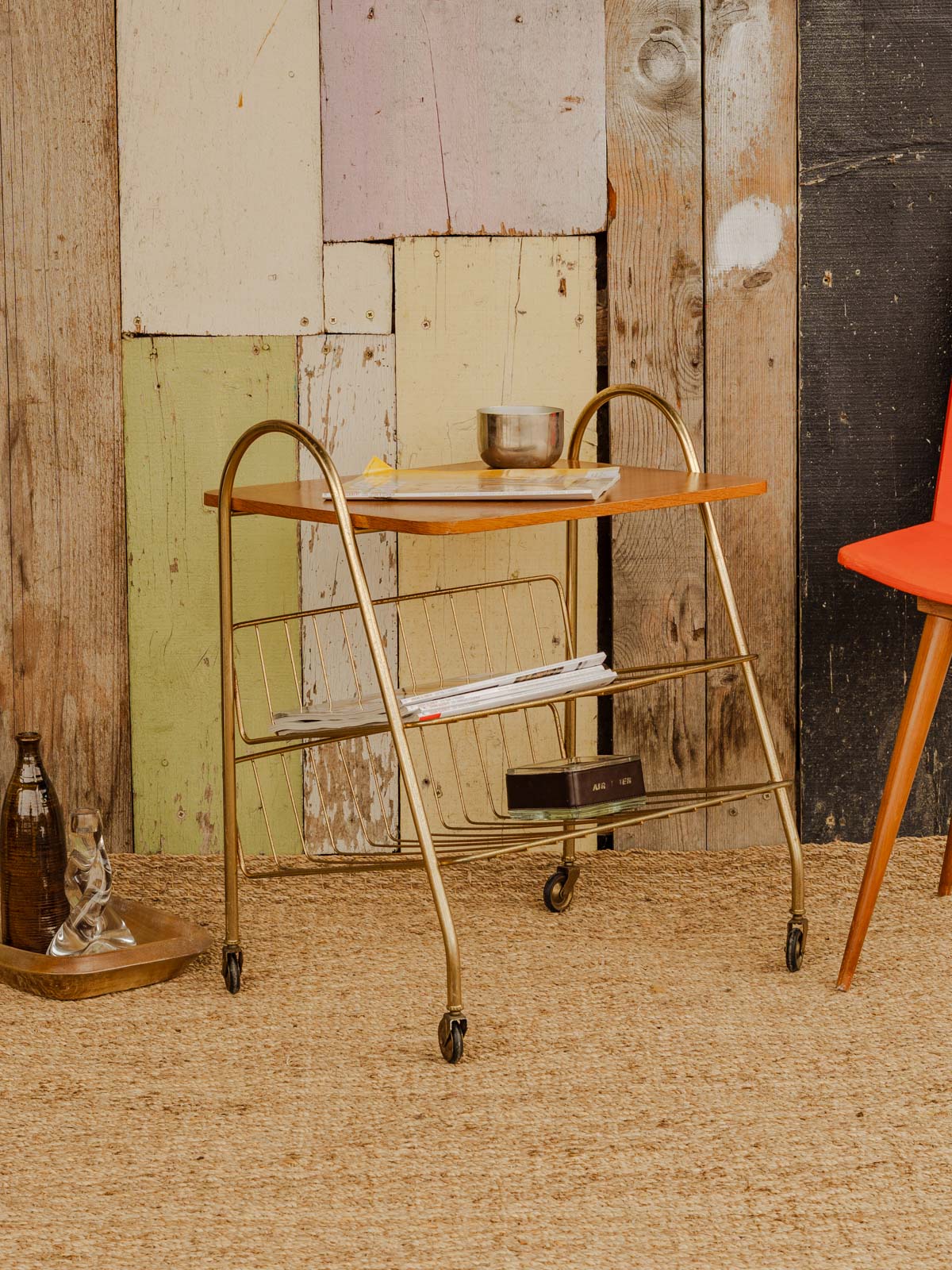 Ajoutez cette desserte au plateau en bois, ponctuée d'un sous-plateau en grillage de métal doré qui apporte une touche raffinée. Son format et ses deux sous-plateaux, faisant office de porte-magazine, offrent des solutions de rangement modulables pour le salon ou la salle à manger. Équipée de roues discrètes, elle se déplace aisément pour accompagner un apéritif, le service du café ou pour créer un coin lecture. Son alliance de bois et de métal crée une ambiance chaleureuse et graphique.