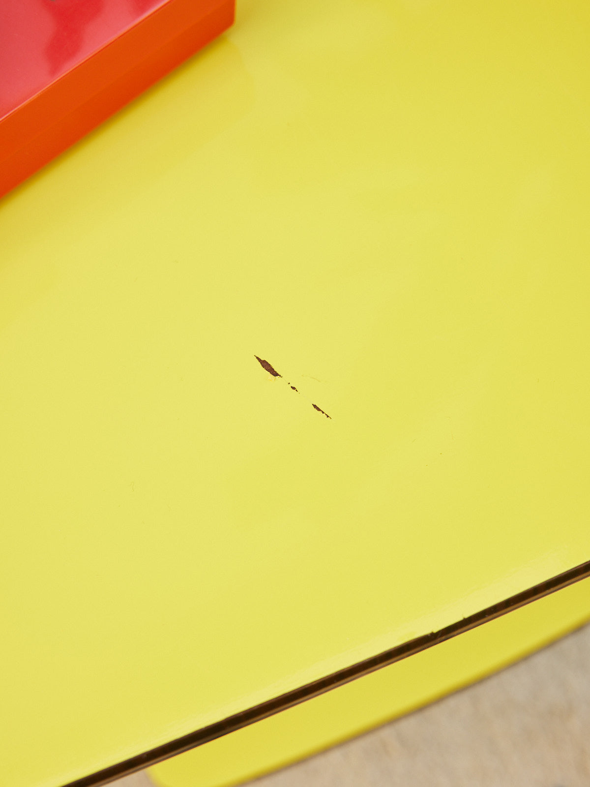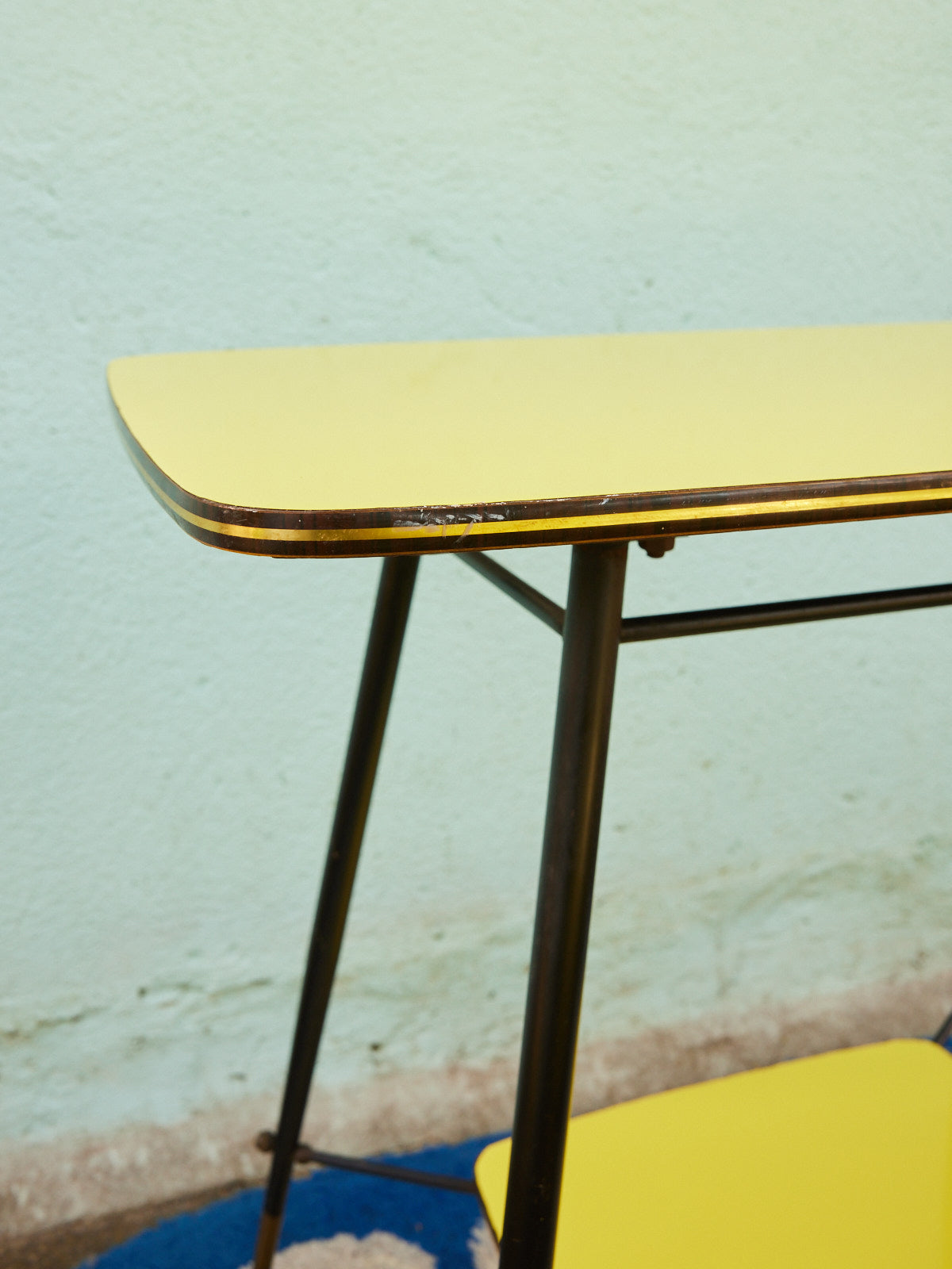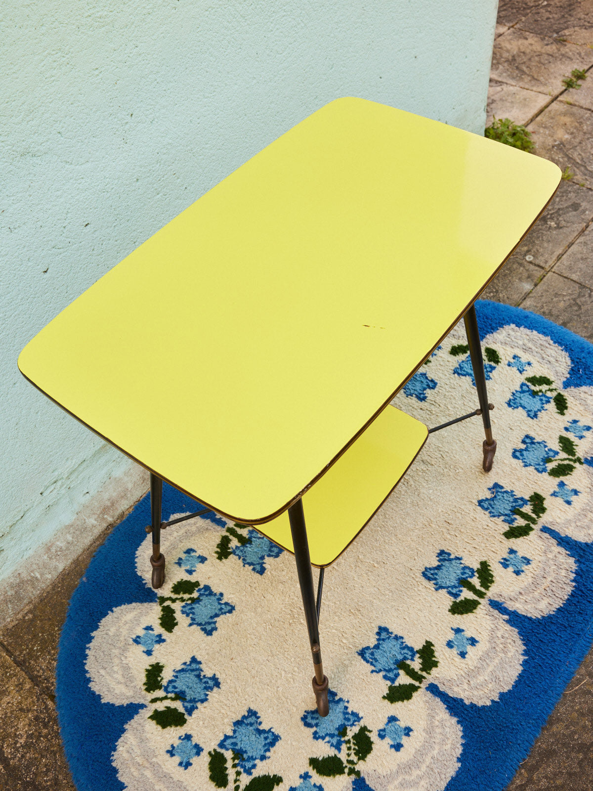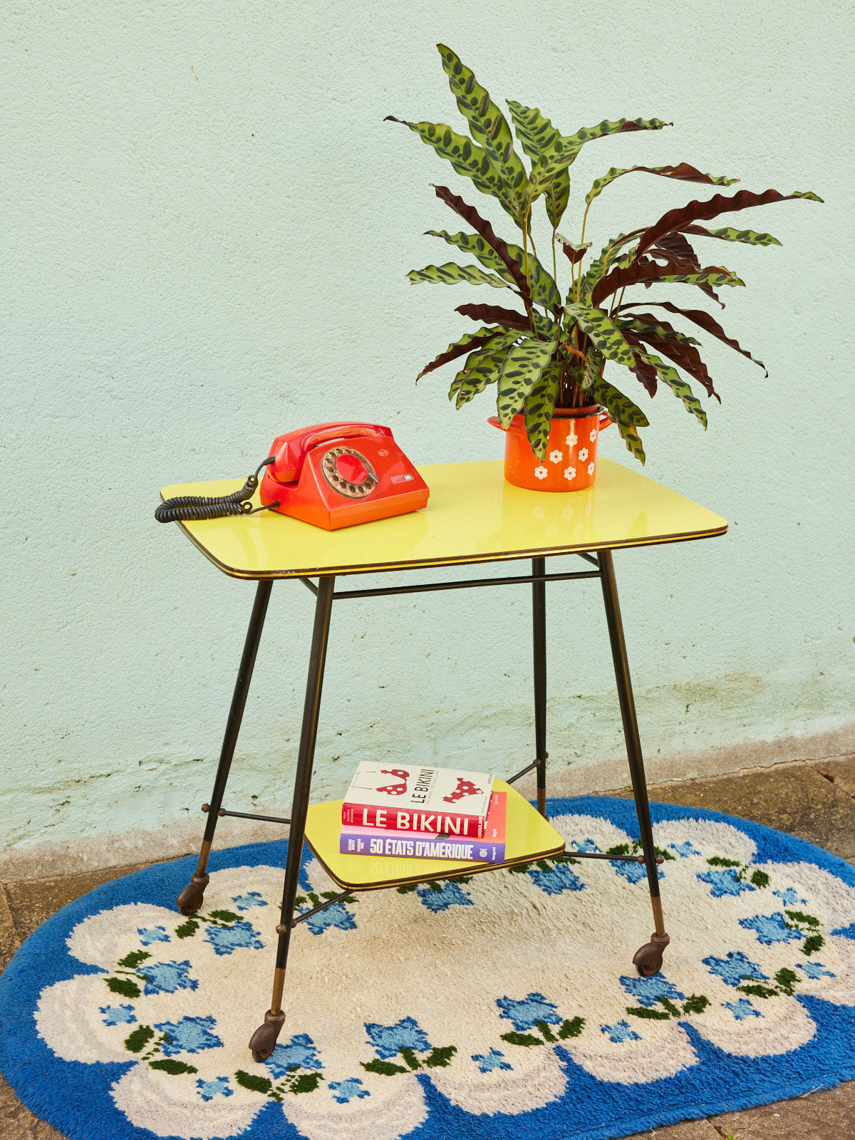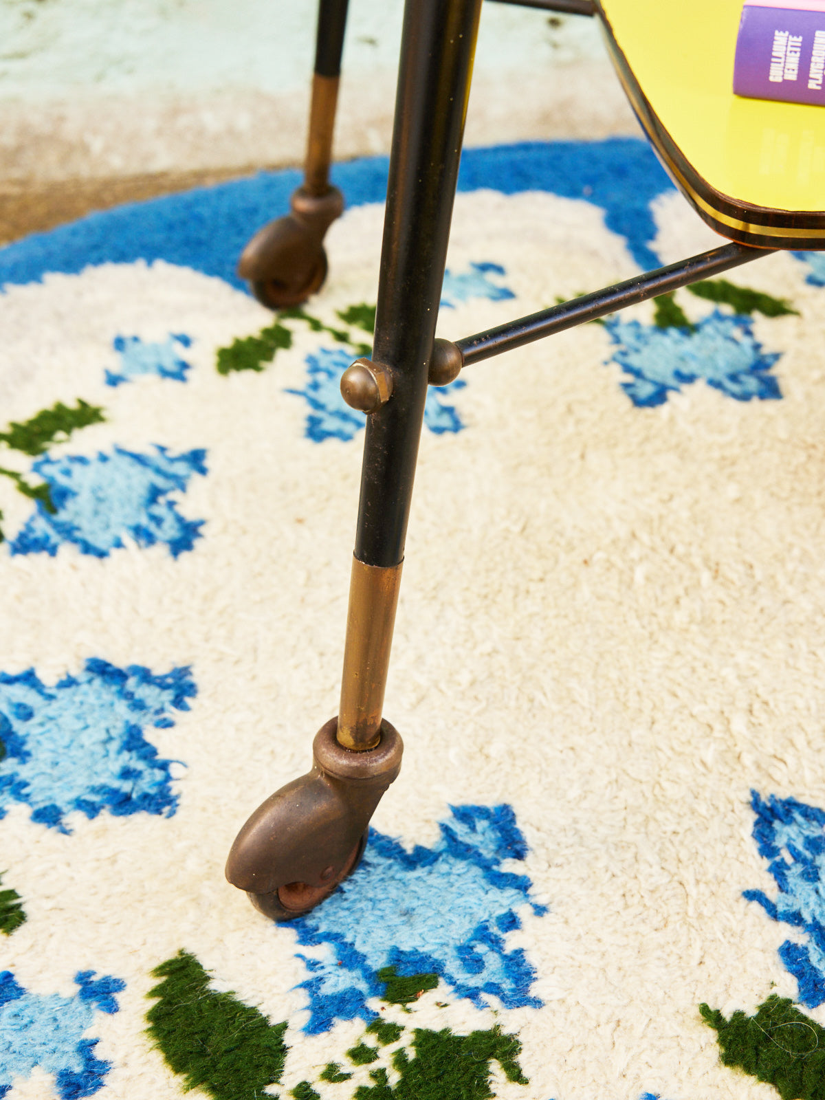 Bring a warm, retro touch with this wooden serving cart adorned with a brass trim and yellow-covered trays. Its natural wood and the soft brilliance of the brass create an elegant contrast, perfect for serving drinks or displaying dishes and decorative objects. Compact in size but with generous trays, it fits into the living room, kitchen, or an entryway to create a sunny and refined atmosphere. Small defect on the tray.