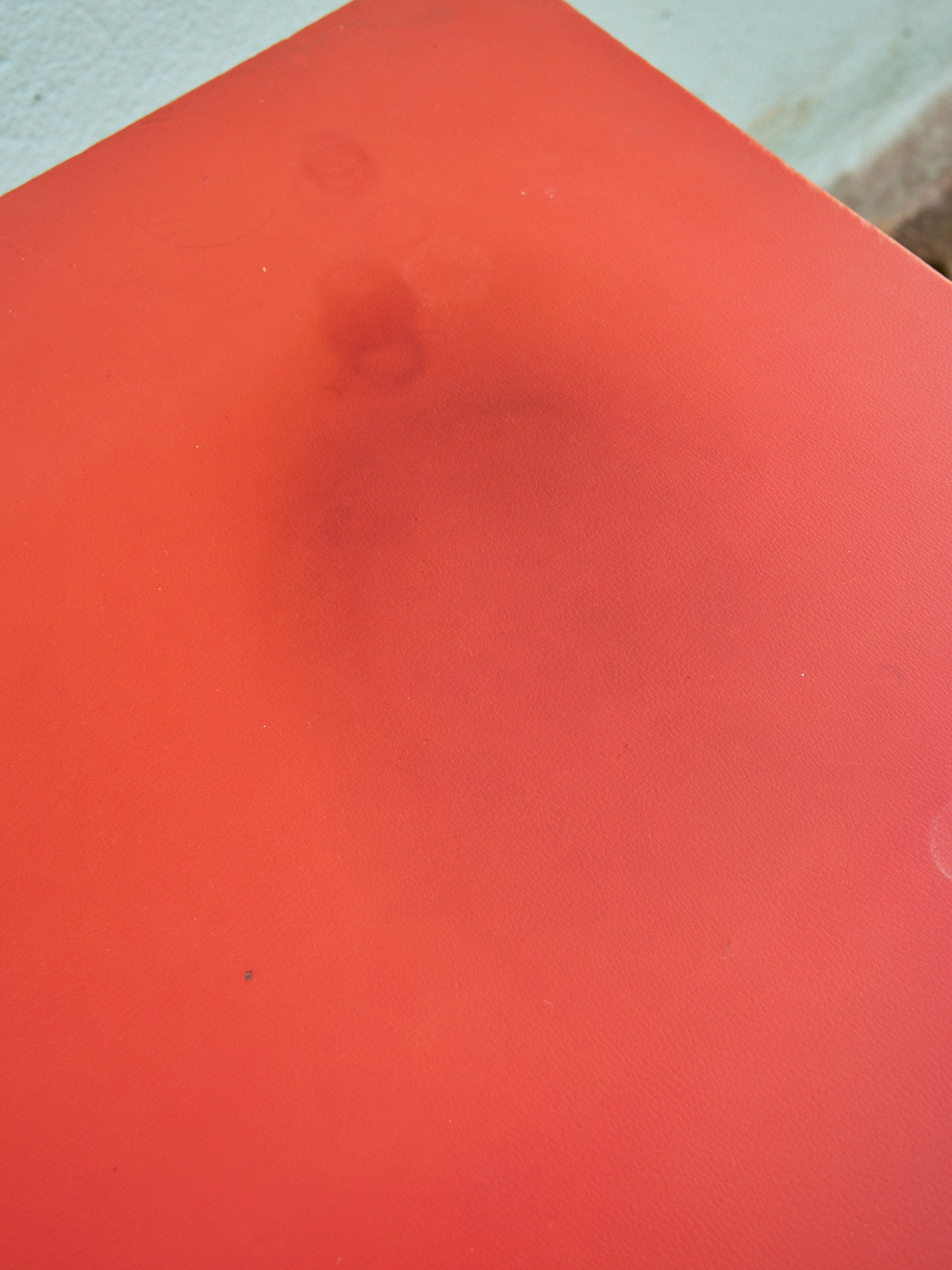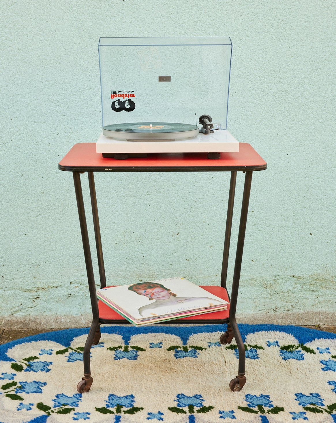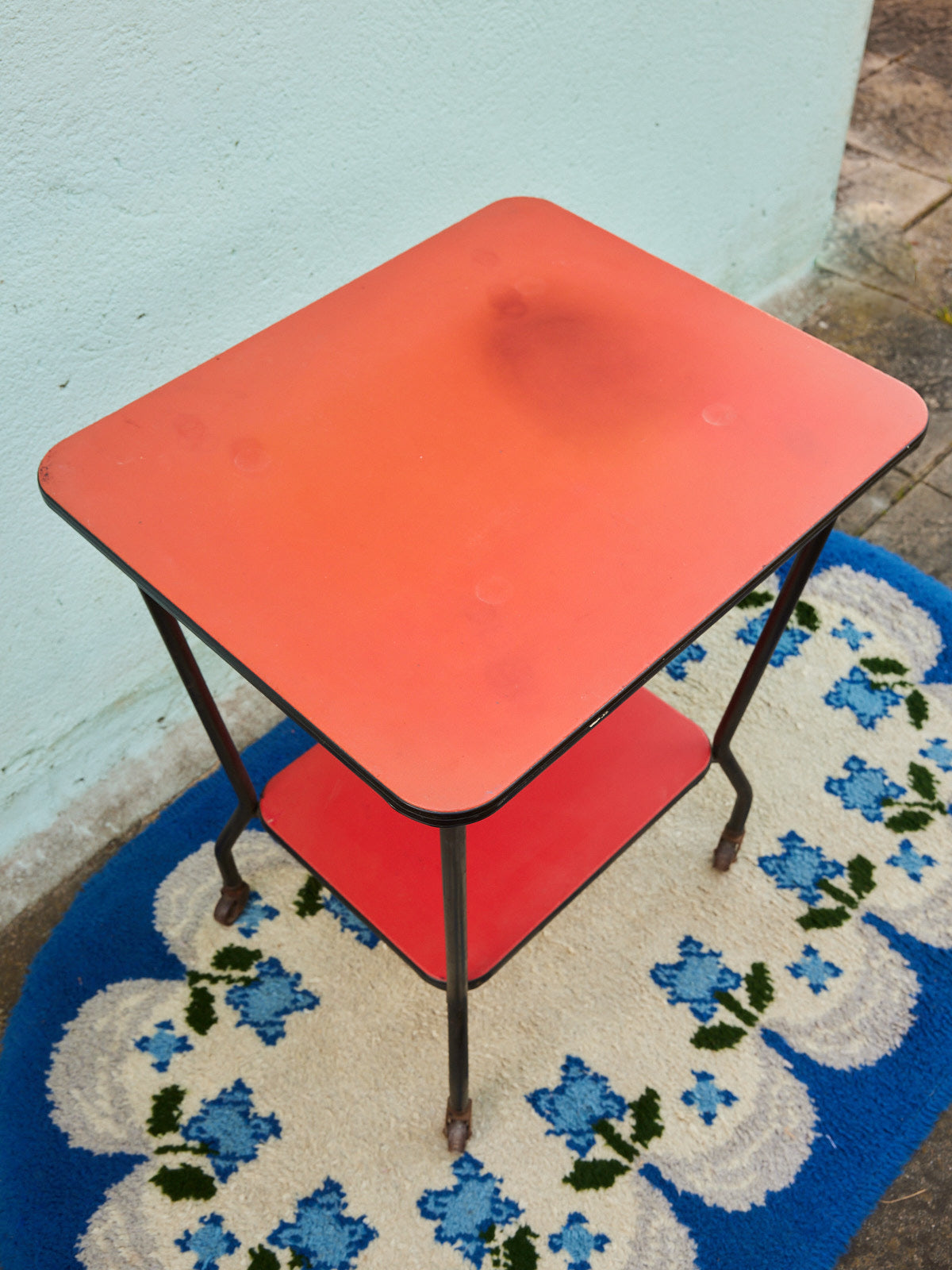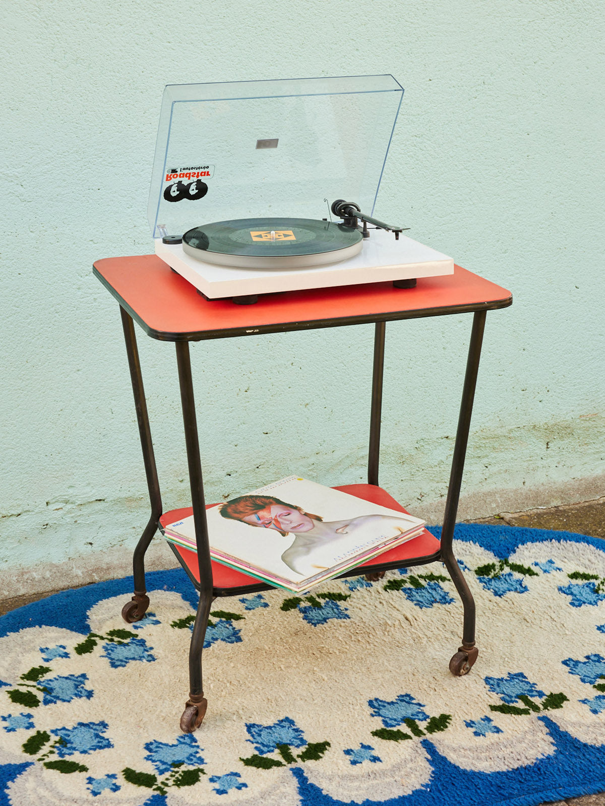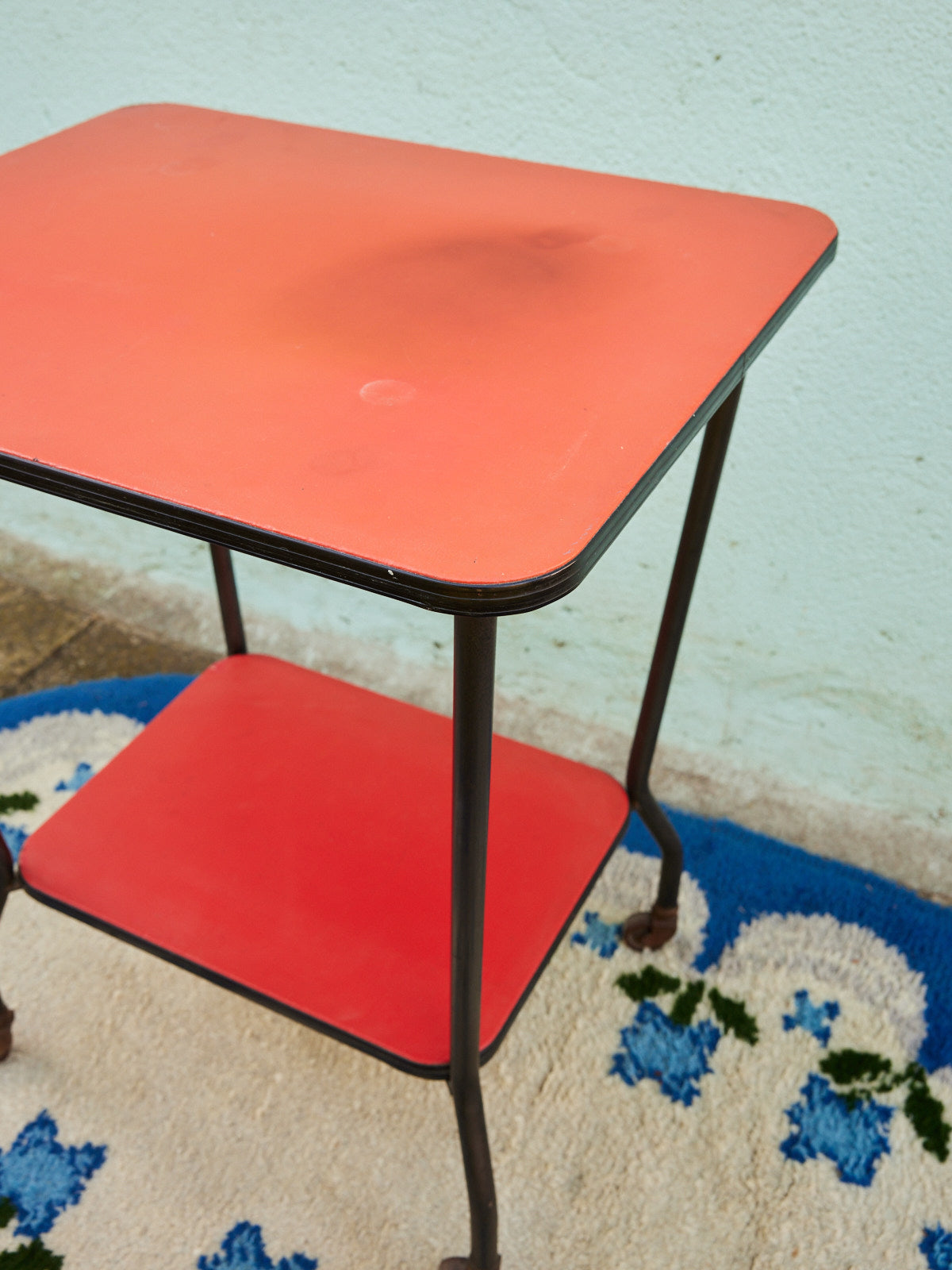 Bring a retro and graphic touch with this vinyl cart featuring a red skai top and metal structure, designed to elegantly display records and a turntable. Its compact size allows it to fit into a living room corner or office, while the metal gives it an airy and stable silhouette. The contrast between the vibrant skai and the sober metal creates a warm and contemporary atmosphere. Some signs of wear inherited from its previous vinyl owner.