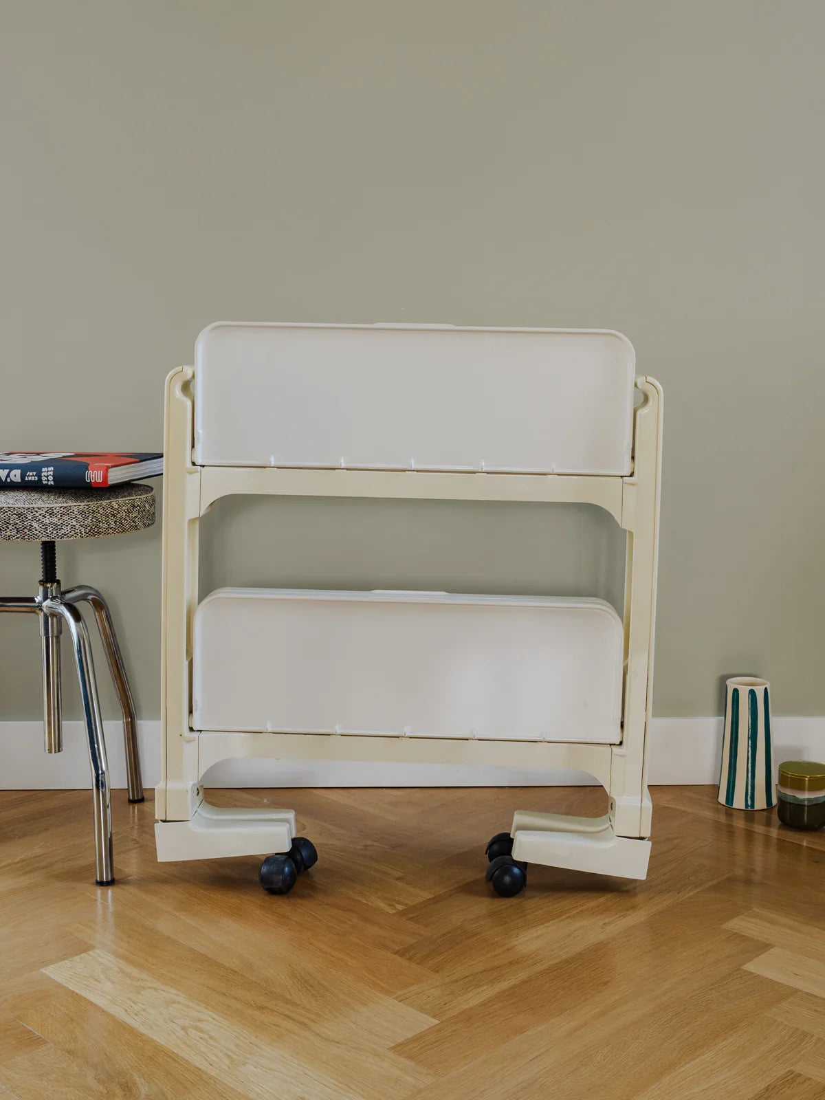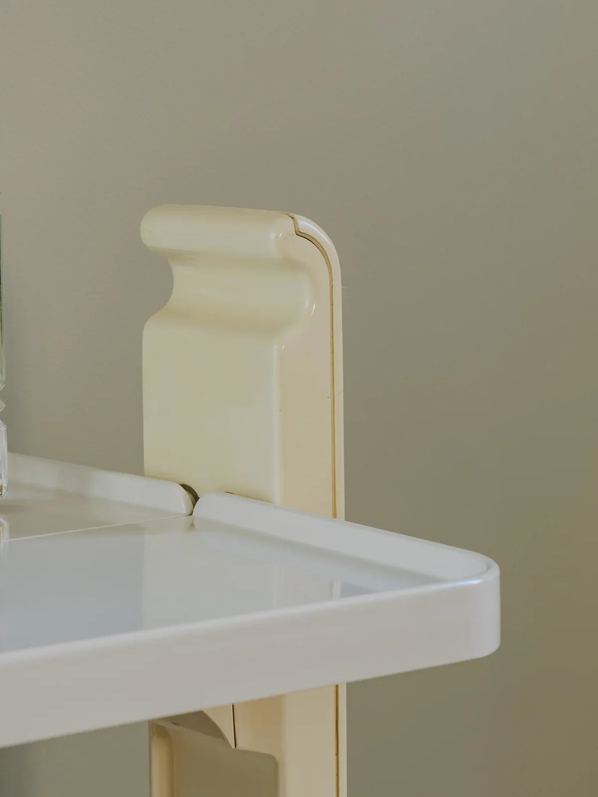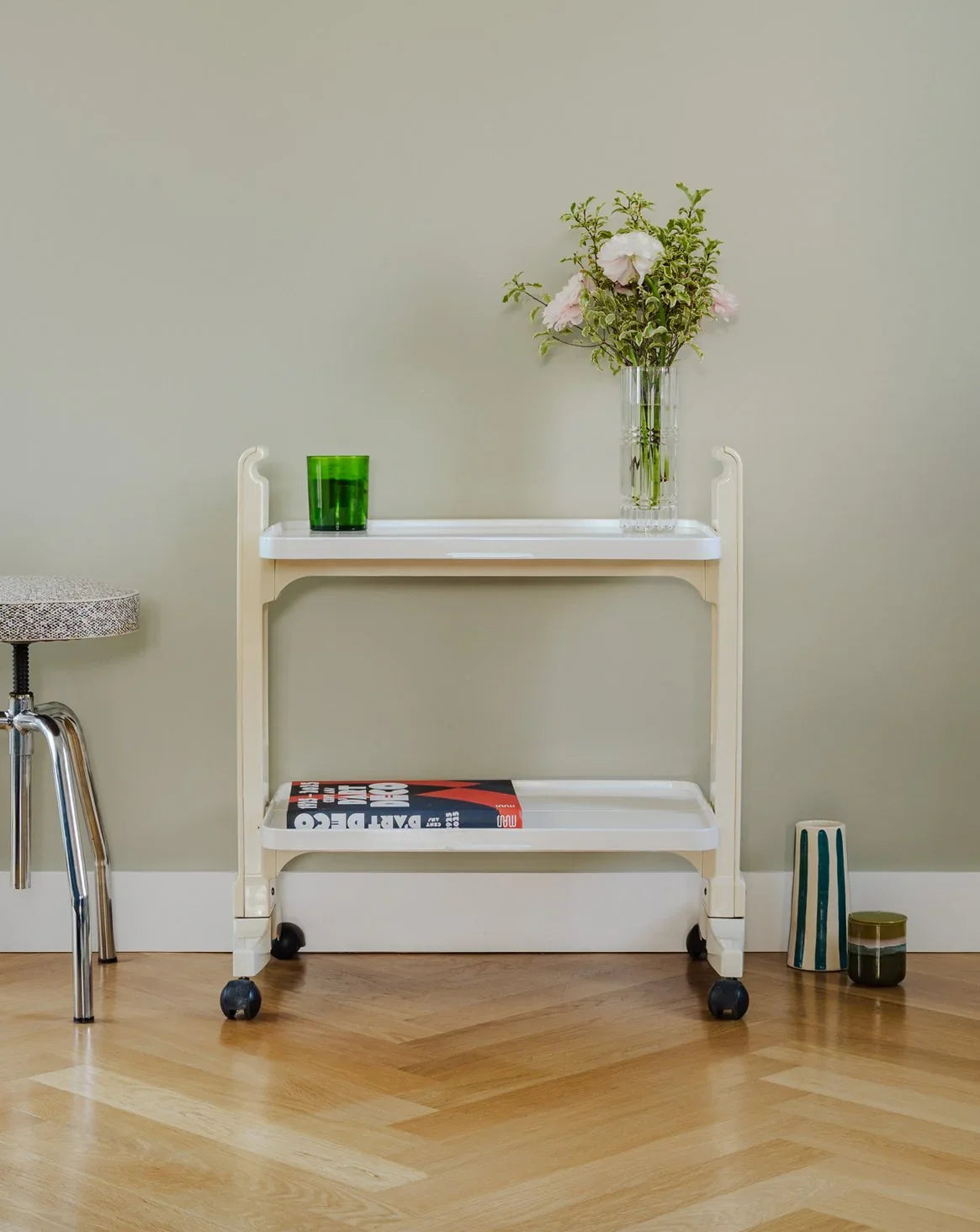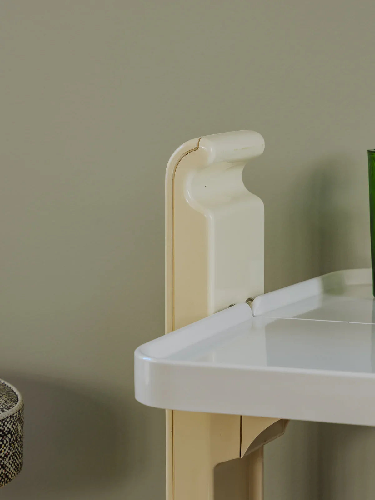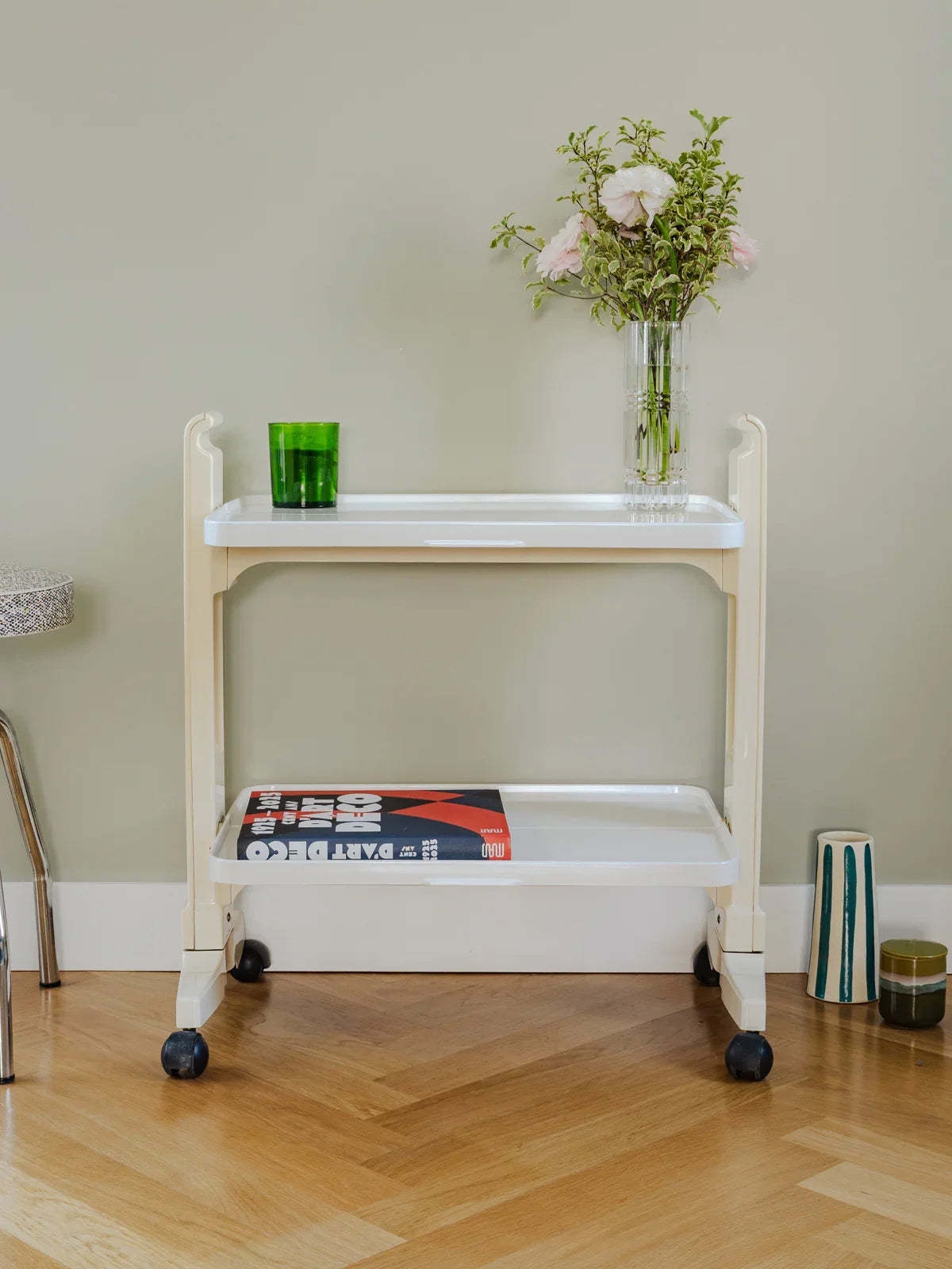 Choose the Carrara & Matta Biplano rolling serving cart, crafted from white and ecru plastic, with its light and contemporary design. Its two shelves offer ample serving space for dishes, drinks, or utensils, while the folding mechanism allows it to be neatly folded for convenient storage—ideal for the kitchen or living room for elegant entertaining. Easy to clean and maneuverable thanks to its casters, it combines practicality and understated style. There are a few signs of wear: one caster arm can only be operated manually.