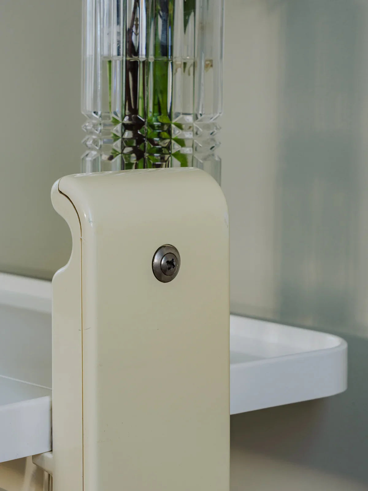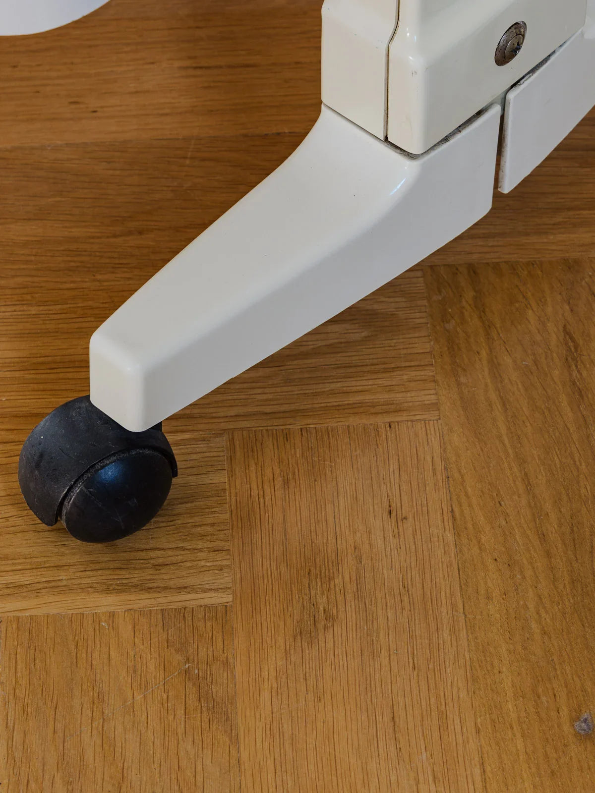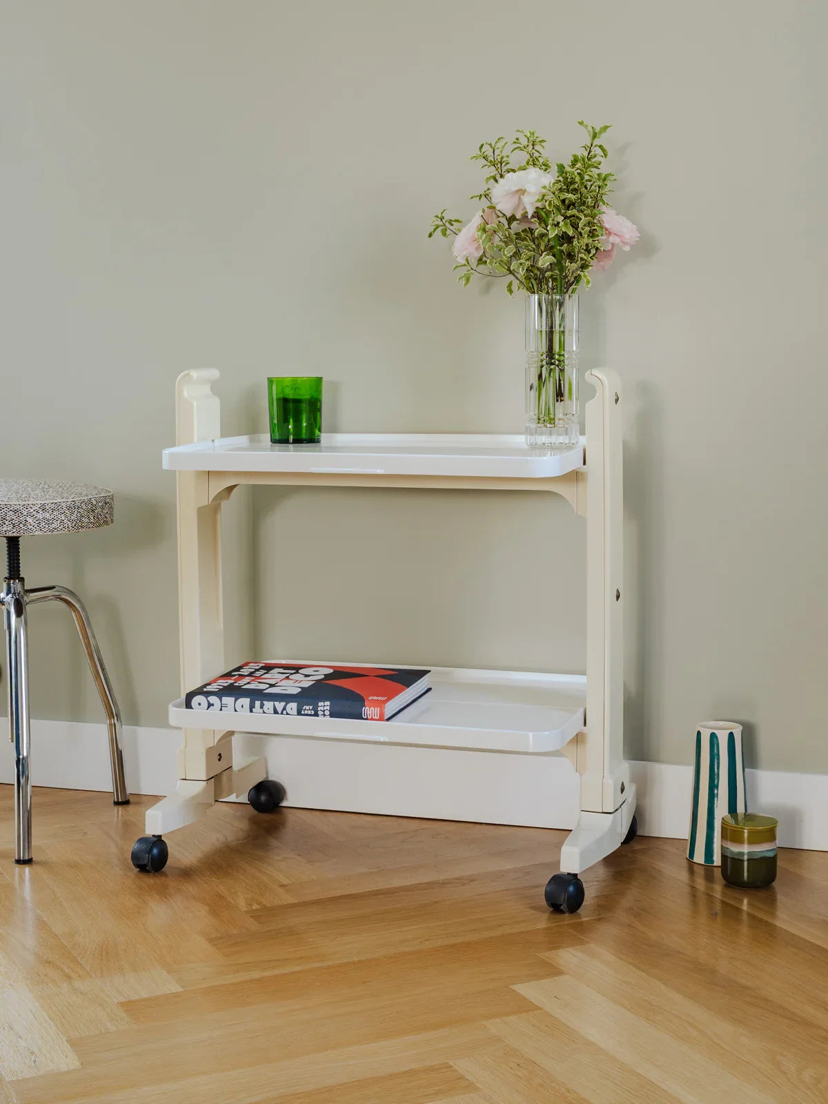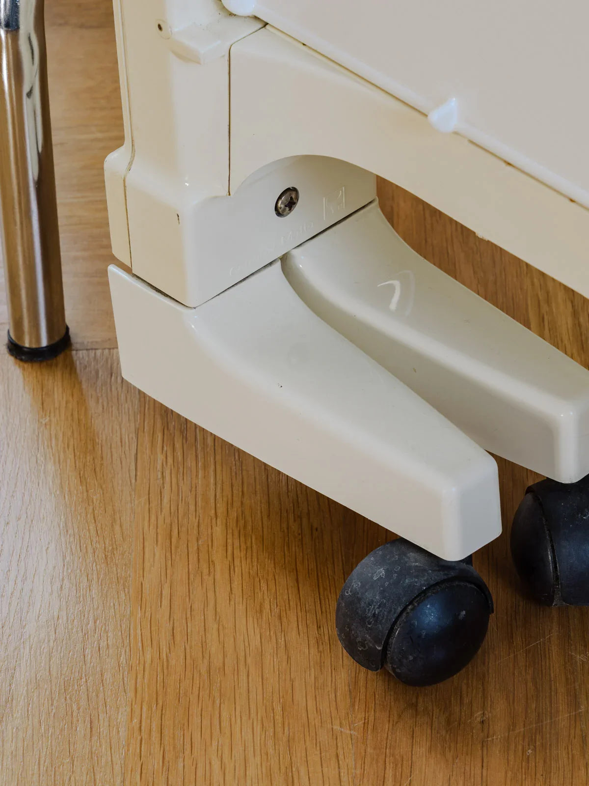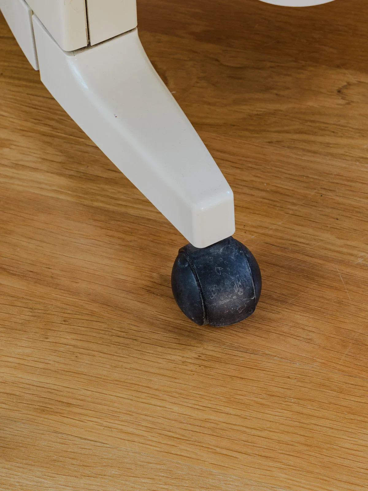 Choose the Carrara & Matta Biplano rolling serving cart, crafted from white and ecru plastic, with its light and contemporary design. Its two shelves offer ample serving space for dishes, drinks, or utensils, while the folding mechanism allows it to be neatly folded for convenient storage—ideal for the kitchen or living room for elegant entertaining. Easy to clean and maneuverable thanks to its casters, it combines practicality and understated style. There are a few signs of wear: one caster arm can only be operated manually.