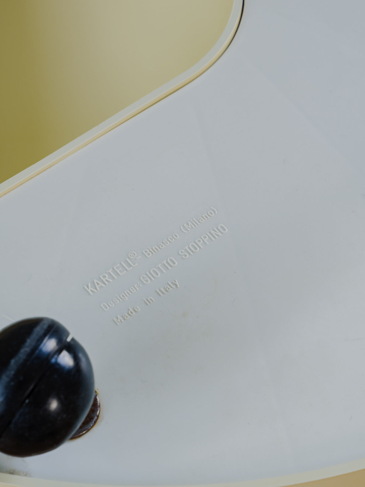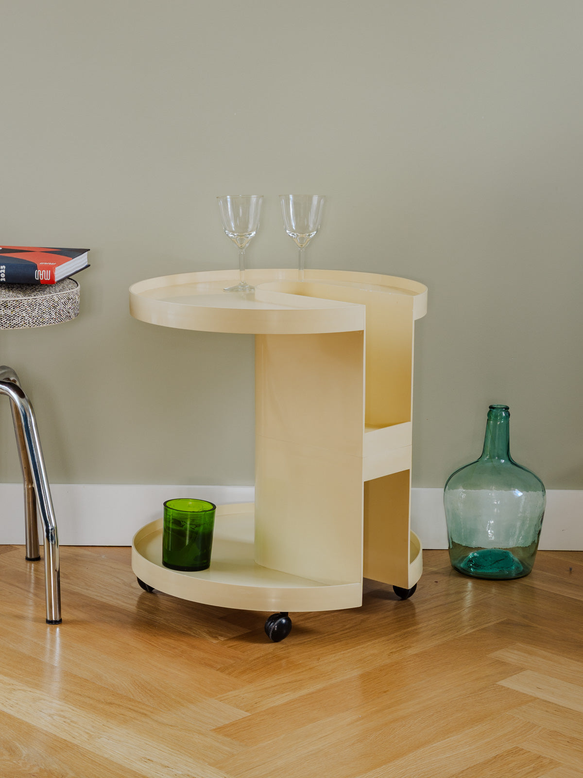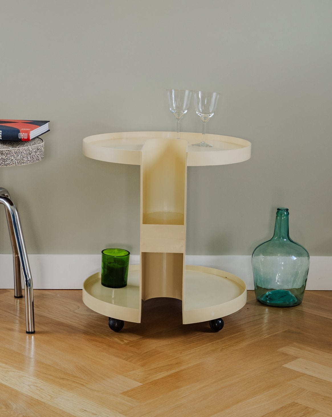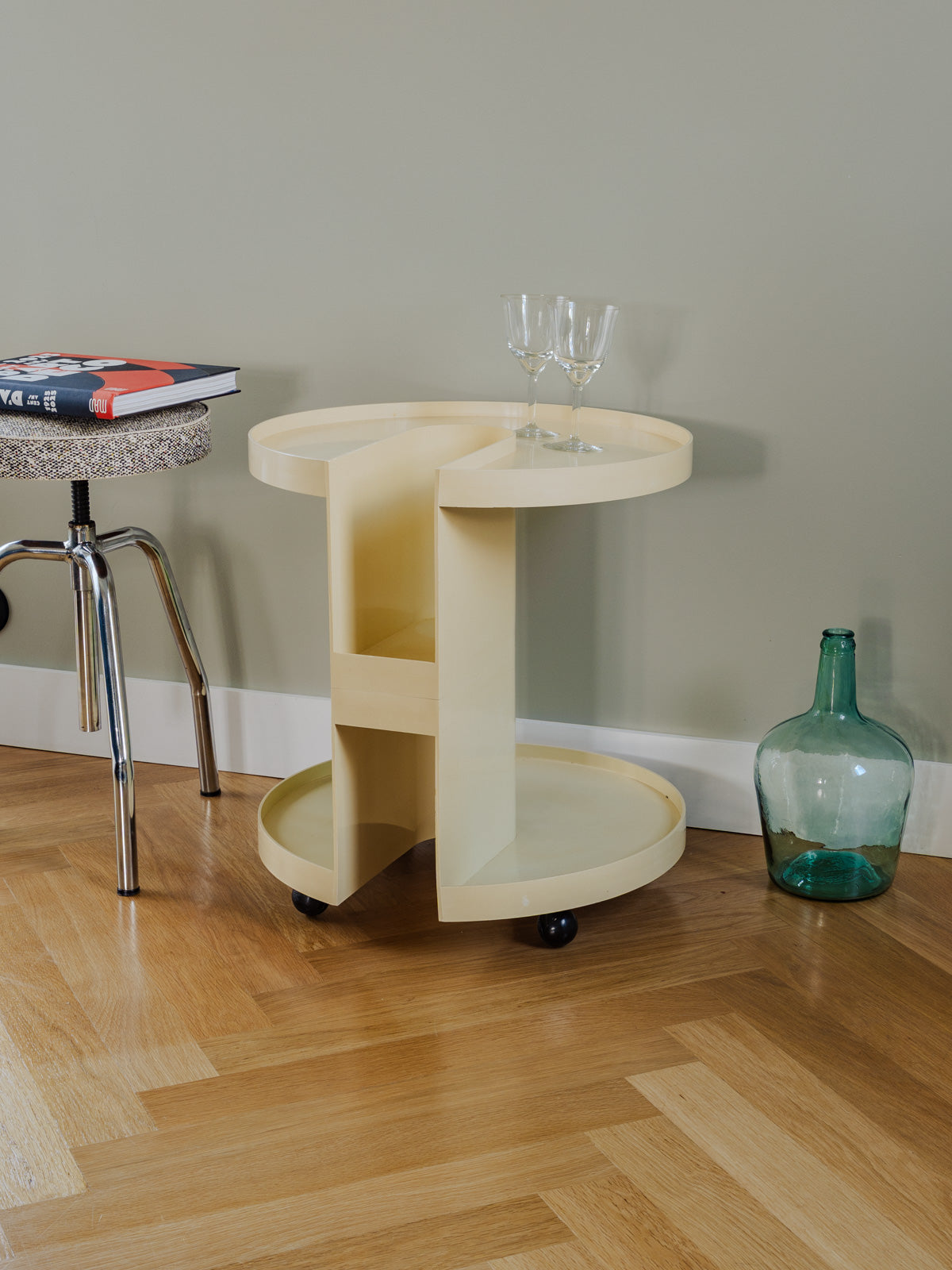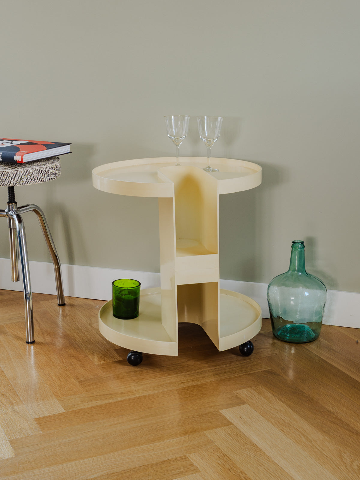 Embrace this plastic bar trolley designed by Giotto Stoppino for Kartell, in a subtly patinated ecru color, which combines clean lines with contemporary functionality. Its two shelves and central compartment, designed to hold up to three bottles, offer modular storage—perfect for displaying drinks, books, or magazines—while its casters make it easy to move and position in a corner of the living room or kitchen. Its silhouette adds a discreet design touch to the space. Some signs of age are present.