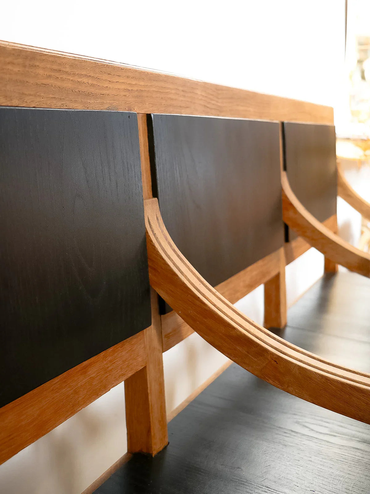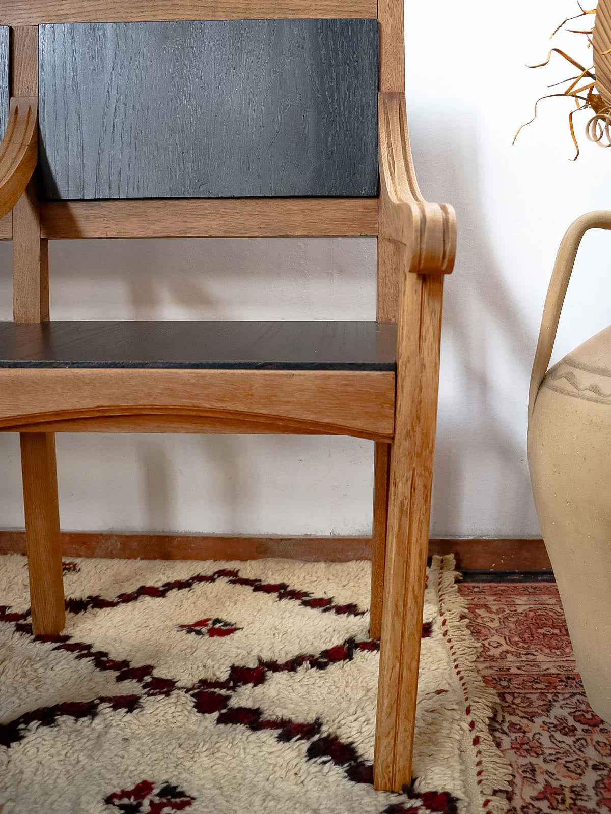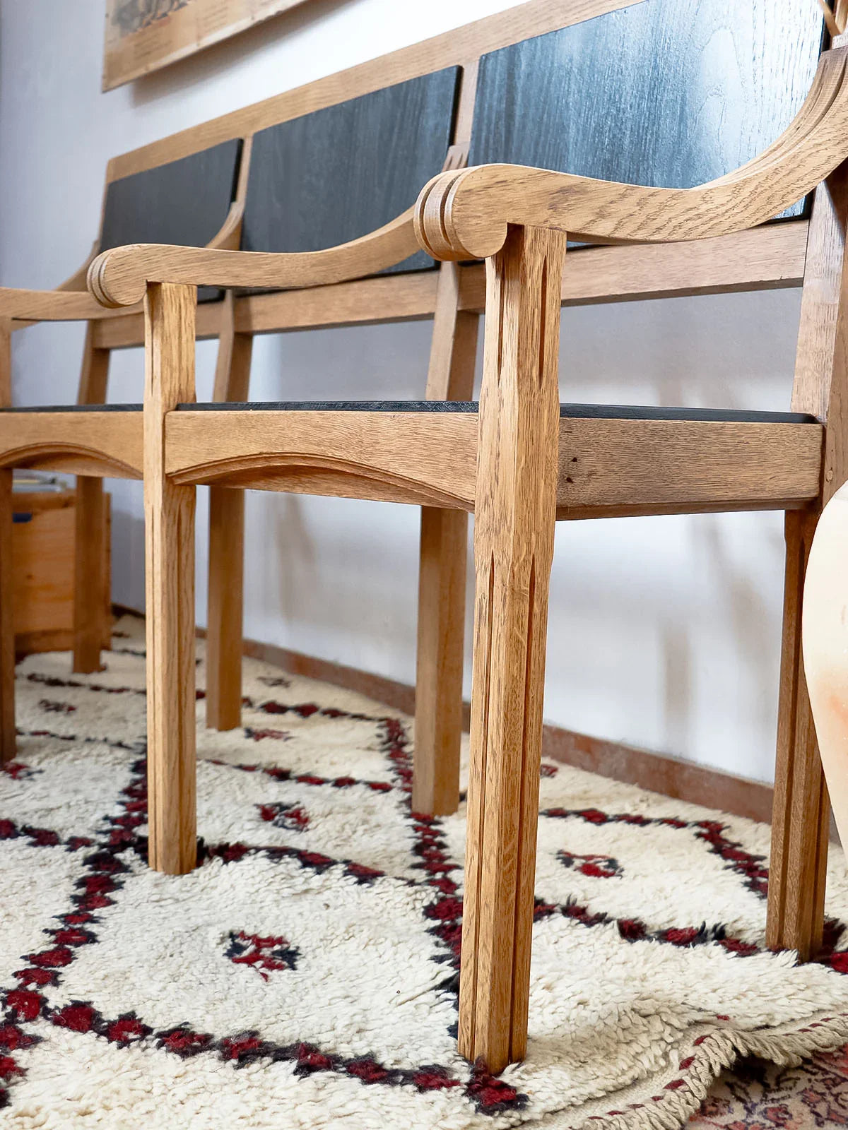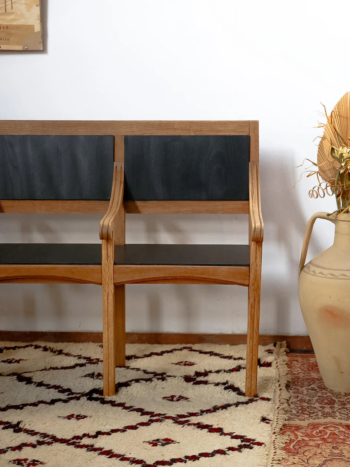 Embrace this oak bench dating from 1900, structured around three seats of slightly different proportions and finished with a subtle contrast between dark wood and a black backrest. Its molded armrests and pegged joints demonstrate traditional craftsmanship, adding depth and character to a piece that is both solid and refined. Ideal for creating a grand entrance or adding visual interest to a living room, it offers separate seating for several guests and fosters a warm and inviting atmosphere. Its natural patina lends a simple and authentic presence that blends seamlessly into any setting.