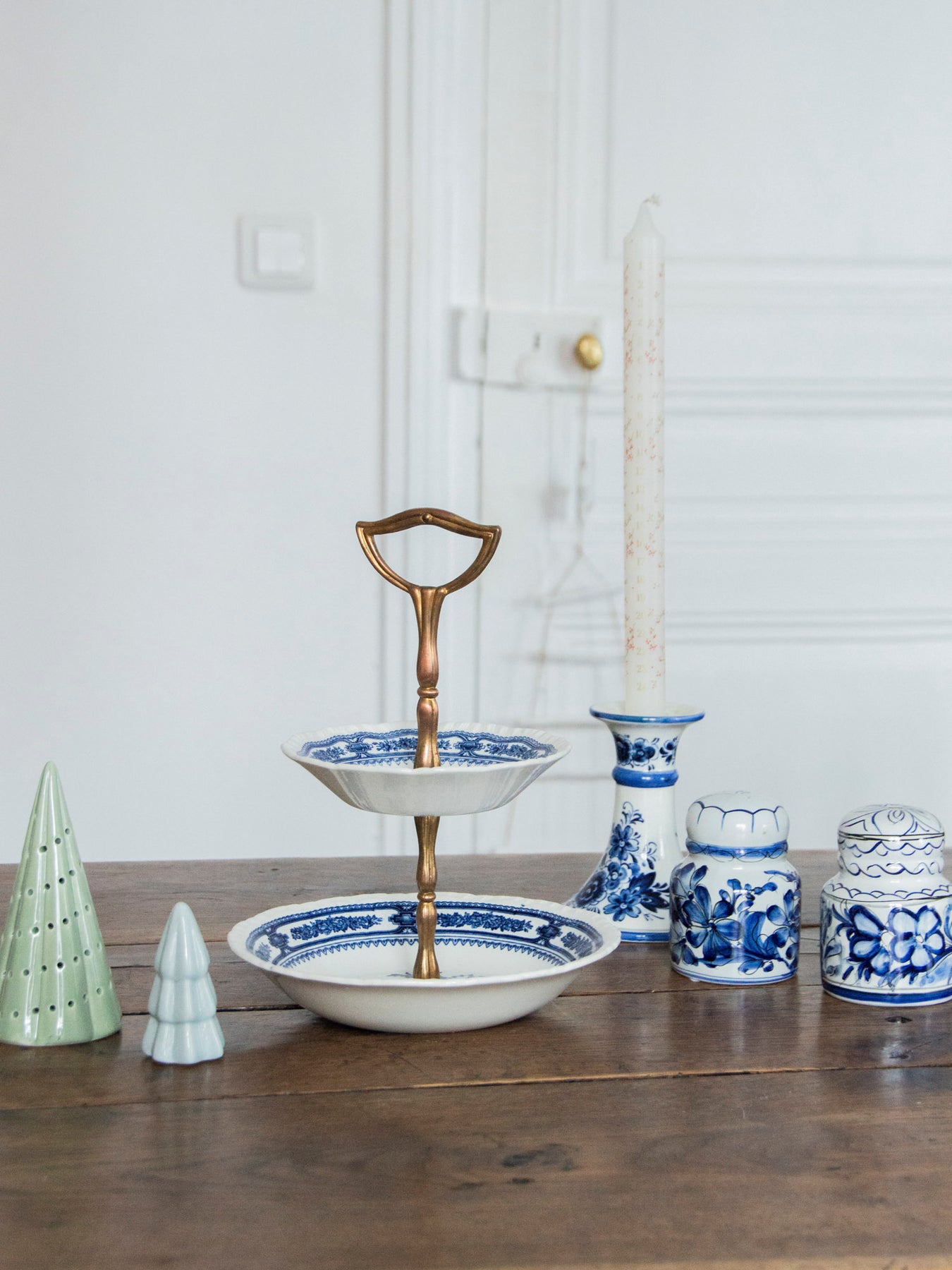 Elevate your desserts and petits fours with this two-tiered serving stand in blue earthenware and gold-tone metal, a perfect blend of delicacy and elegance. The earthenware plates feature a subtle painted background, while the gold-tone frame creates a light and refined silhouette. Its vertical design optimizes space and beautifully showcases petits fours, pastries, and appetizers for afternoon tea or aperitifs. Evoking a warm and sophisticated atmosphere, it invites sharing and enjoyment.