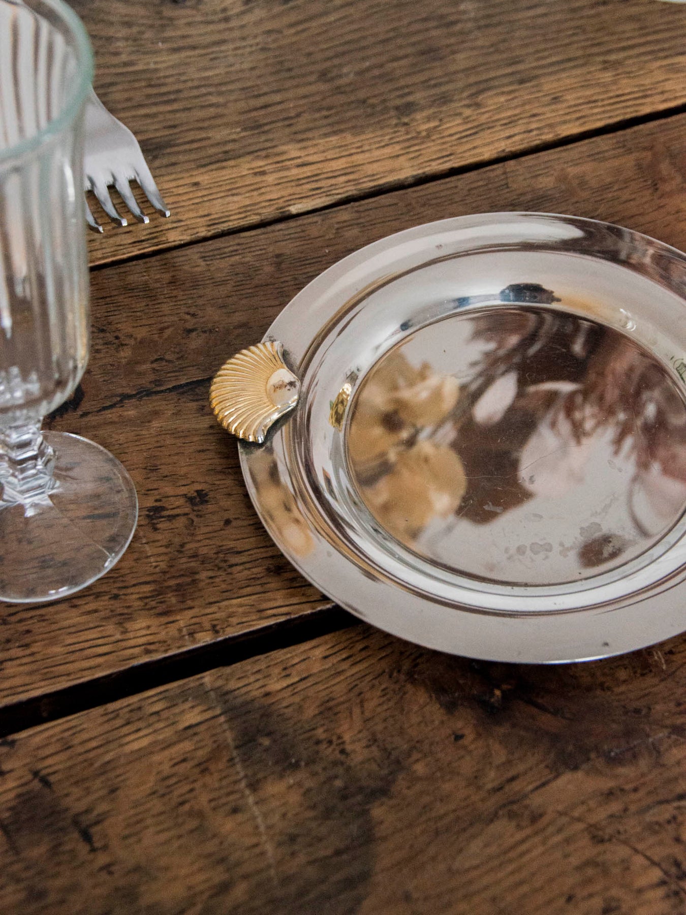 Elevate your table setting with this silver-plated platter, adorned with gilded shell handles that lend it an elegant nautical touch. Its compact size is perfect for holding appetizers, candles, or jewelry, making it ideal for an intimate gathering or a sophisticated presentation on a console table. The combination of silver and gold details creates a warm and refined ambiance, perfect for establishing an understated vintage-chic atmosphere.