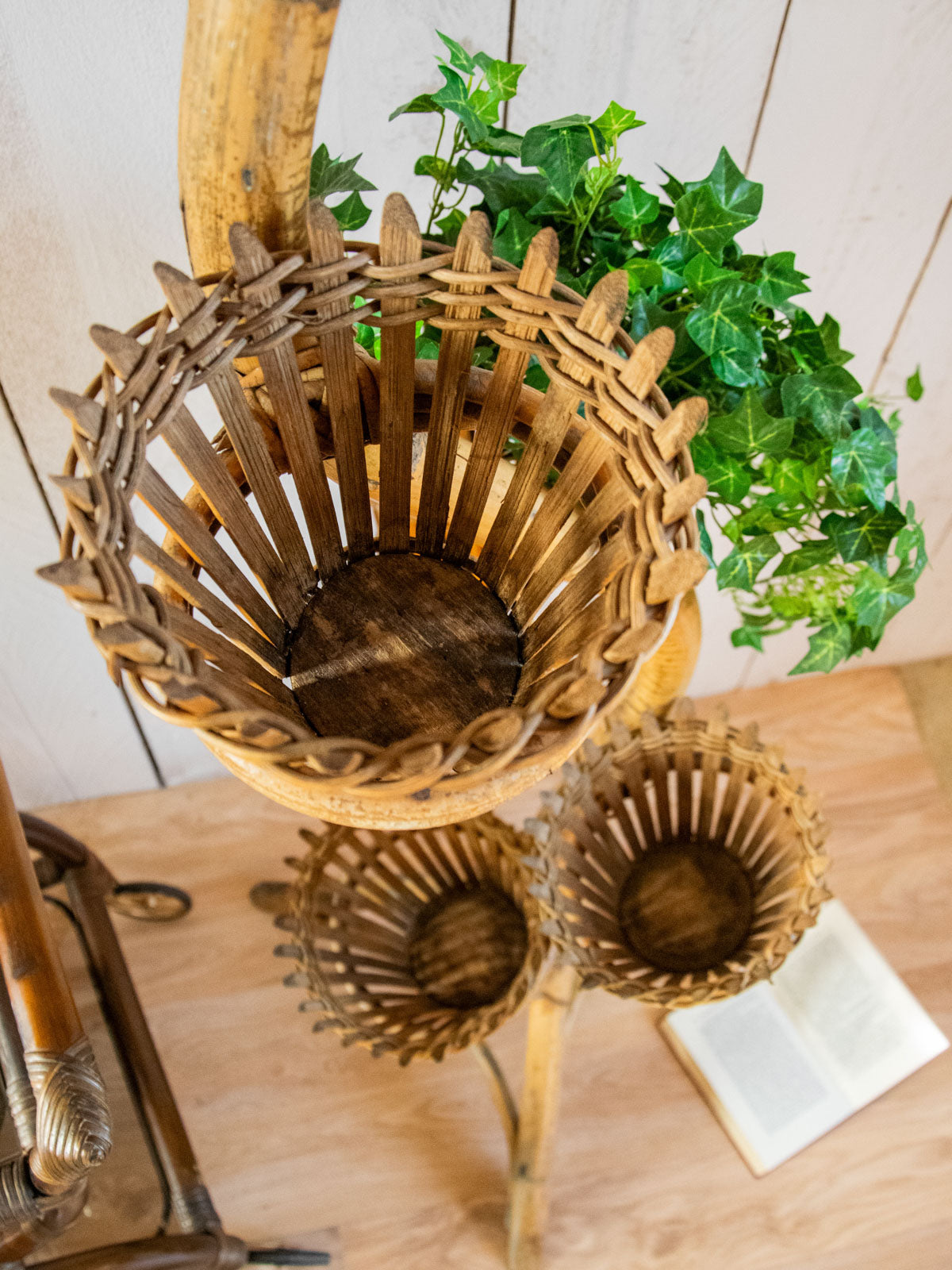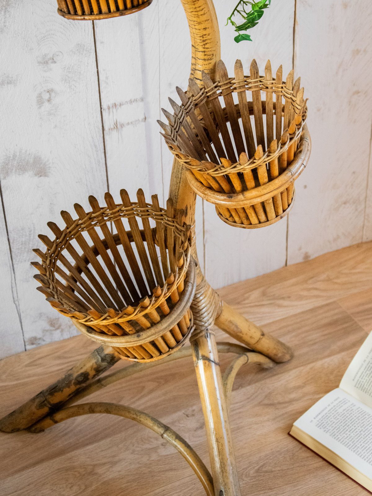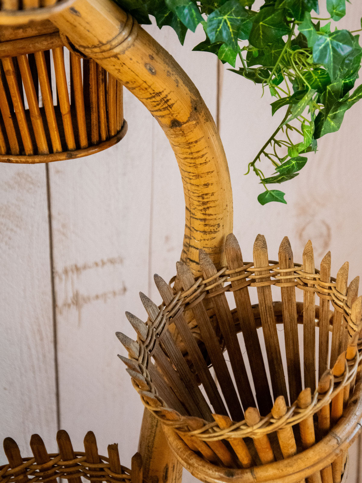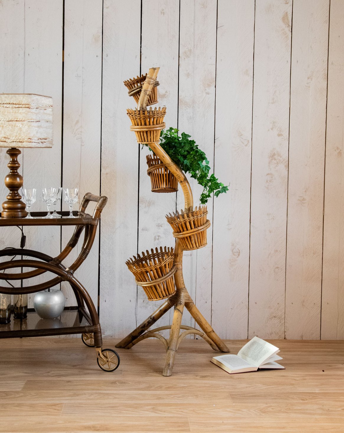 Add this light, patinated bamboo plant stand, which impresses with its refined verticality and airy silhouette. It holds five pots of progressively varying diameters, offering a harmonious arrangement for trailing plants and compact clumps. Its patinated finish exudes natural warmth and a handcrafted touch, ideal for enlivening a living room corner, a veranda, or a balcony. The understated, organic style creates a soothing, verdant atmosphere.