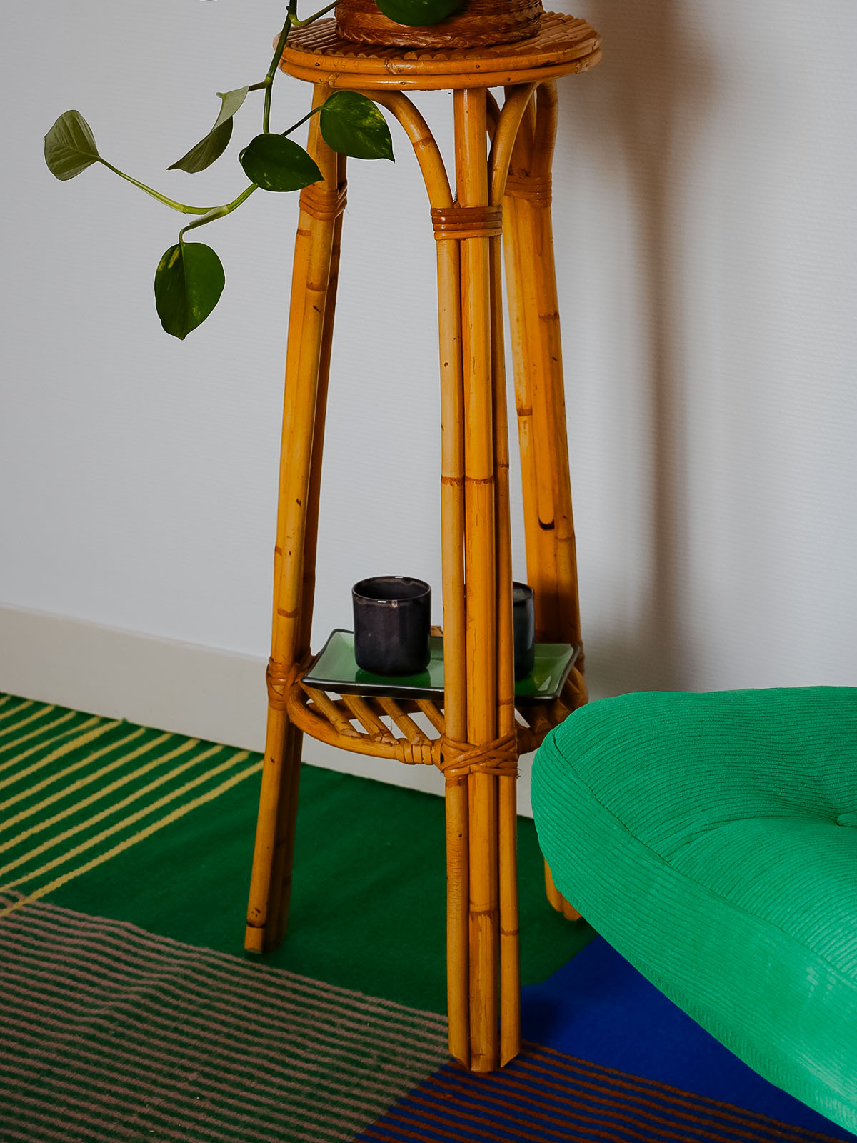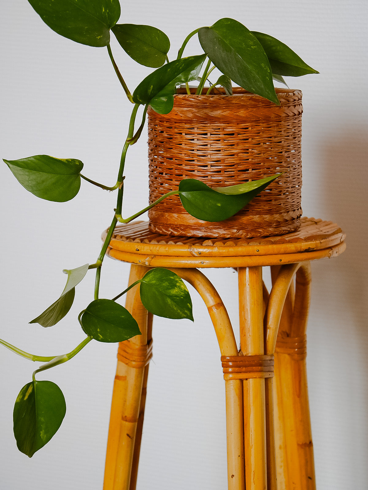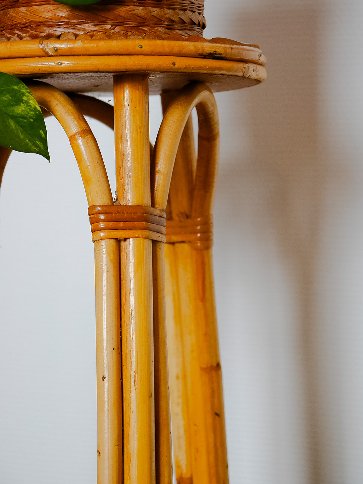 Invite this 1960s rattan plant stand into your home. Its slender silhouette and handcrafted weave radiate natural warmth. The single shelf accommodates a hanging plant or floral arrangement, showcasing it beautifully thanks to its vertical proportions, ideal for a bright corner or narrow balcony. The rattan adds a retro, organic touch that blends seamlessly into both bohemian interiors and contemporary living rooms, creating a soft and inviting atmosphere.