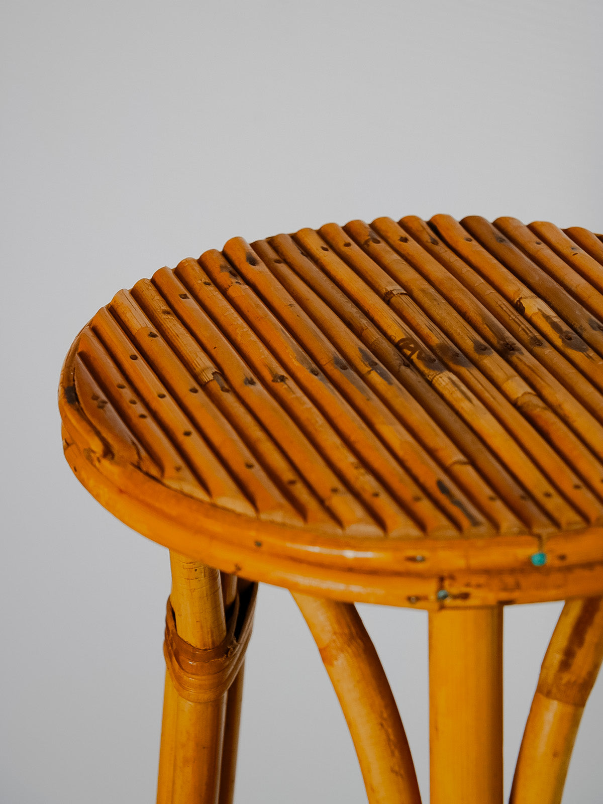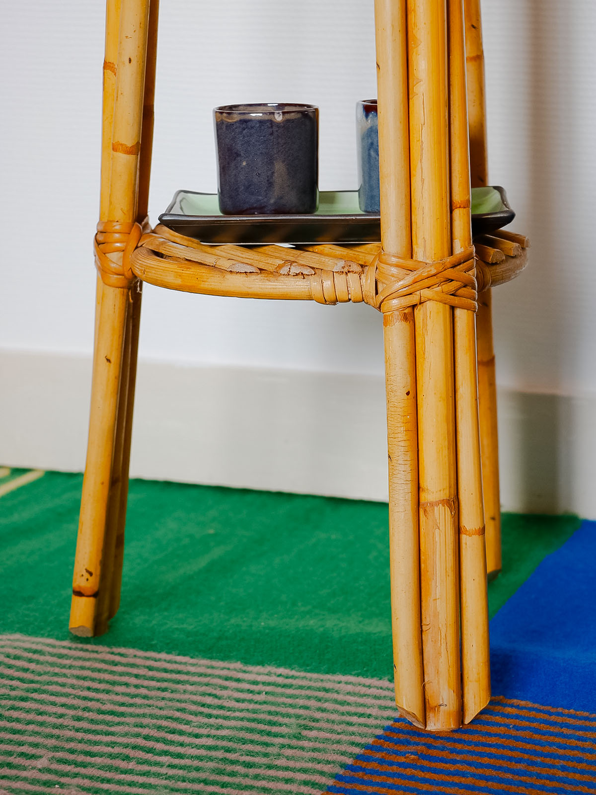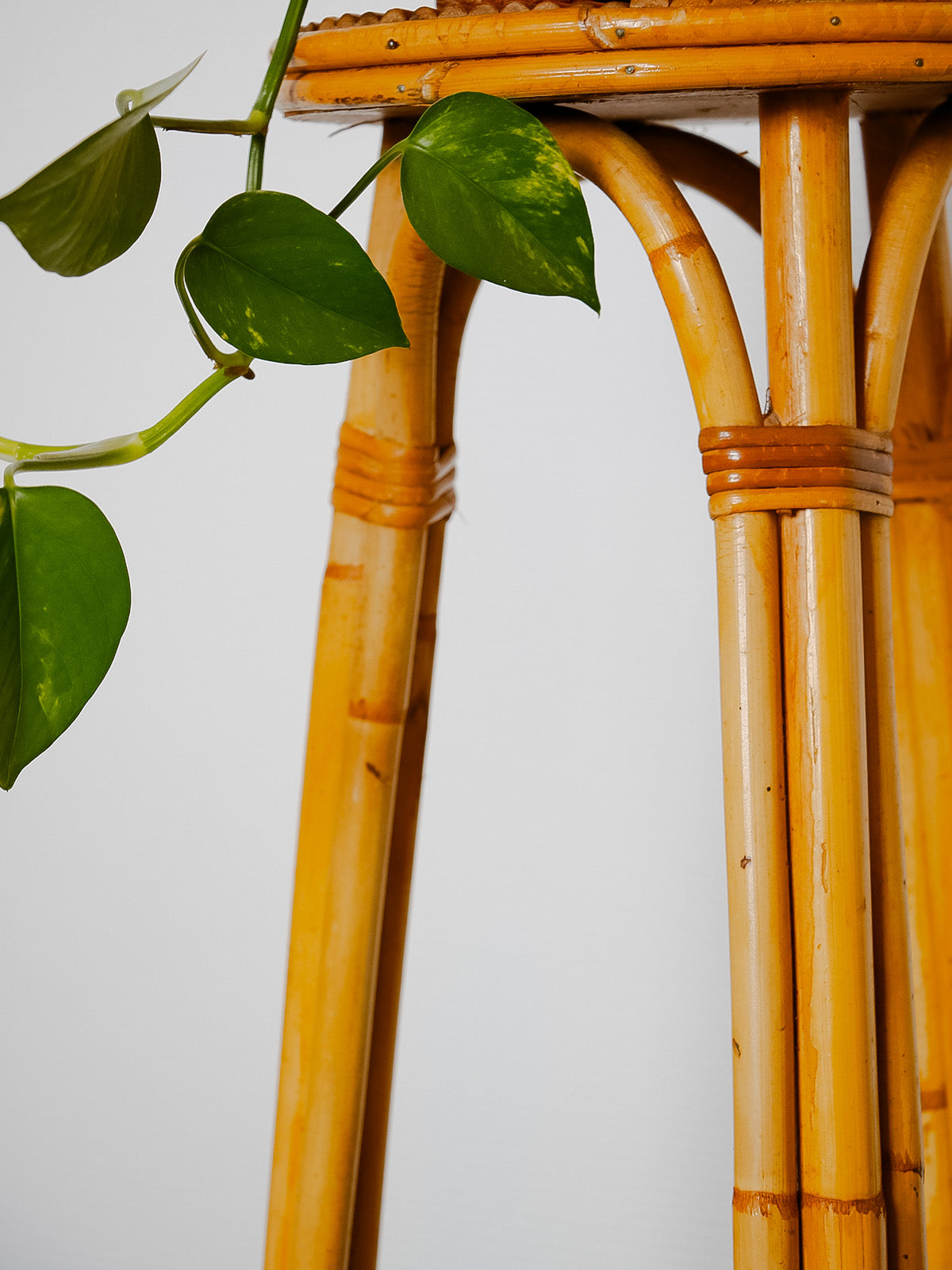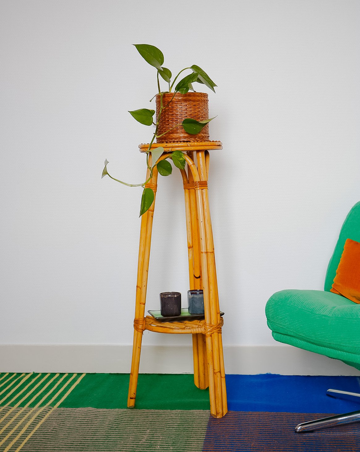 Invite this 1960s rattan plant stand into your home. Its slender silhouette and handcrafted weave radiate natural warmth. The single shelf accommodates a hanging plant or floral arrangement, showcasing it beautifully thanks to its vertical proportions, ideal for a bright corner or narrow balcony. The rattan adds a retro, organic touch that blends seamlessly into both bohemian interiors and contemporary living rooms, creating a soft and inviting atmosphere.