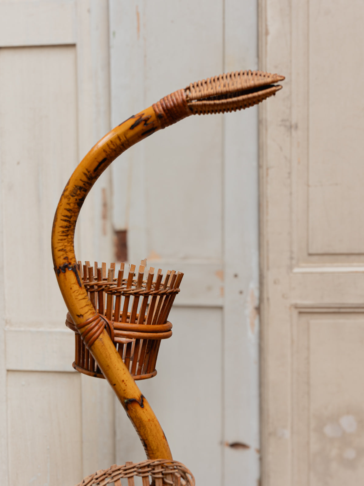 Enhance your interior with this bamboo and wicker plant stand, composed of three harmonious heads. The warmth of the bamboo and the delicate texture of the wicker create a natural feel, perfect for grouping small hanging plants or displaying lightweight pots to showcase foliage and flowers. Its compact size structures a bright corner without overwhelming it, creating a serene, bohemian atmosphere in a living room, entryway, or on a balcony.