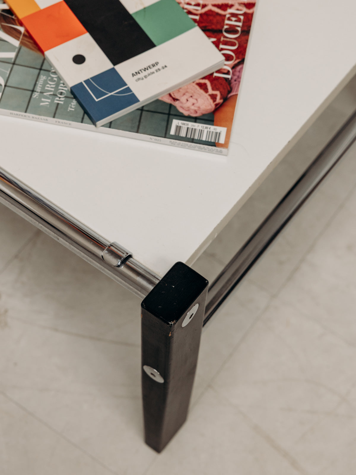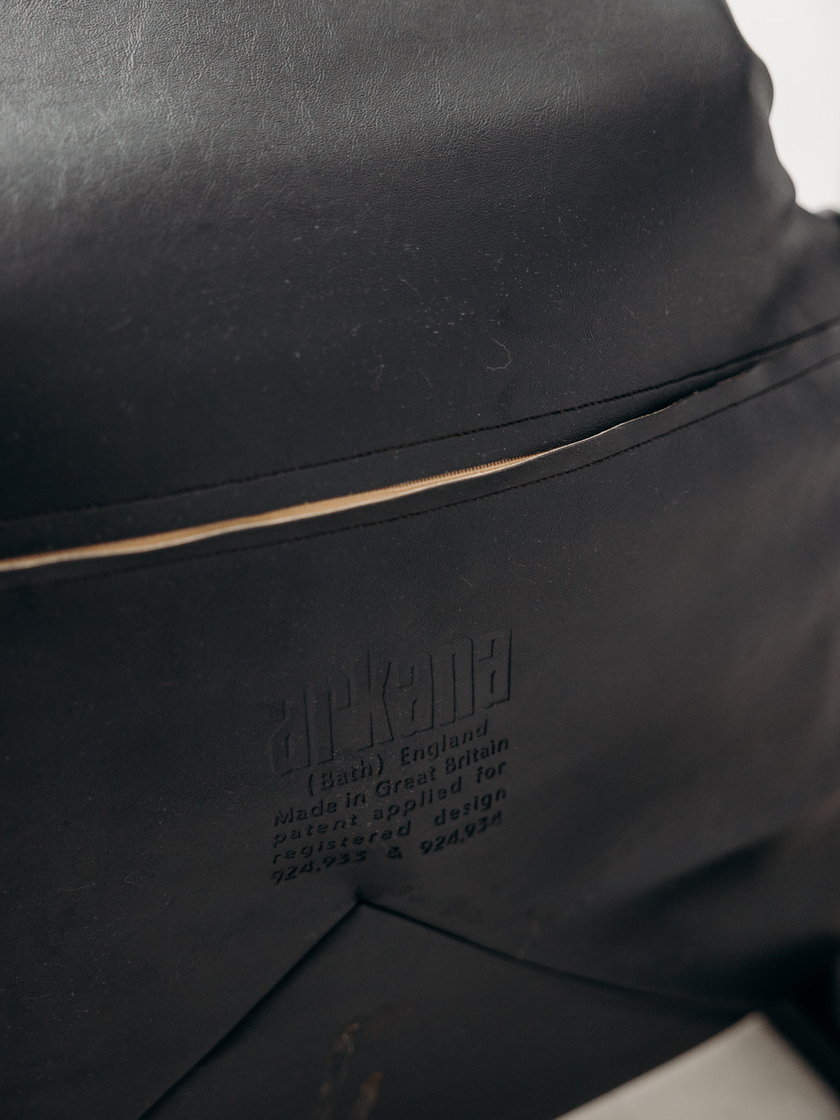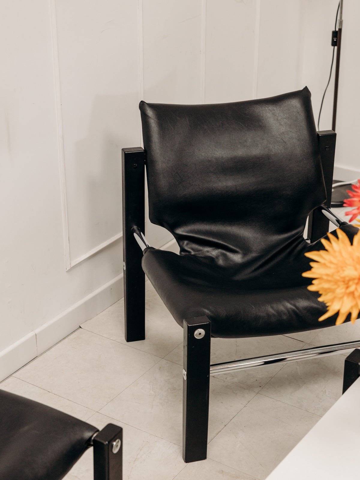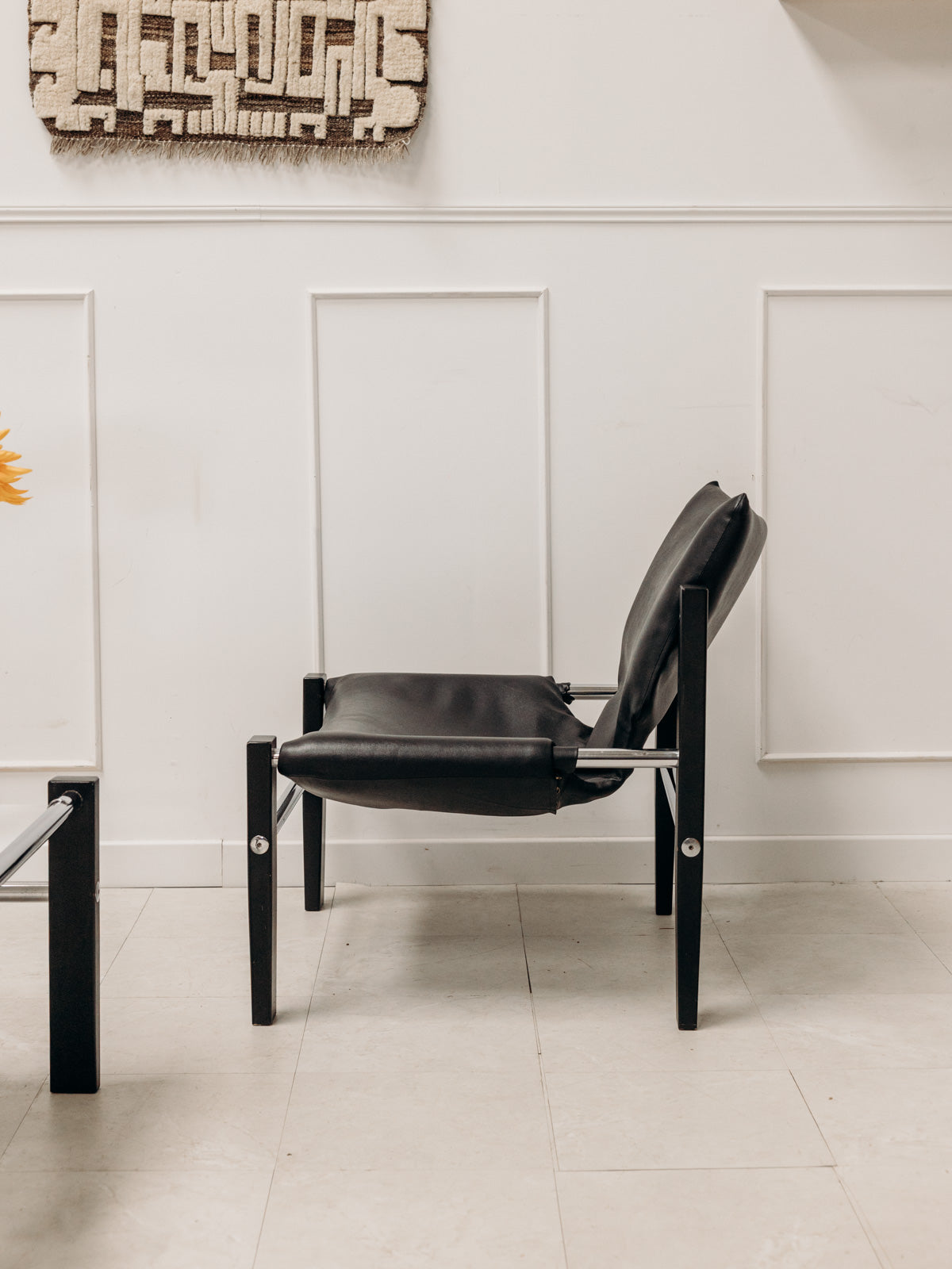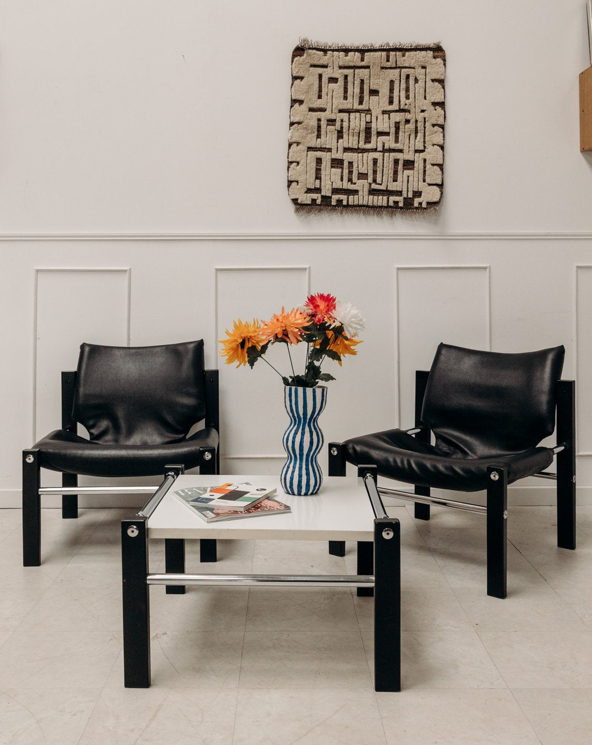 Discover the vintage Arkana set by Maurice Burke (UK, 1970s), comprising two low armchairs in black leather and a coffee table with a white top. The armchairs combine leather-upholstered seats and backs with a black lacquered wood frame and chromed metal tubing for enveloping comfort and a graphic silhouette. The matching coffee table, with its white top resting on a wood and metal frame, adds a touch of brightness and a compact size suitable for contemporary living rooms. Clean lines and noble materials create a refined, retro atmosphere. Subtle signs of age only add to its charm.
