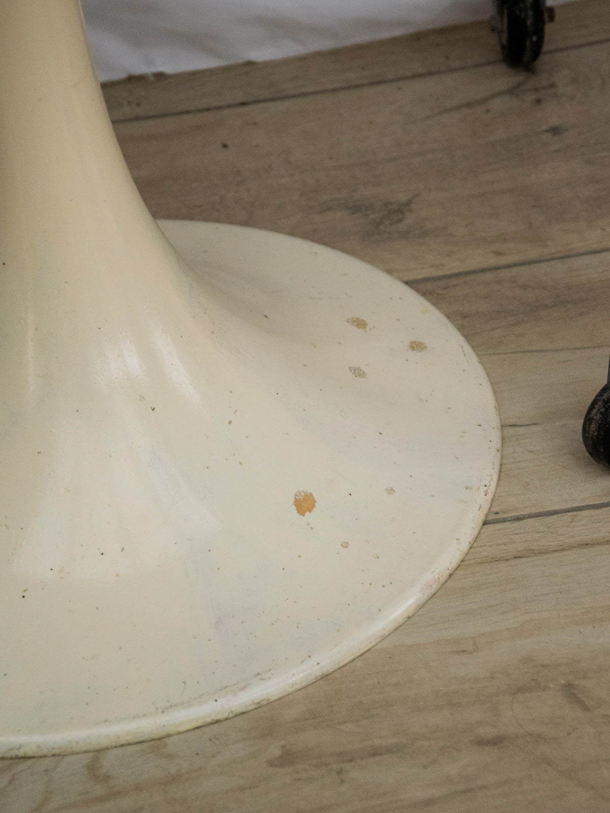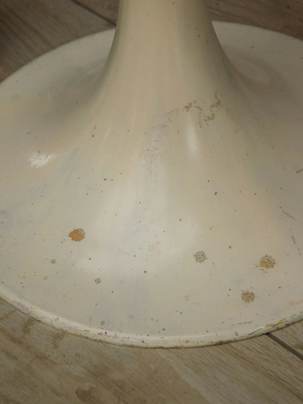Embrace this vintage white tulip stool with its organic design that brings elegant modernity to any interior. The molded white seat rests on a painted metal base, creating a subtle contrast and a compact footprint, ideal for a dining area, office, or as an extra seat. The soft lines and matte finish invite a warm and understated atmosphere, easily integrated into a contemporary or retro decor. The paint is worn in places on the base and there is a slight crack on the seat.