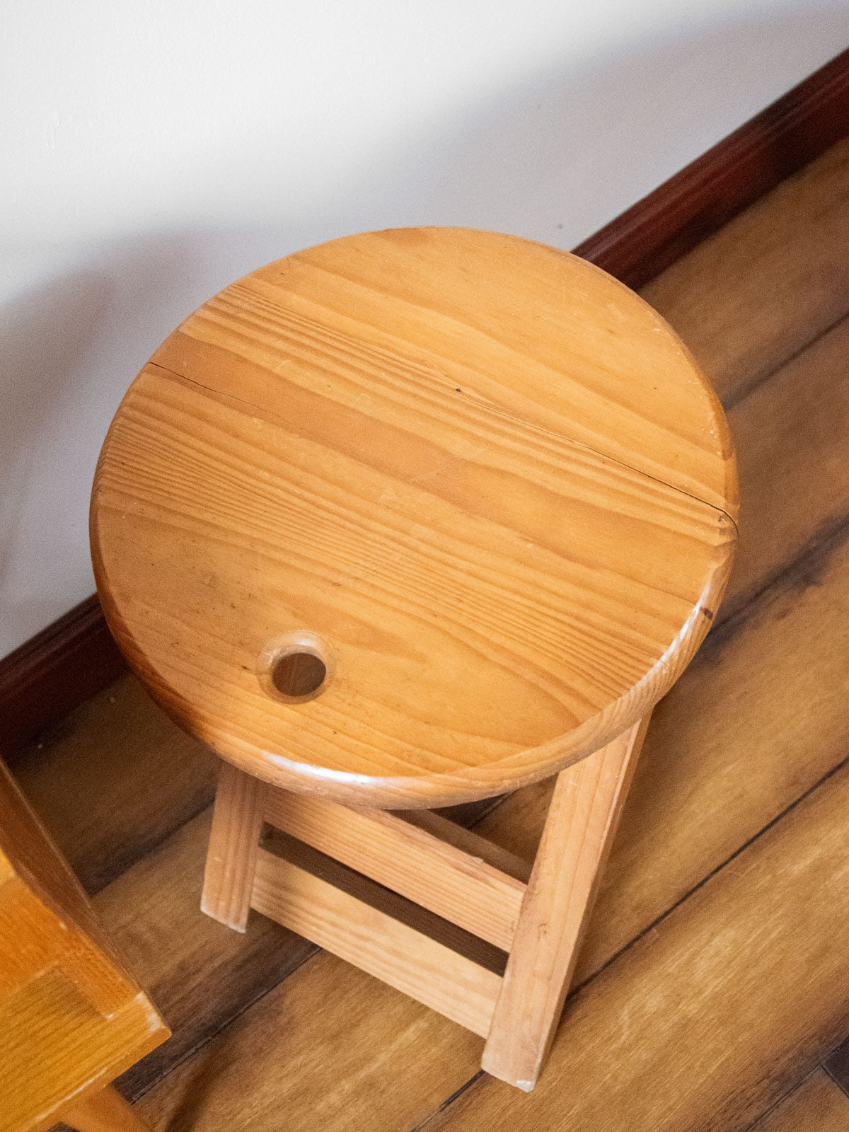 Embrace this light wood folding stool with its round seat and clean lines, bringing a warm and natural touch to any interior. Designed for easy portability, it folds up in a snap thanks to a clever latch on the seat, making it ideal for small spaces, balconies, or outdoor gatherings. Its lightweight design and simple silhouette make it a versatile and elegant extra seat. Signs of age are present.
