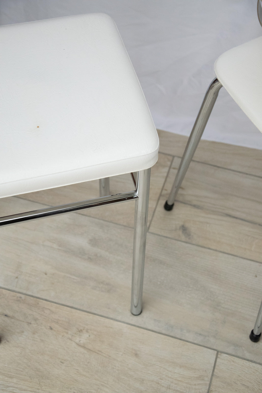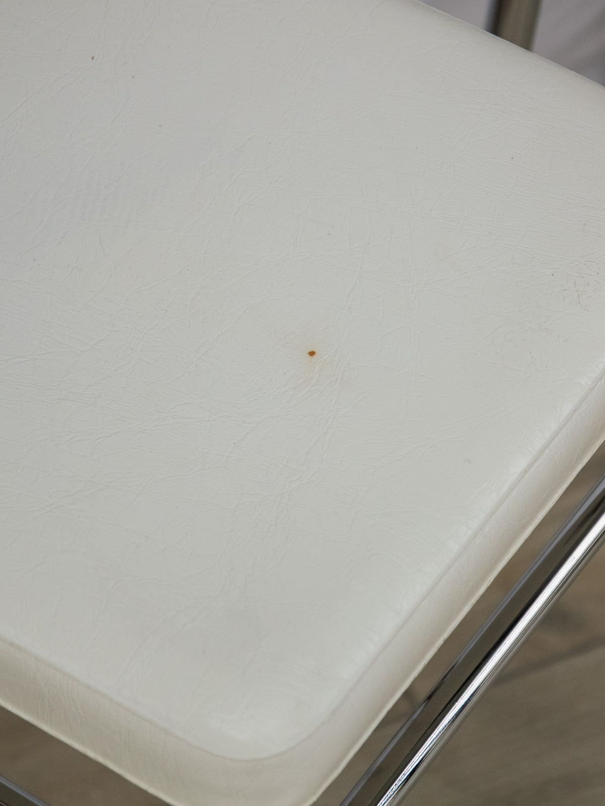 Choose this stool with its chrome base and white faux leather seat, which combines functionality and modern elegance. Its glossy finish and clean lines blend seamlessly into a bar, kitchen island, or dining area, offering comfortable and easy-to-clean seating. Ideal for a bright, contemporary setting, it adds a graphic touch without overwhelming the space. There is a small stain on the seat.