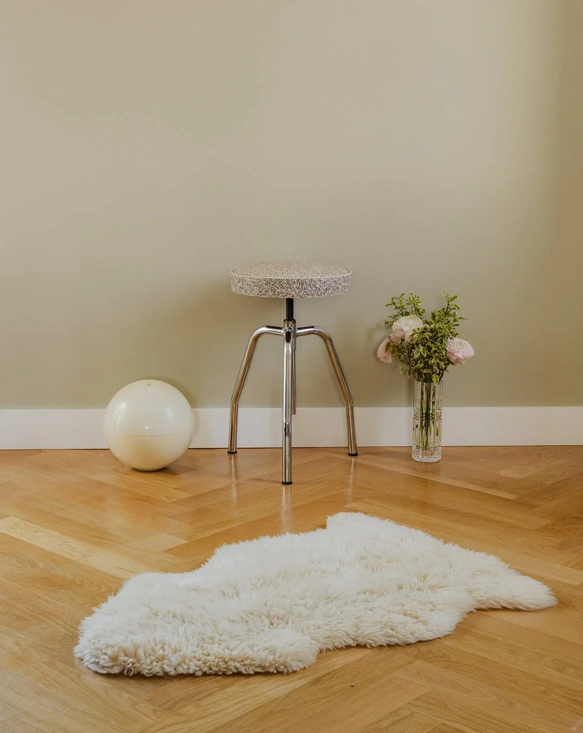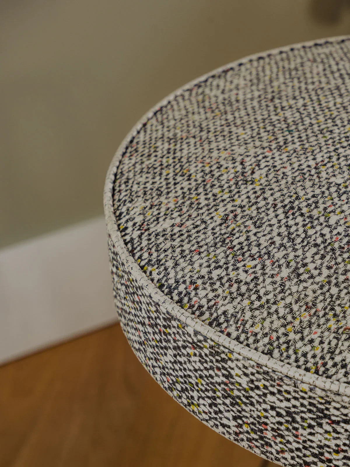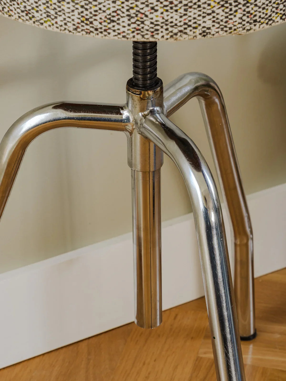Add this stool with its chrome base and gray, black, and white patterned faux leather seat, creating a modern and graphic contrast. Its metal frame gives it a light look, while the comfortable seat is perfect as an extra seat in a living room or office nook. The height is easily adjustable thanks to a screw system, making it practical and adaptable to small spaces. Some signs of wear are present.