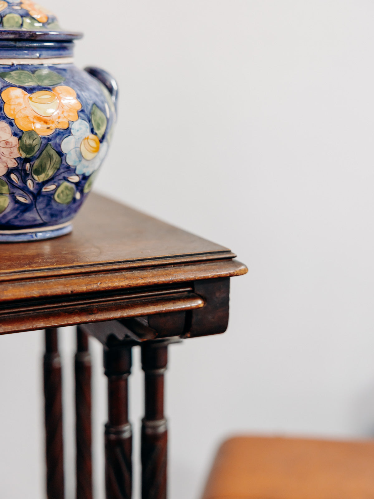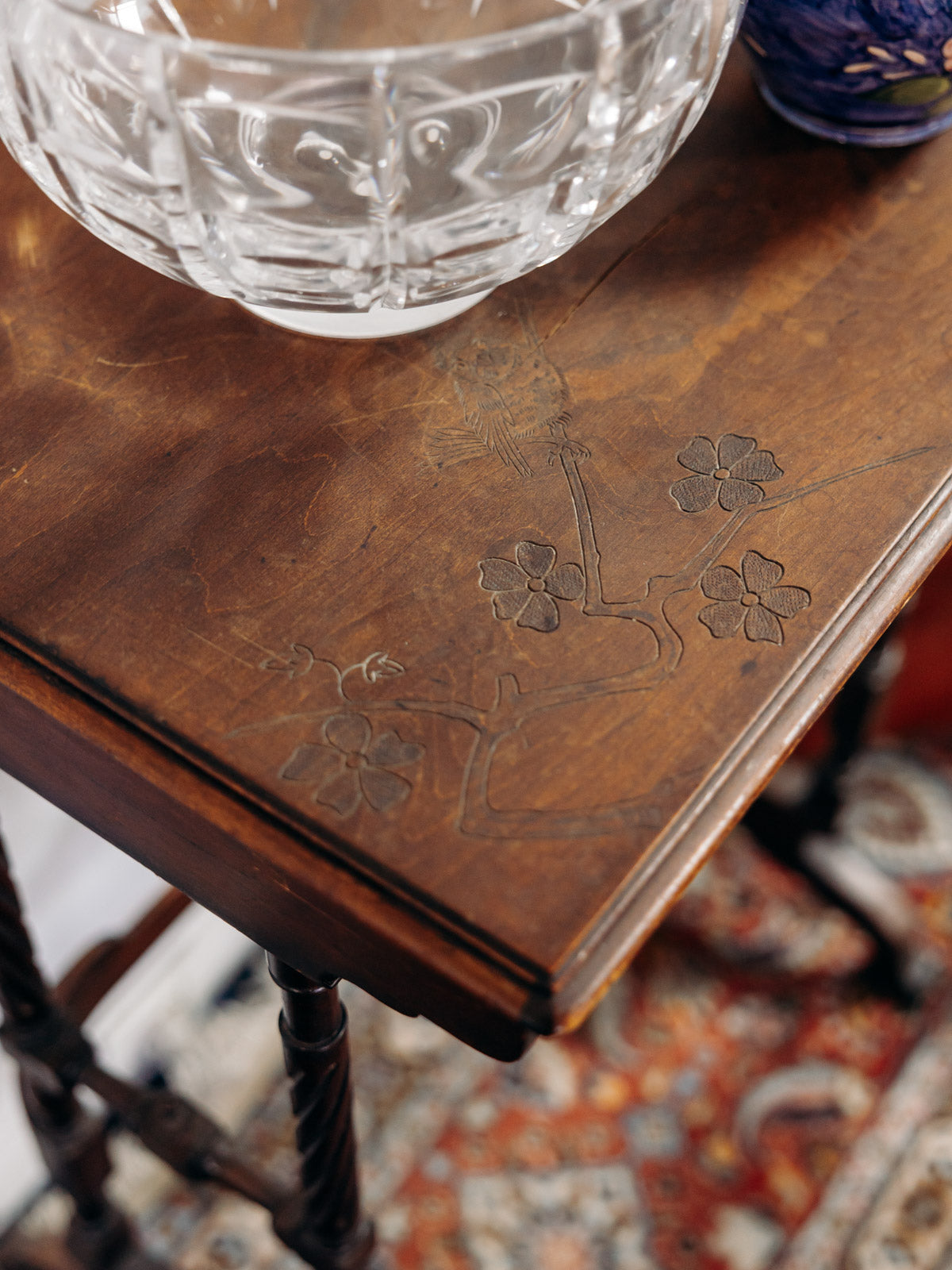 Choose these nesting tables in finely crafted wood, a harmonious pair where the smaller table slides under the larger one to free up space and offer versatility, serving as a side table or elegant serving cart. The tabletops feature engraved designs that lend a refined, handcrafted touch, while the patinated wood adds warmth and character to a contemporary or classic interior. Veneer is missing from the tabletop.