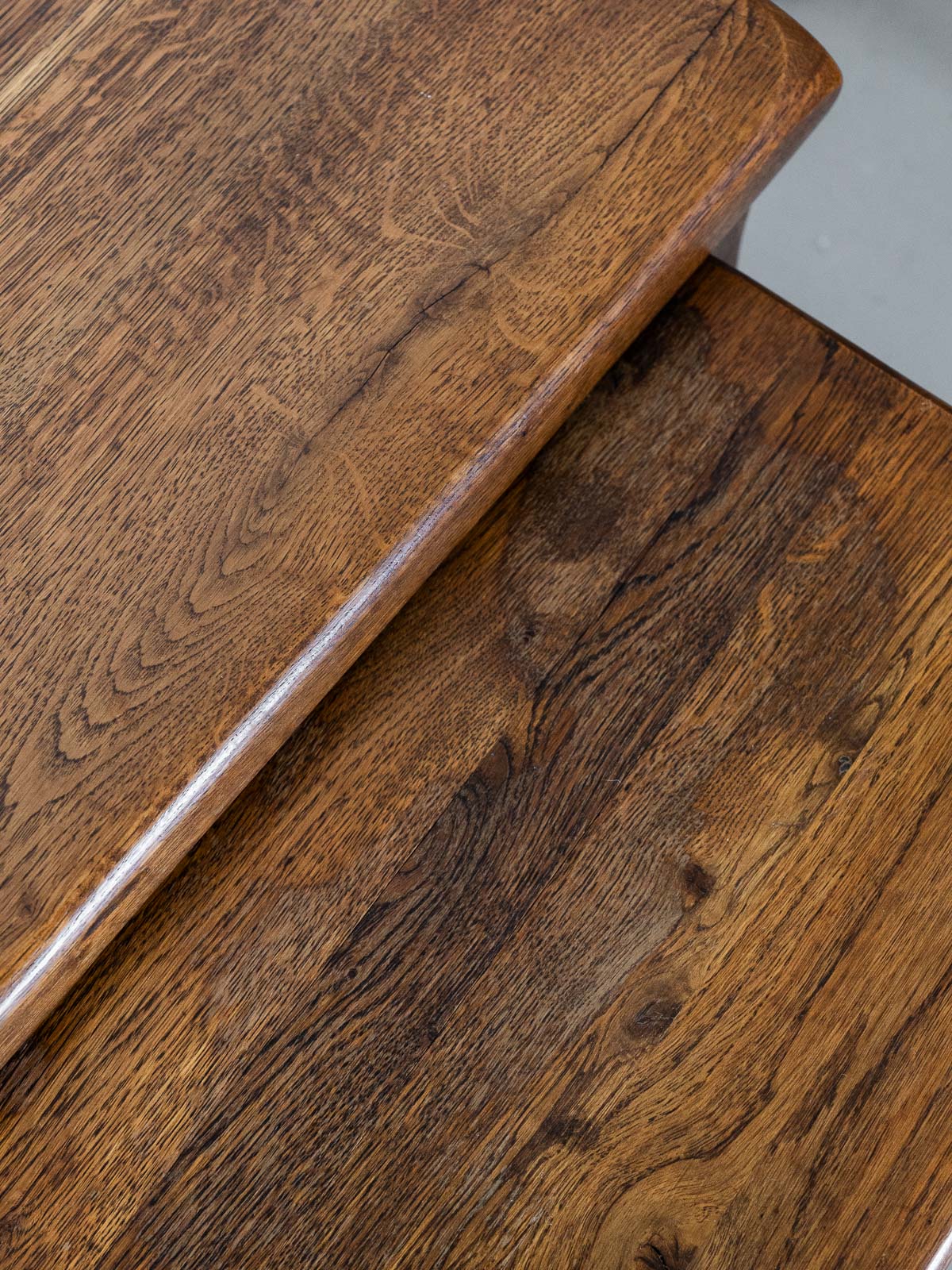 Discover this elegant set of three solid wood nesting tables, a true testament to 20th-century design. Their sturdy structure and clean lines bring a timeless vintage touch to your home. These tables, with their warm patina, adapt to all your desires, whether as side tables or decorative pieces. In good overall condition, they nevertheless show signs of wear on the top, adding to the charm of this authentic set.