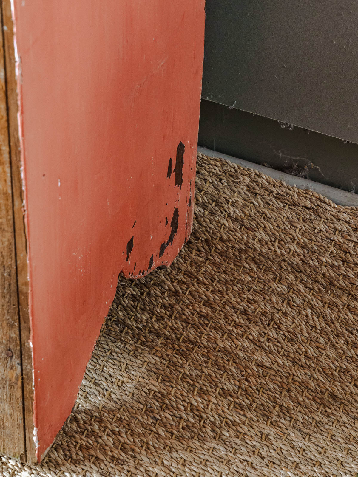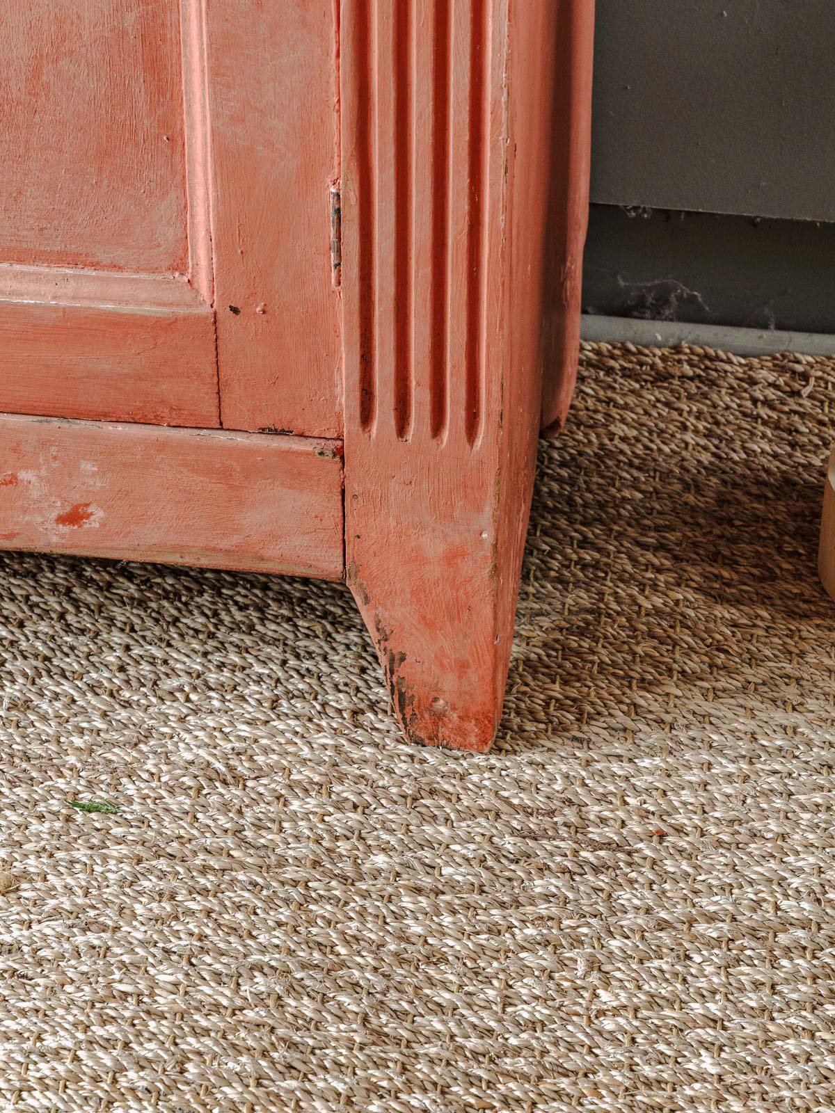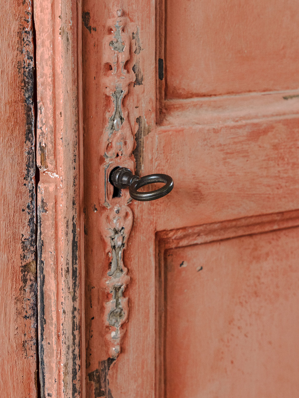 Embrace this Parisian wardrobe, crafted from sanded wood and delicately painted in a terracotta hue, which brings a warm and elegant touch to your interior. Its silhouette and profile reveal ample storage space distributed across four shelves, ideal for an entryway, bedroom, or living room. The door closes with a latch; the original lock and key are present but not functional. Some signs of age are present.