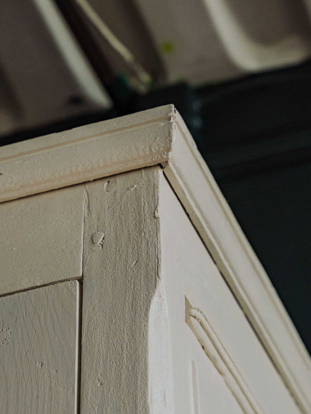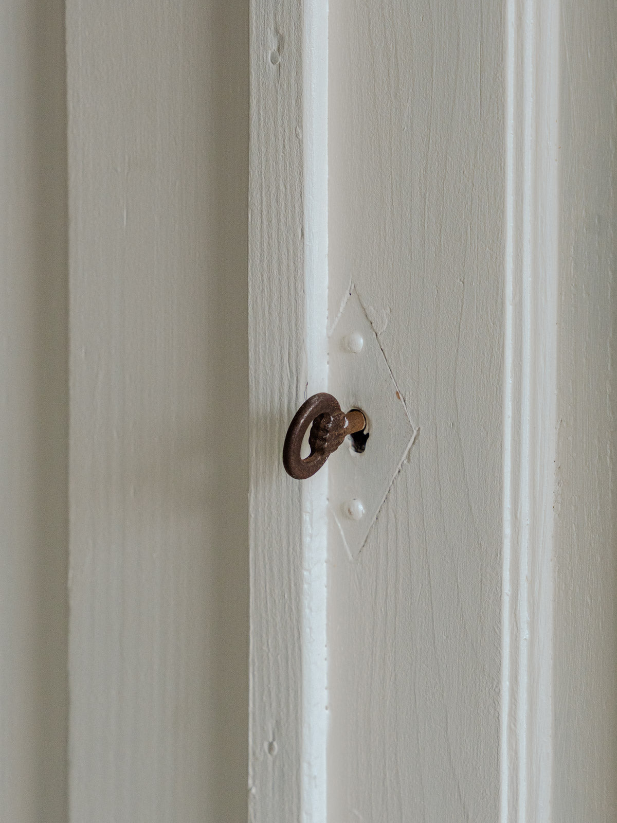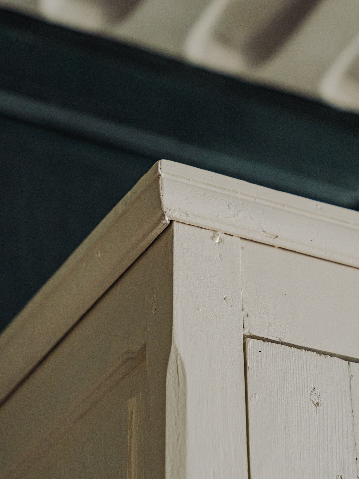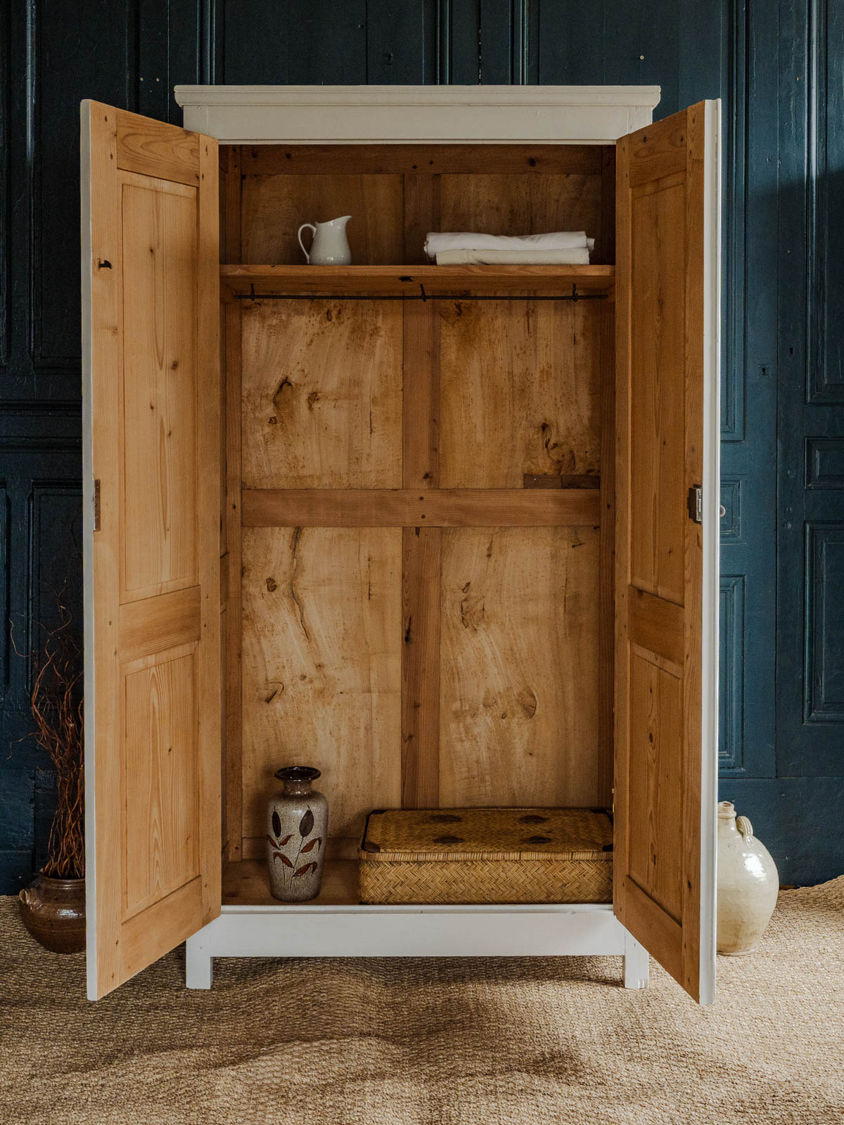 This white-painted wooden wardrobe, with its clean and bright lines, adds an elegant touch to a bedroom or entryway. Its original, functional lock and key highlight its authenticity, while the interior—shelves and hanging space—offers organized storage for clothes and accessories thanks to its generous proportions. Its soft patina enhances its charm. Some signs of age are present.