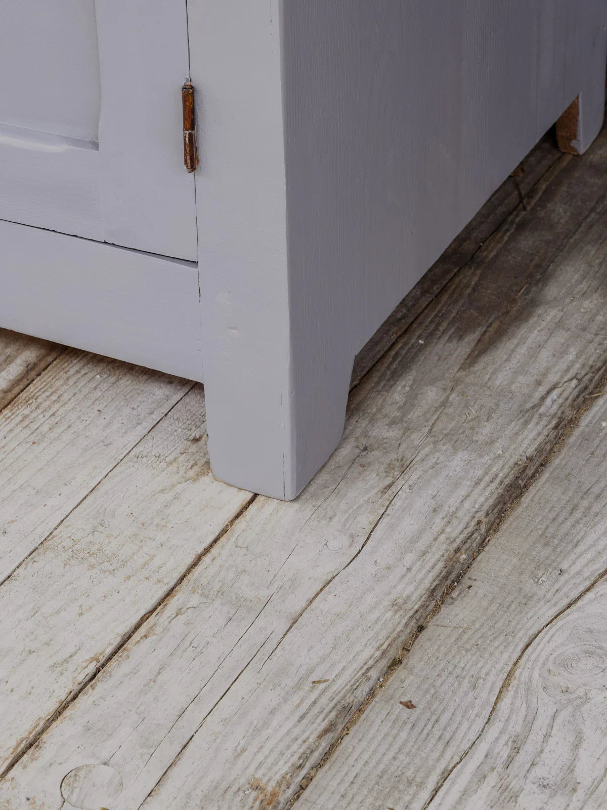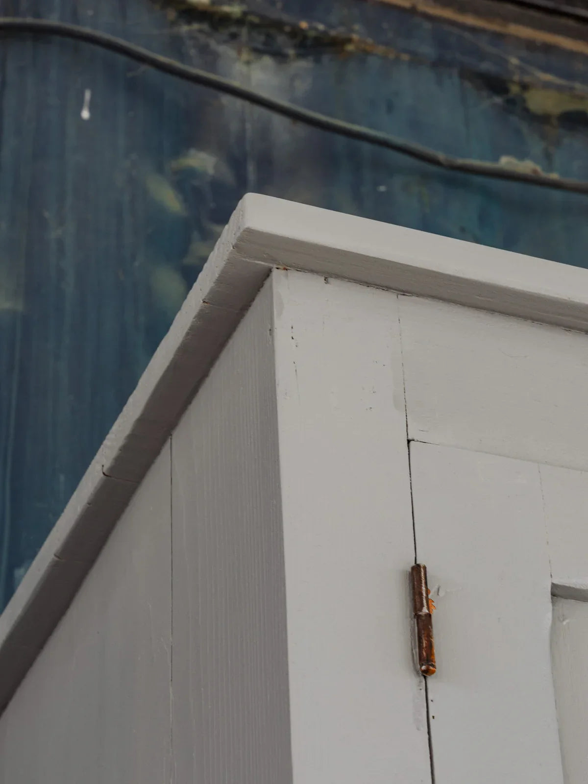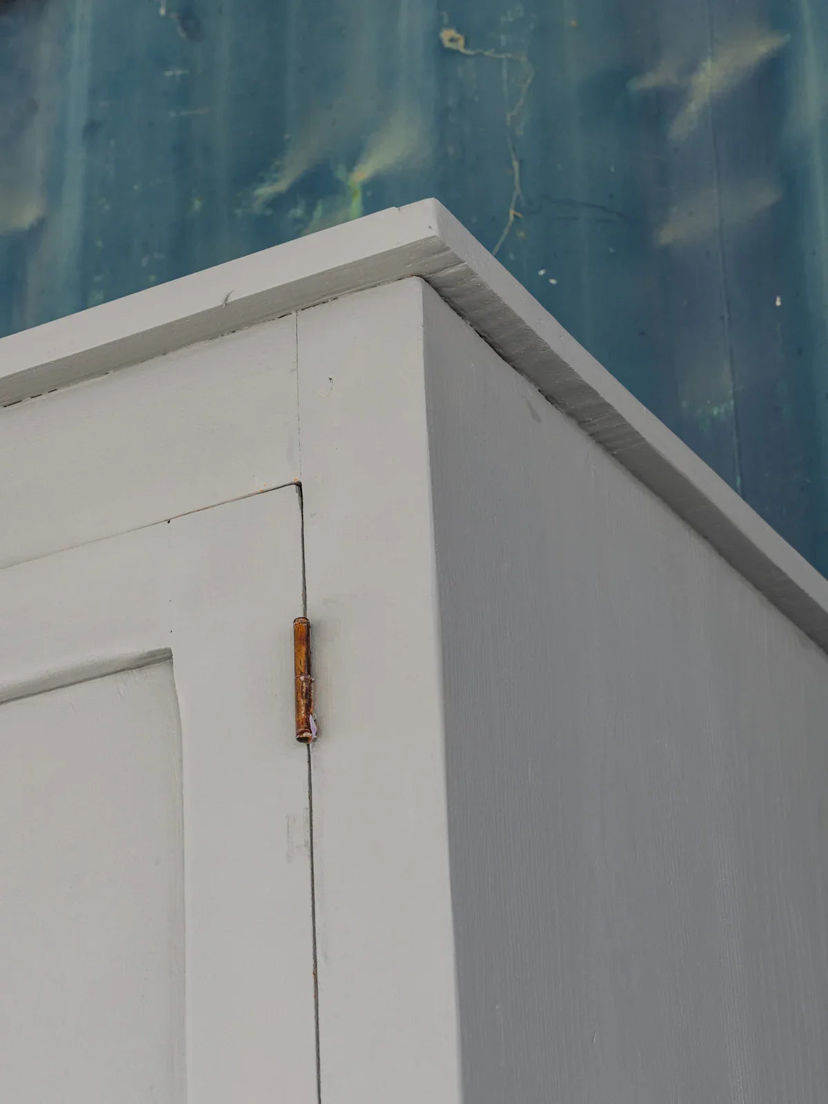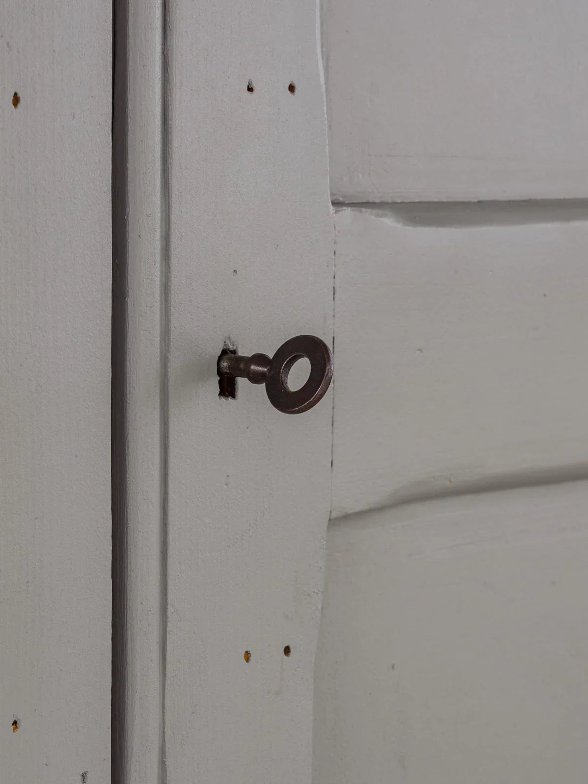 Embrace this wooden wardrobe, painted in a delicate blue-grey, which creates a soft and elegant atmosphere. Its presence brings an authentic and serene touch to the room. Its generous height and ample storage space, including a shelf, allow for easy organization of coats, linens, and seasonal items, while the door, secured with a lock and working key, keeps your belongings safe. Some signs of age are present.