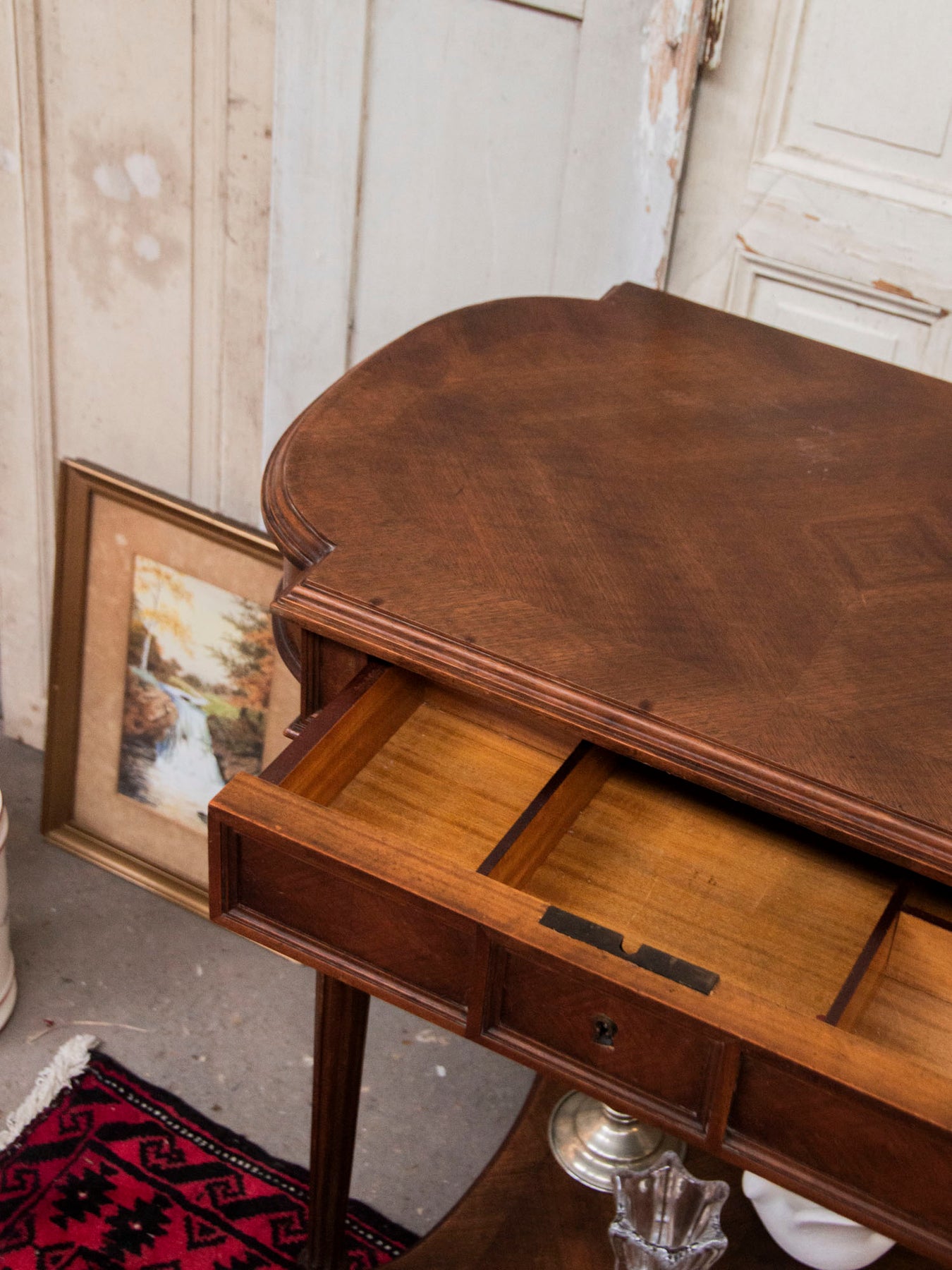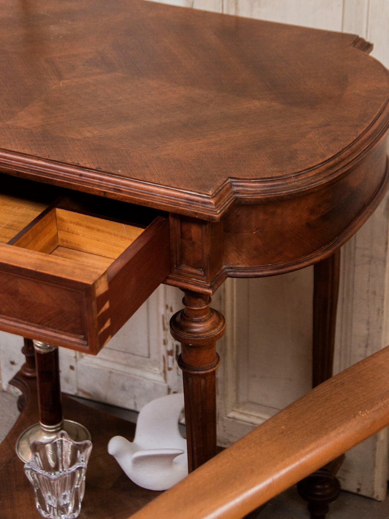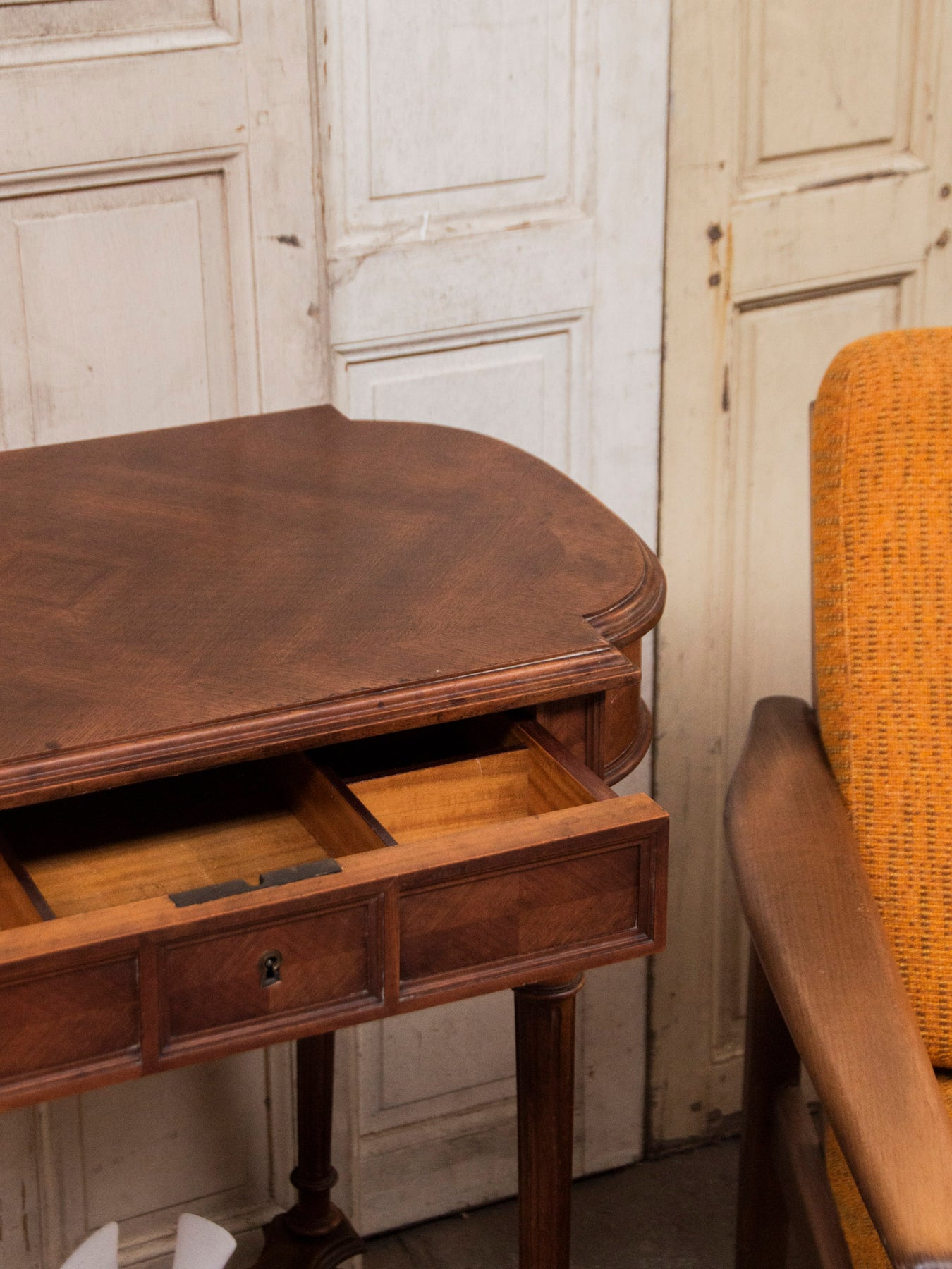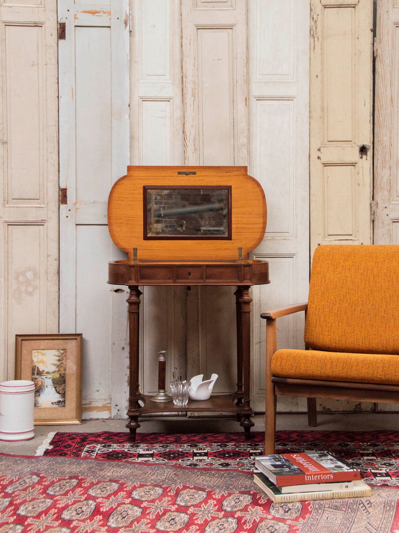Discover this sewing table with rounded edges, crafted from turned wood, boasting understated elegance and a refined design. Its drawers and compartments, including a small drawer and integrated niche, offer thoughtful storage for threads, needles, and small tools, while its compact silhouette unfolds for easy access and optimal space. Placed near a window, it creates a cozy sewing nook; it also finds its place as an accent piece in a simple and inspiring interior.
