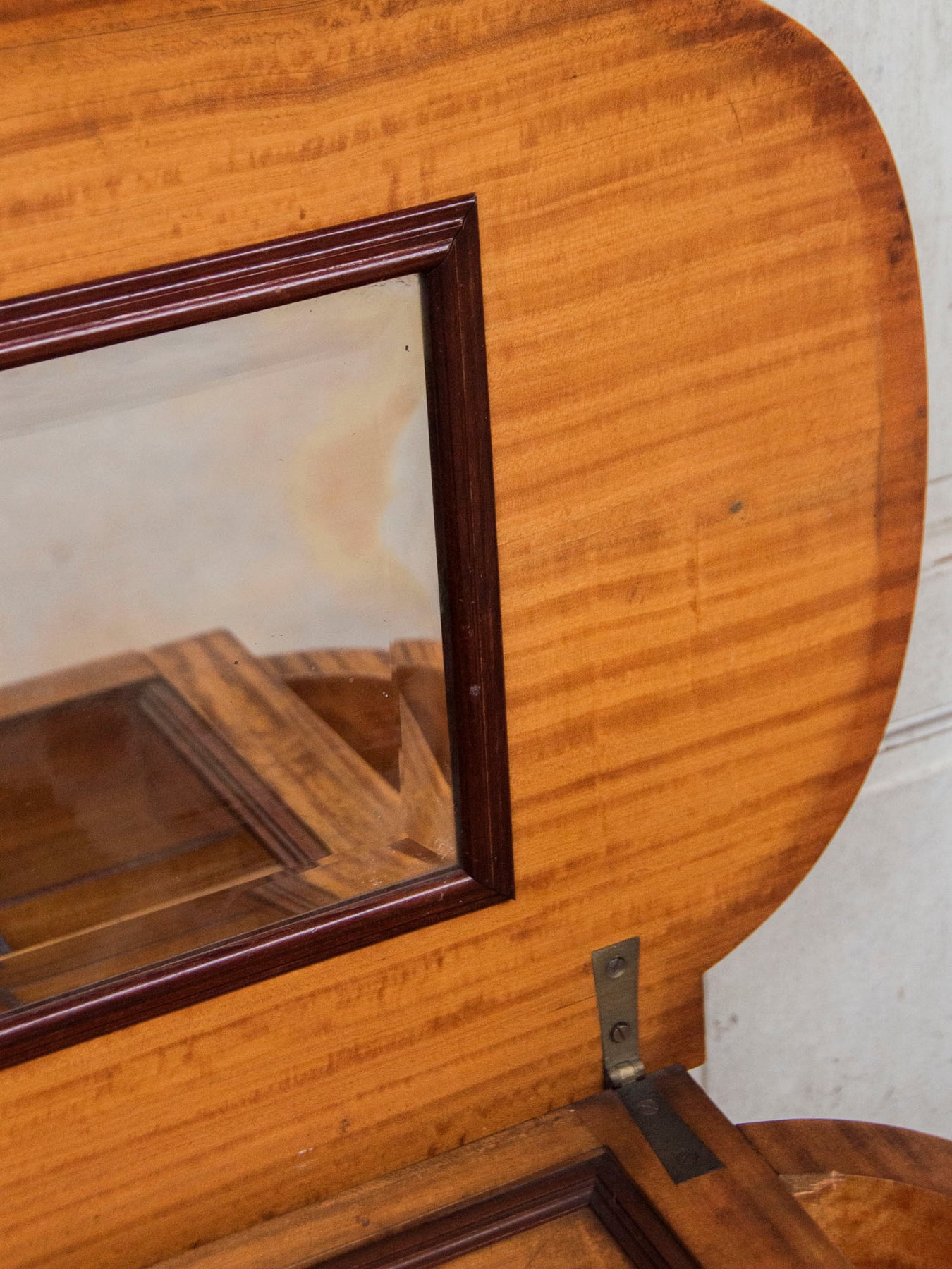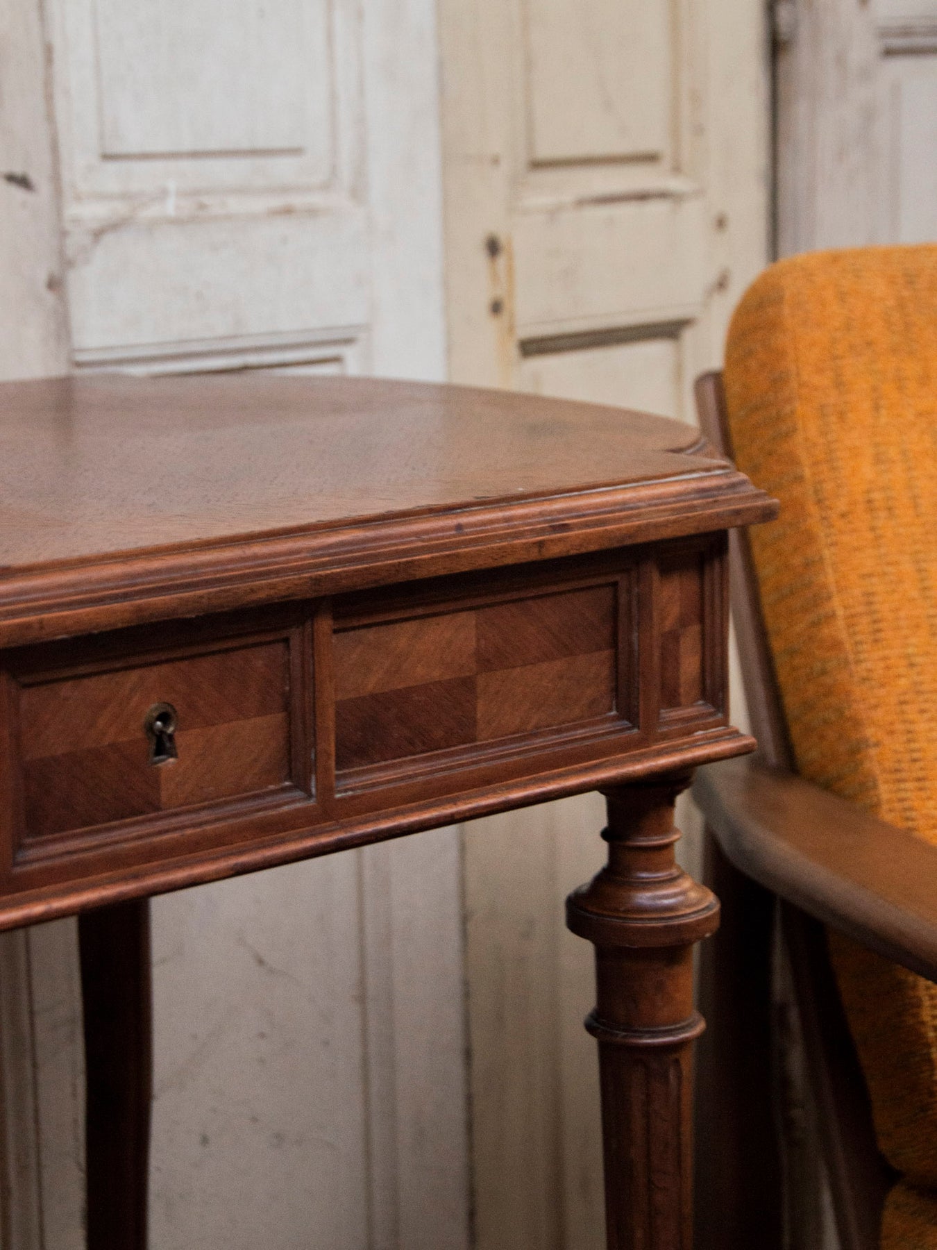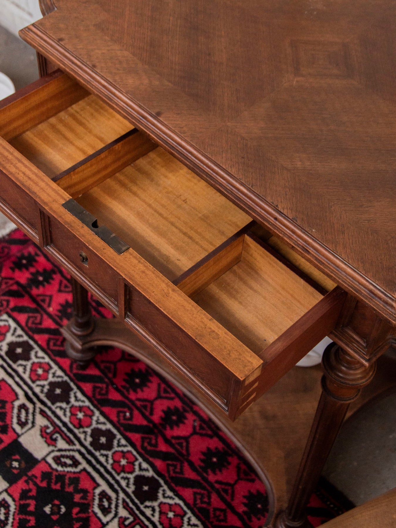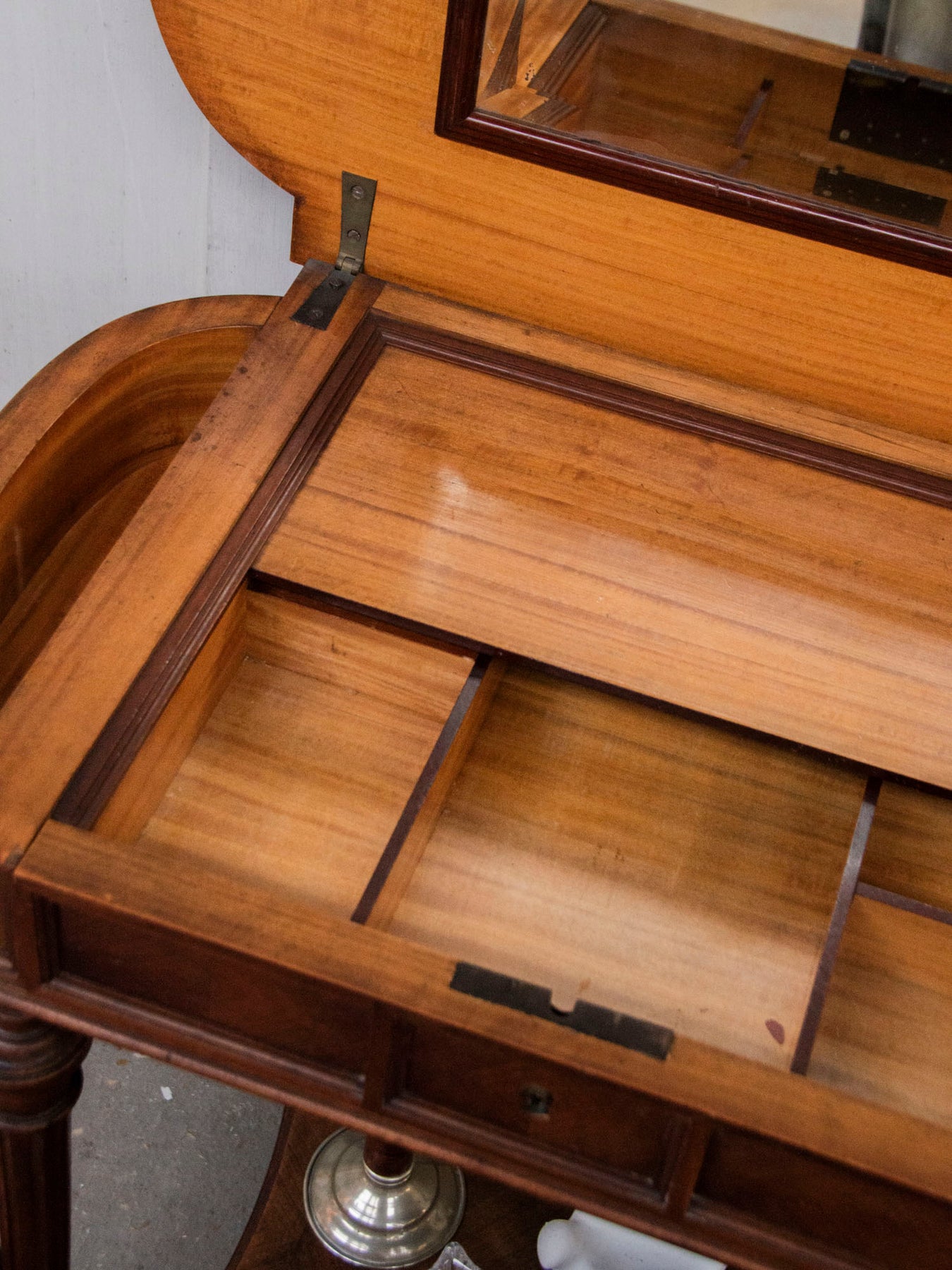 Discover this sewing table with rounded edges, crafted from turned wood, boasting understated elegance and a refined design. Its drawers and compartments, including a small drawer and integrated niche, offer thoughtful storage for threads, needles, and small tools, while its compact silhouette unfolds for easy access and optimal space. Placed near a window, it creates a cozy sewing nook; it also finds its place as an accent piece in a simple and inspiring interior.