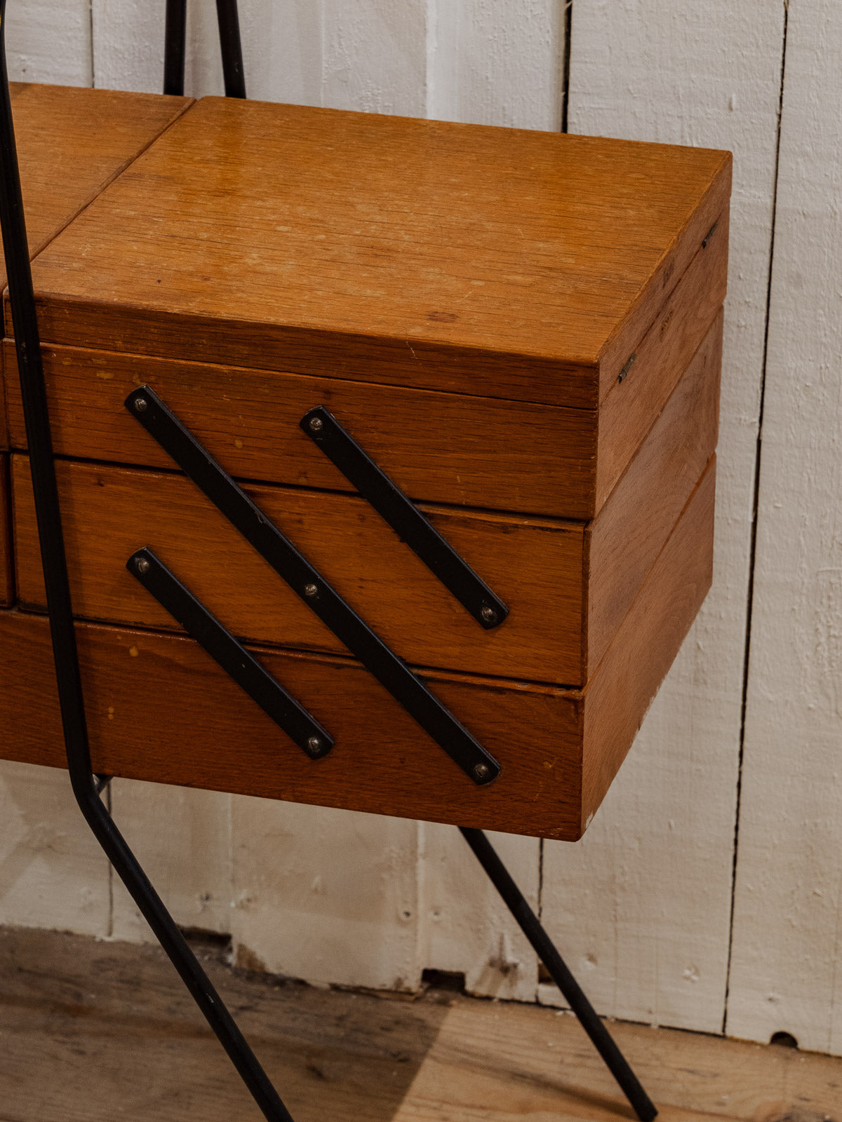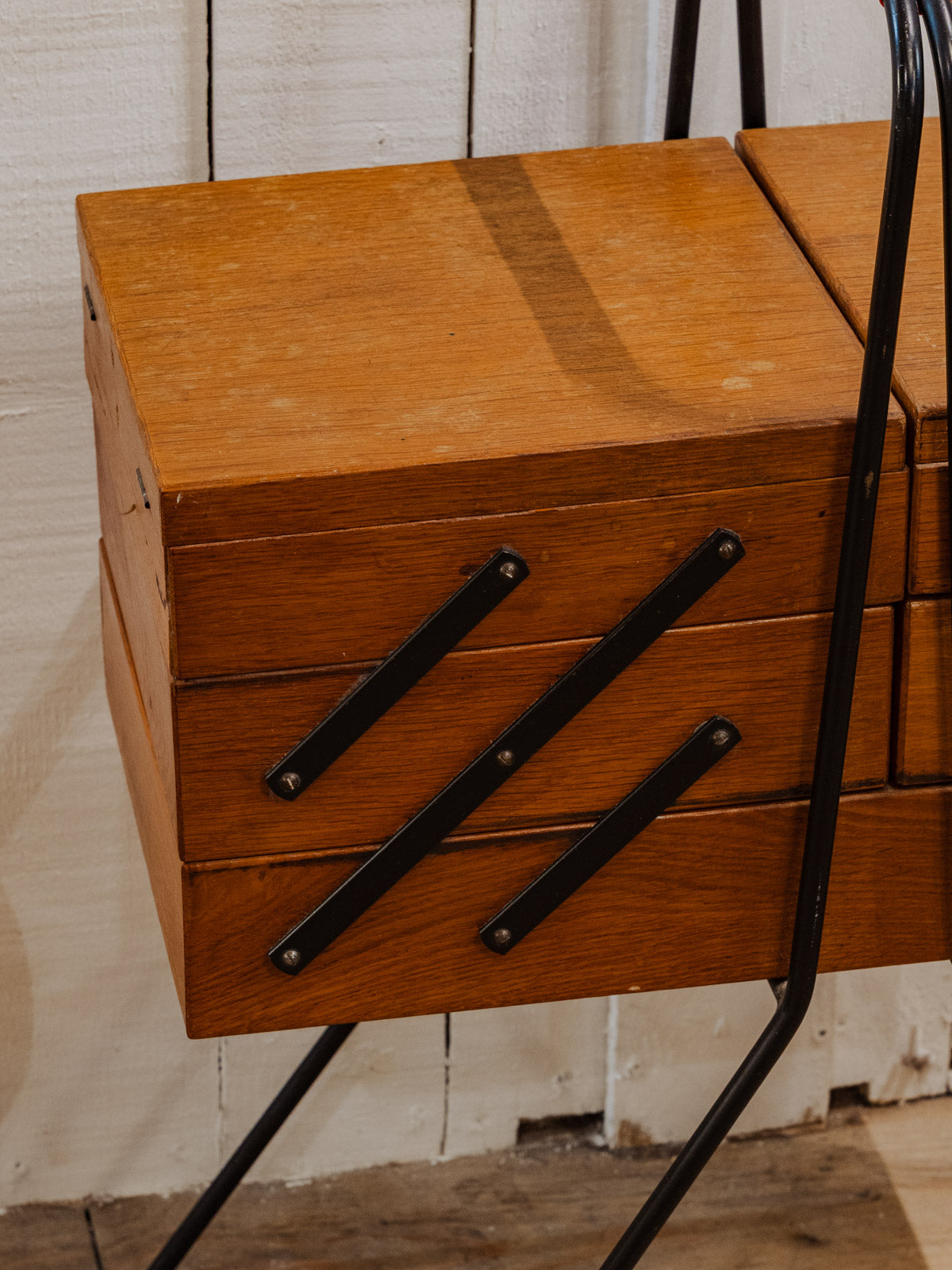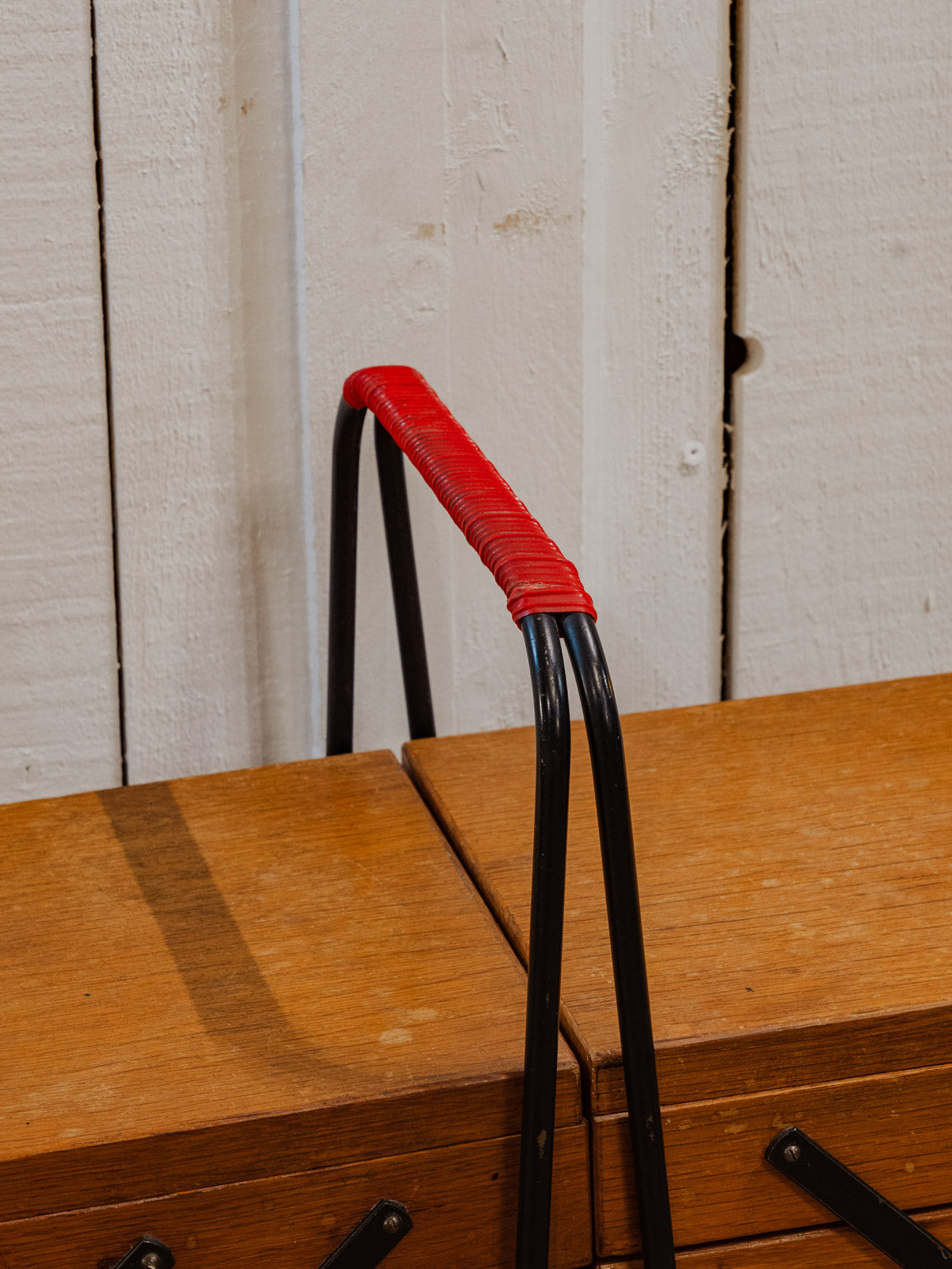 Adopt this wooden worktable, punctuated with black and red metal details, compact when closed and generously sized when unfolded. Its three compartments on each side and wider central work surface offer modular storage for sewing, crafts, or a home office, while the black metal legs lend it a discreet industrial elegance. It brings a warm and functional touch to a living room or workshop. Some signs of age are present.