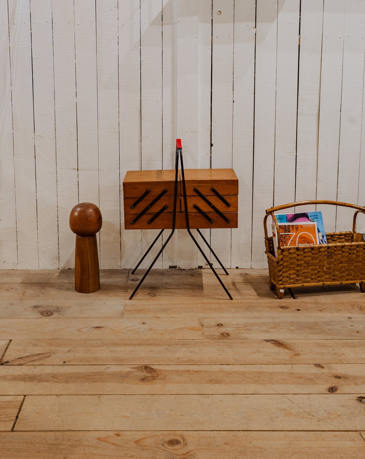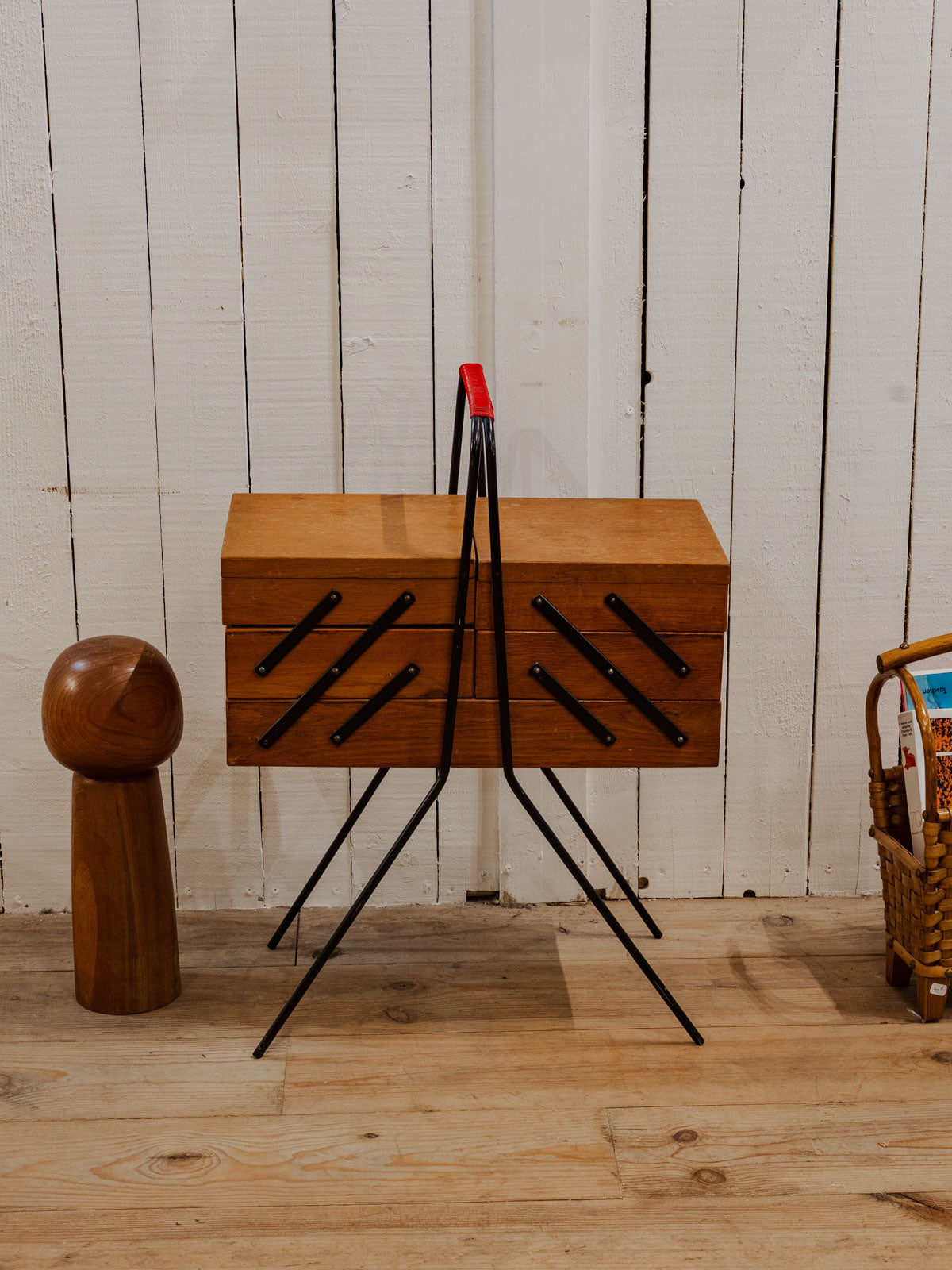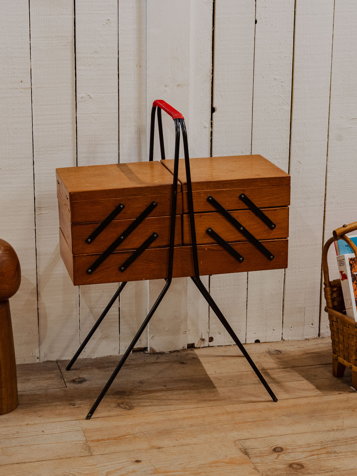 Adopt this wooden worktable, punctuated with black and red metal details, compact when closed and generously sized when unfolded. Its three compartments on each side and wider central work surface offer modular storage for sewing, crafts, or a home office, while the black metal legs lend it a discreet industrial elegance. It brings a warm and functional touch to a living room or workshop. Some signs of age are present.