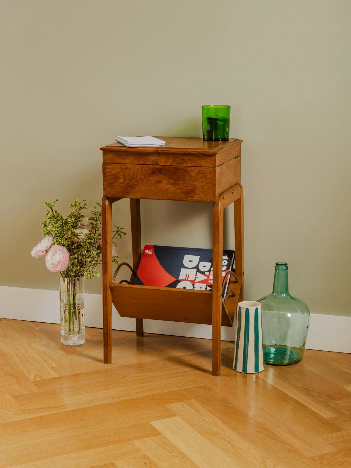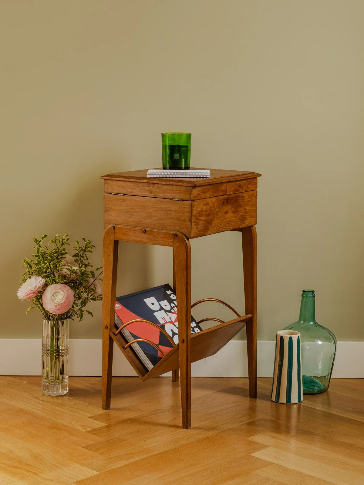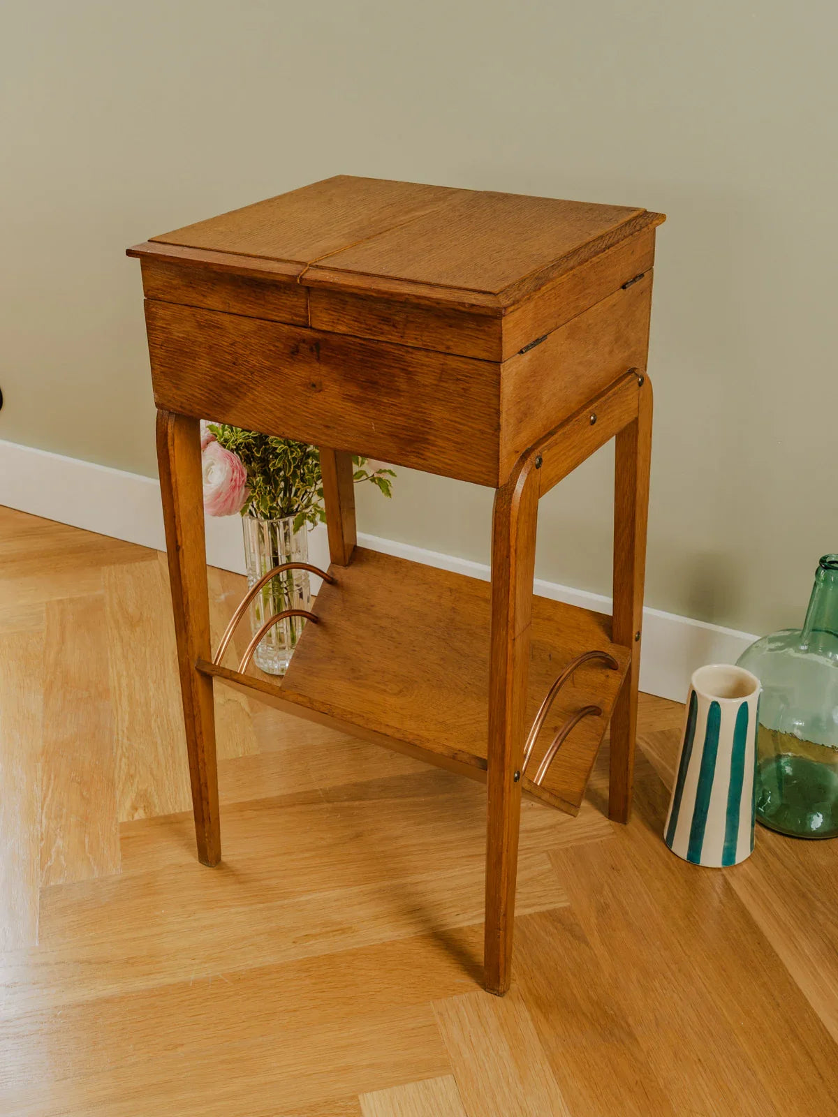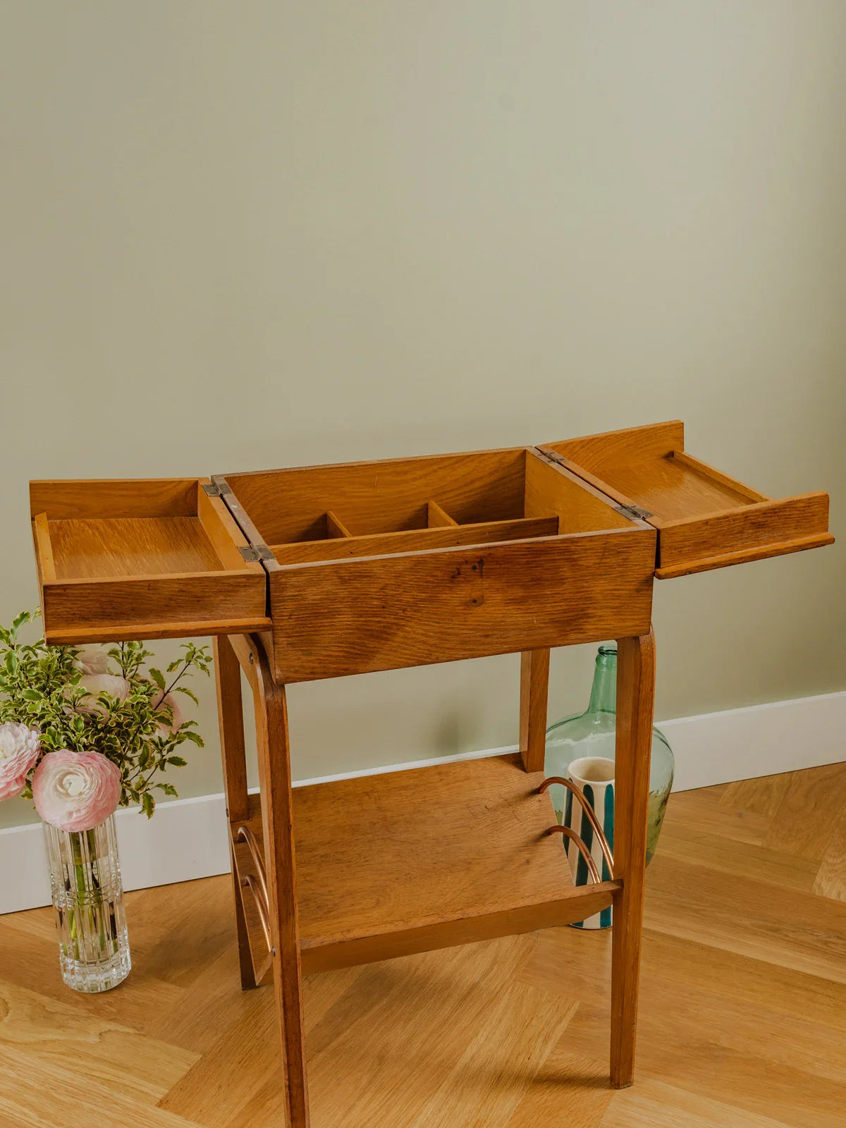 Embrace this charming vintage wooden sewing box, whose two sections open on either side to reveal a compartmentalized interior with seven drawers, ideal for storing threads, needles, and small accessories. Its integrated magazine rack, accented with gilded brass details, adds a touch of elegance and facilitates organization while highlighting a refined and functional style. Its modular design allows it to fit naturally into a craft corner or a cozy living room. Some signs of age are present.