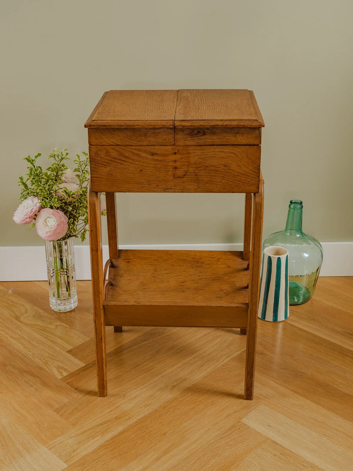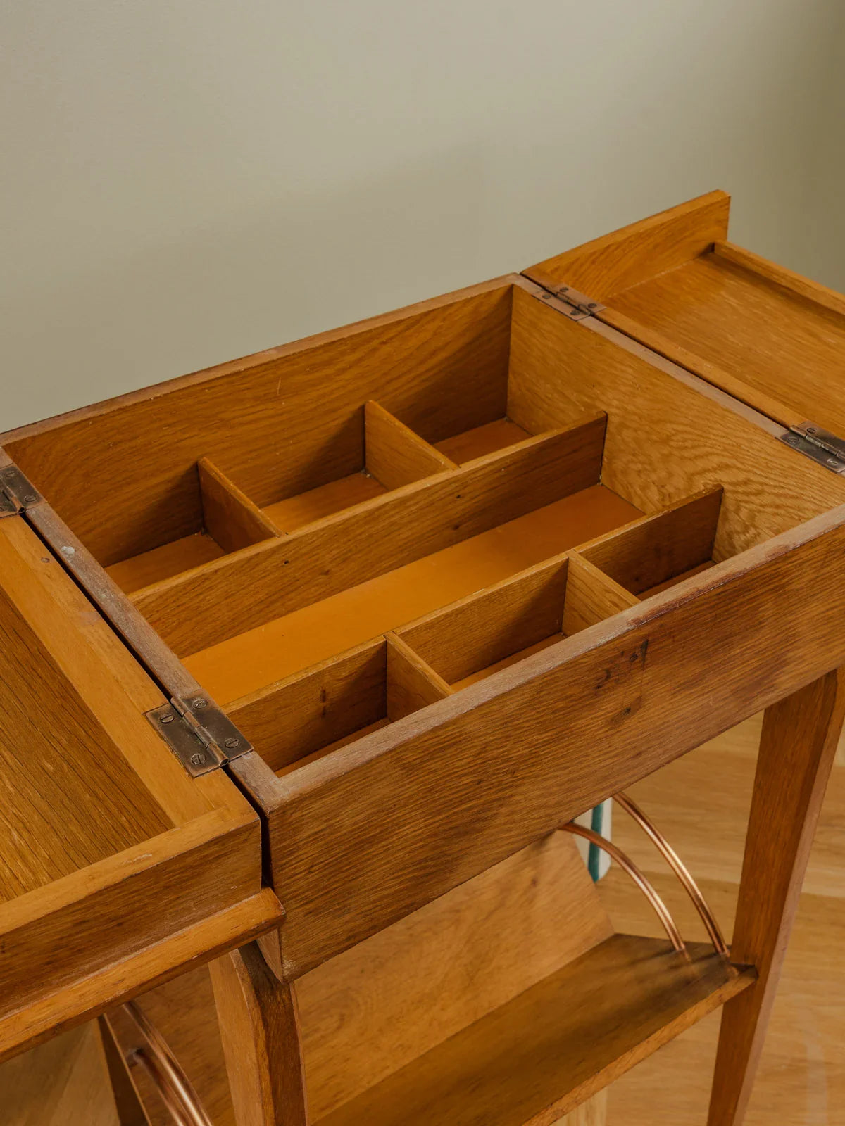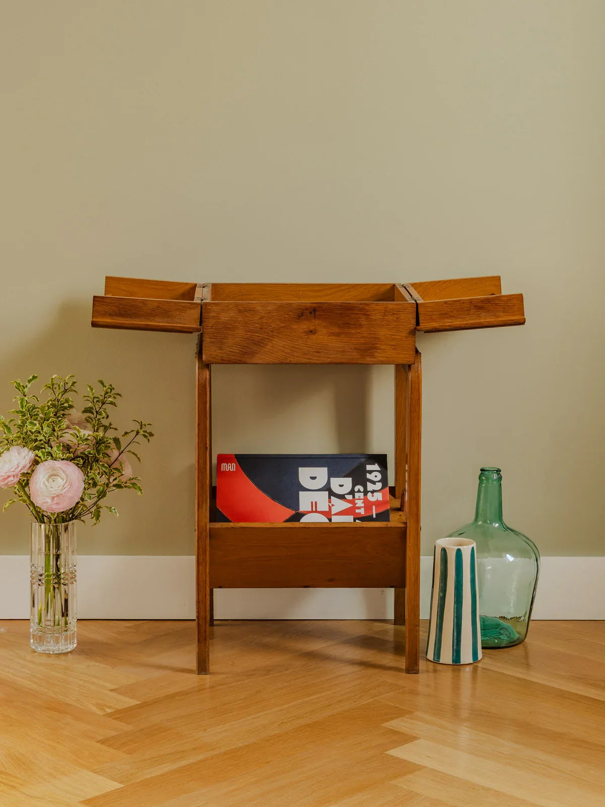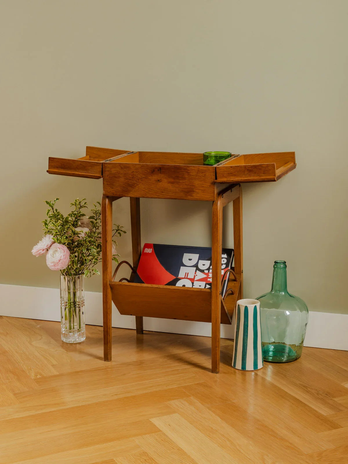 Embrace this charming vintage wooden sewing box, whose two sections open on either side to reveal a compartmentalized interior with seven drawers, ideal for storing threads, needles, and small accessories. Its integrated magazine rack, accented with gilded brass details, adds a touch of elegance and facilitates organization while highlighting a refined and functional style. Its modular design allows it to fit naturally into a craft corner or a cozy living room. Some signs of age are present.