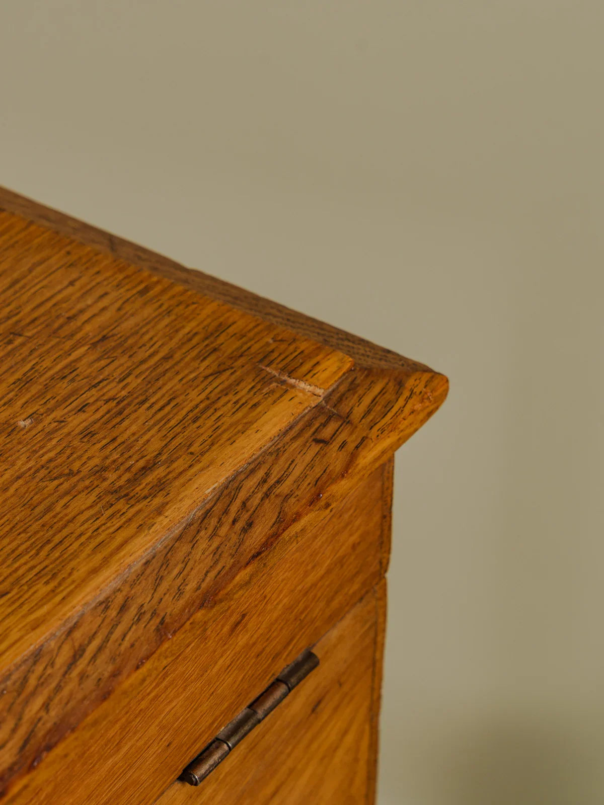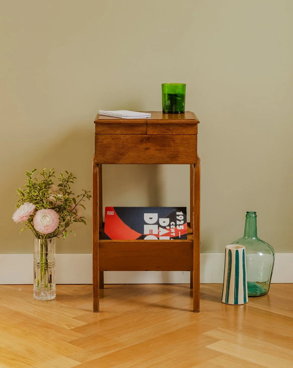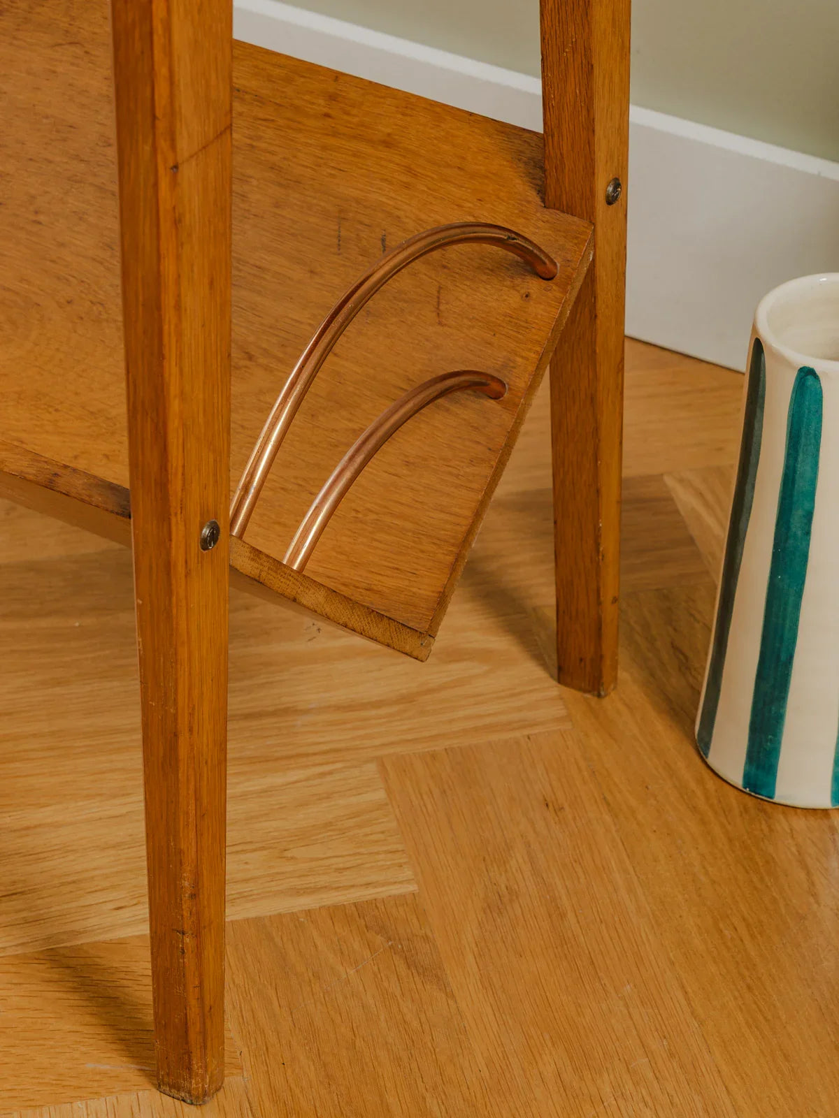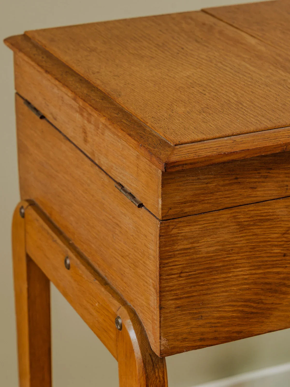 Embrace this charming vintage wooden sewing box, whose two sections open on either side to reveal a compartmentalized interior with seven drawers, ideal for storing threads, needles, and small accessories. Its integrated magazine rack, accented with gilded brass details, adds a touch of elegance and facilitates organization while highlighting a refined and functional style. Its modular design allows it to fit naturally into a craft corner or a cozy living room. Some signs of age are present.