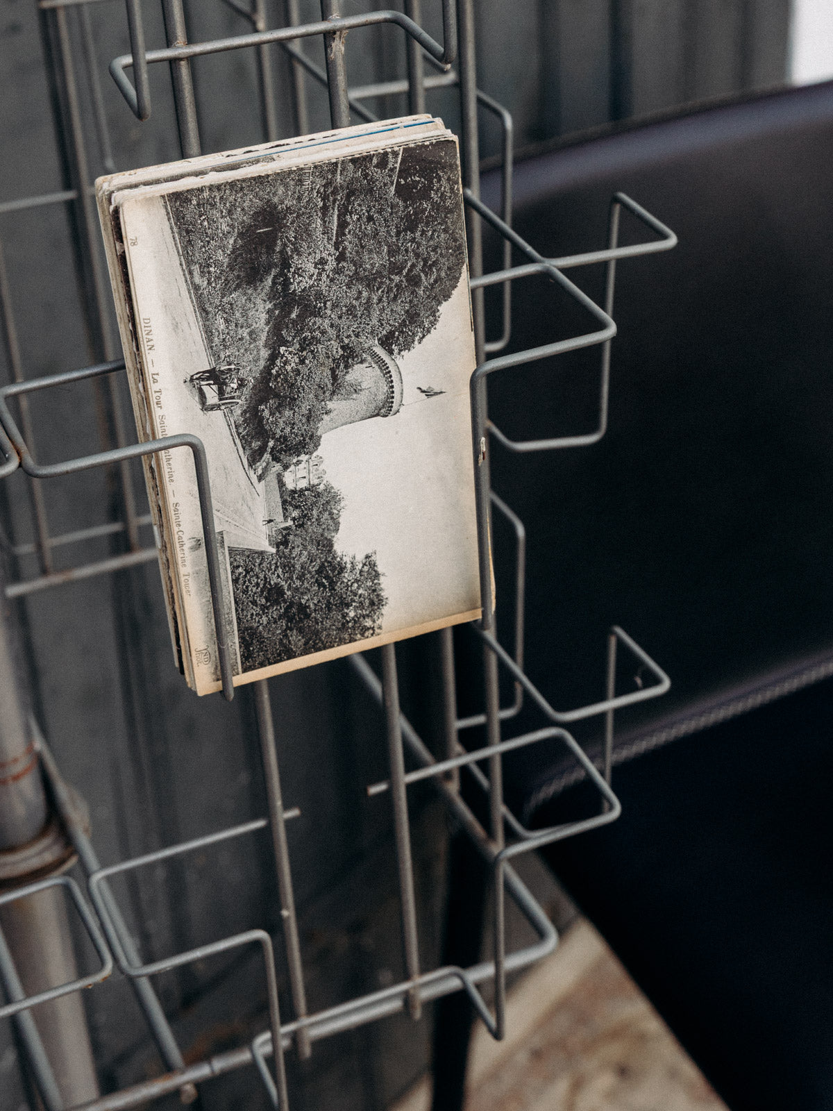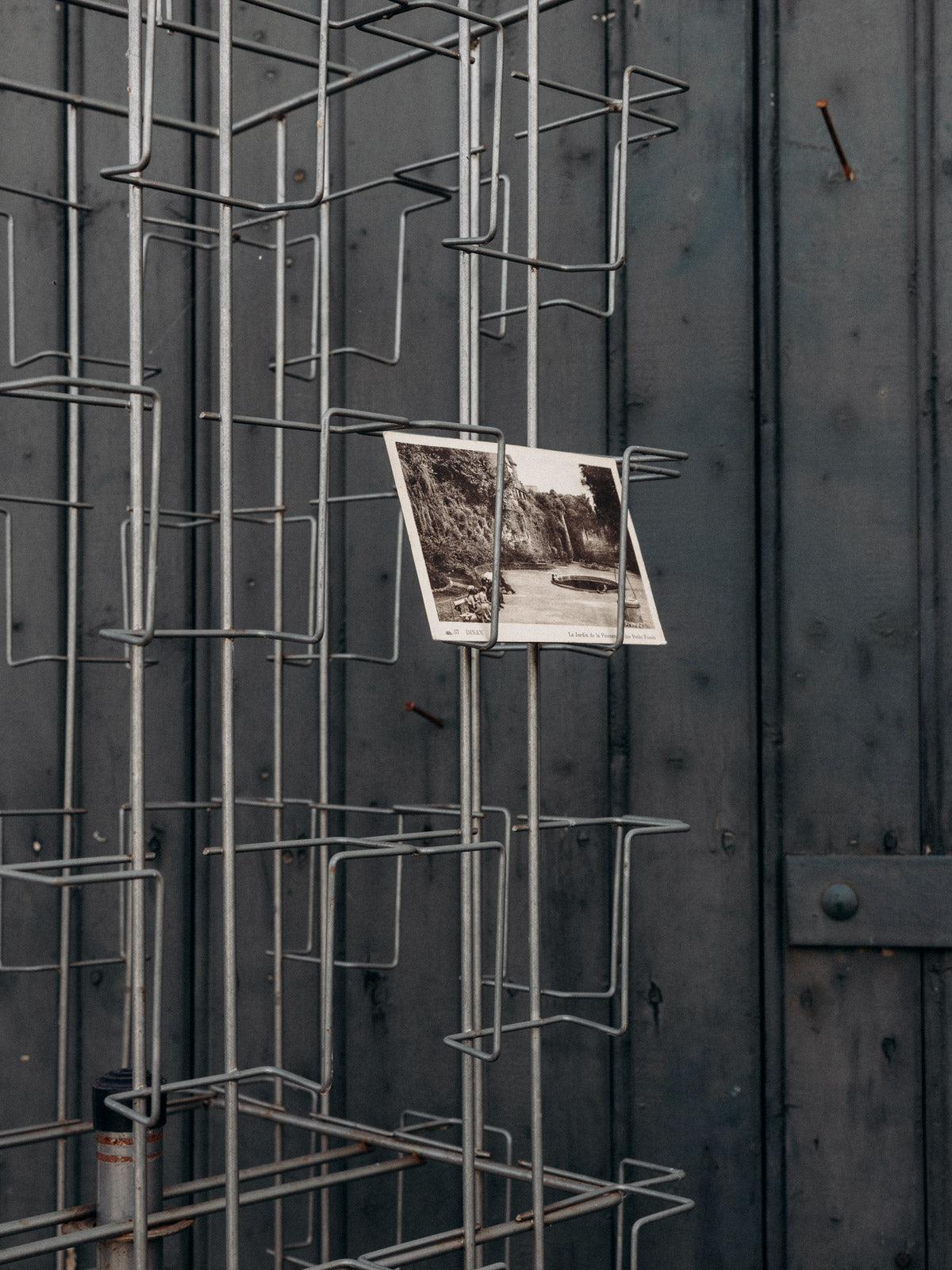Add a vintage touch to your decor with this gray metal postcard rack, cleverly designed on casters for easy mobility. Each piece features traces of time, including photographed rust, which gives it a special charm. Ideal for displaying your favorite postcards, this rack combines functionality and aesthetics, making it a must-have accessory for lovers of nostalgia and contemporary design.