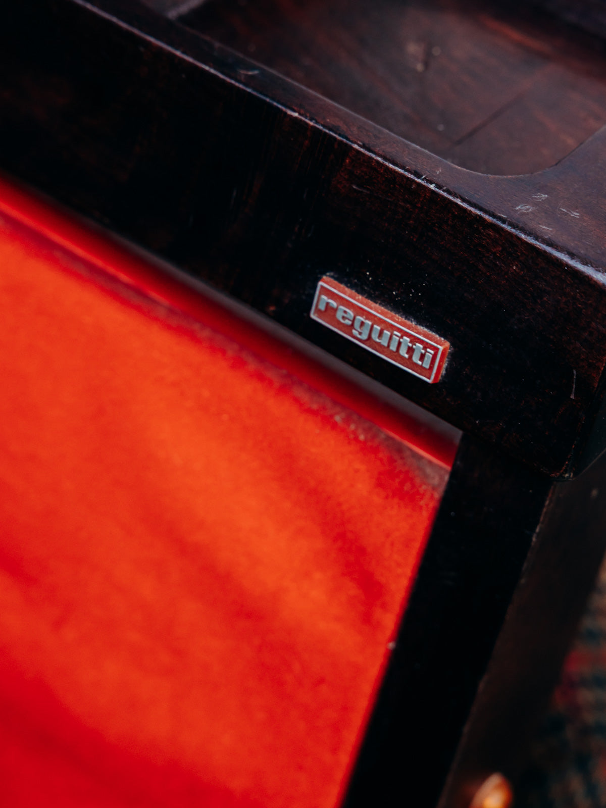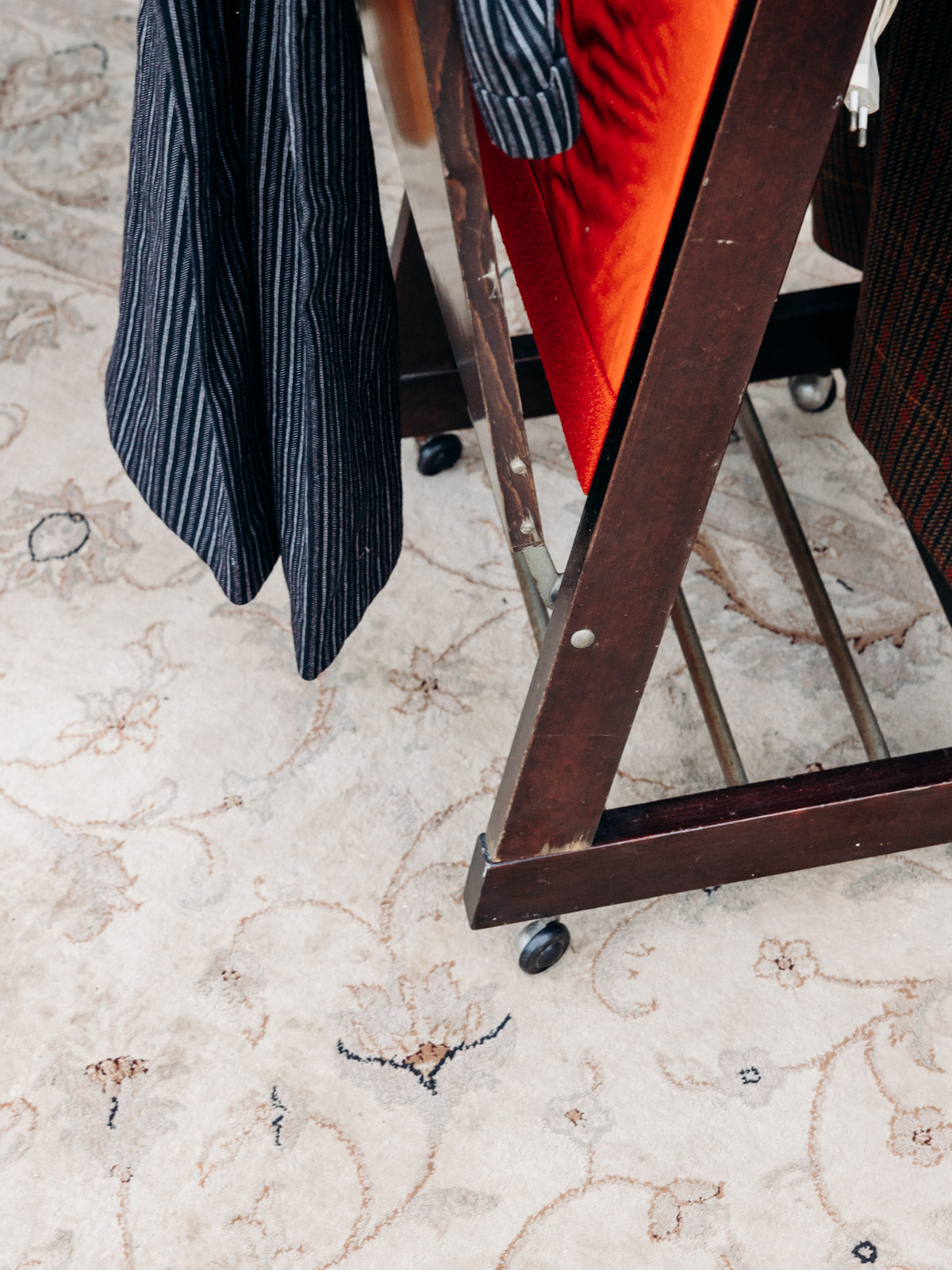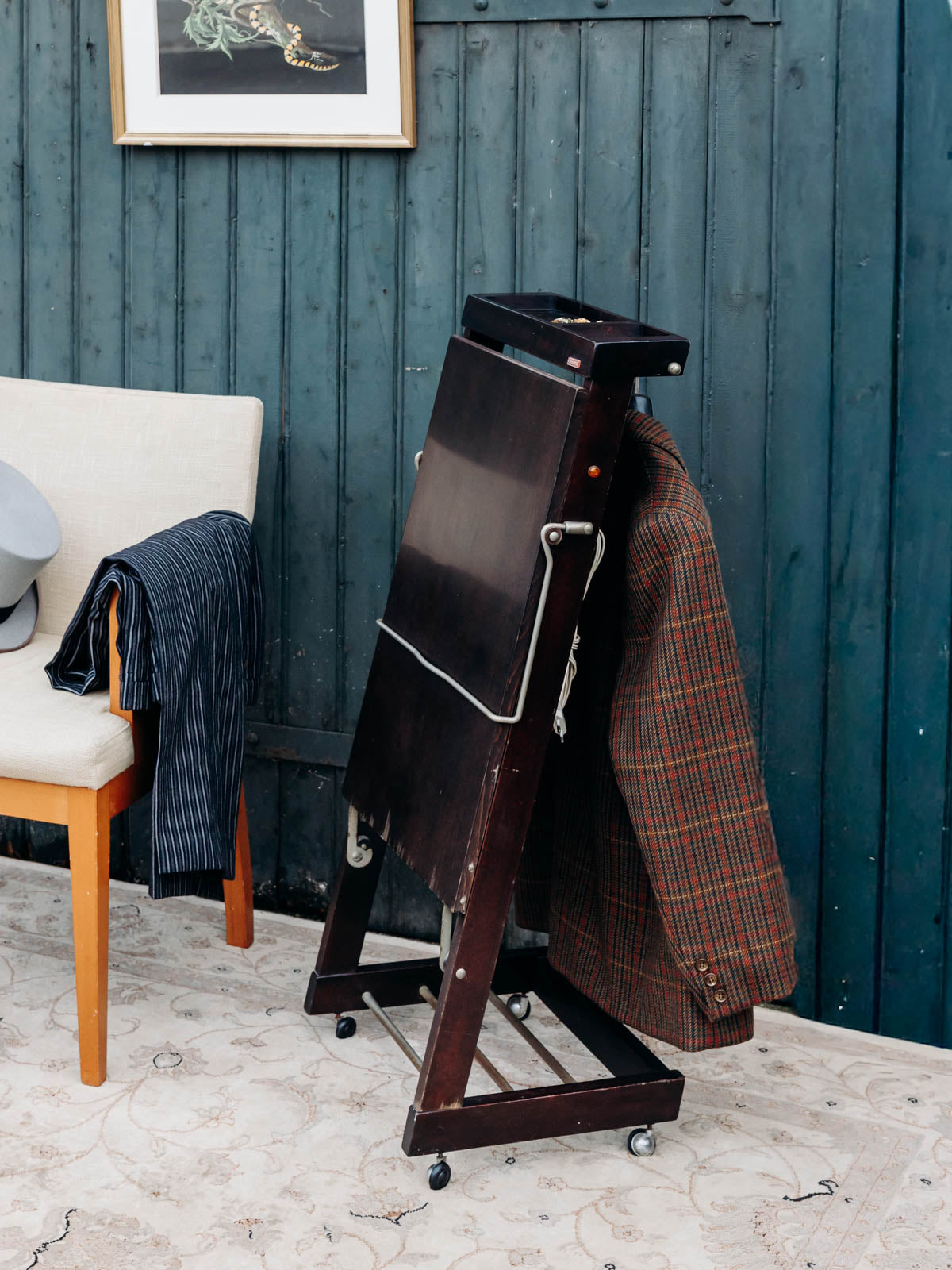 Discover this dark wood heated valet stand, which combines a sleek silhouette with discreet warmth to care for your clothes. Upholstered in red fabric, it enhances the look of your garments while preparing shirts and jackets for the day; its compact profile and generous height make it suitable for both bedrooms and dressing rooms. Mounted on small casters, it can be easily moved as needed. Minor veneer imperfections and slight wear.